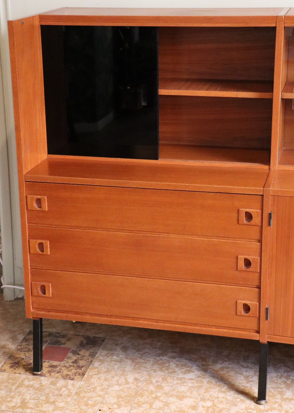 Le buffet est en placage de teck avec un piètement en métal laqué.
