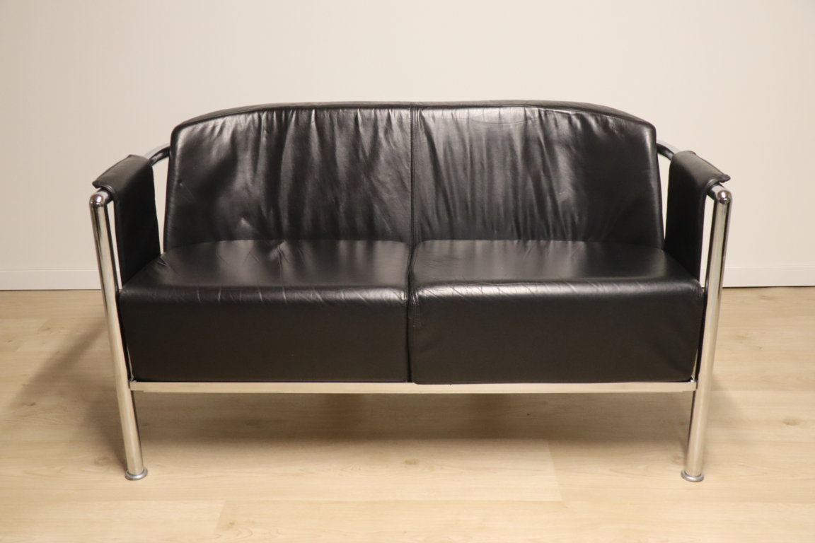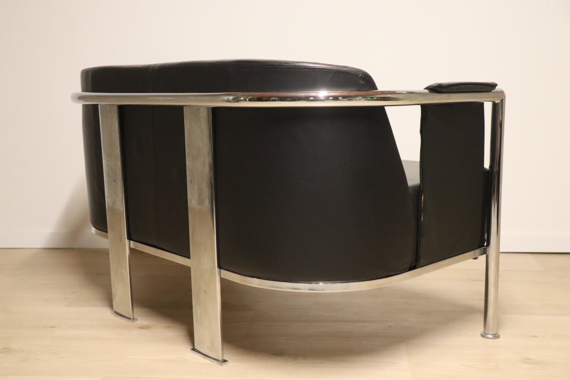 Les coussins sont revêtus d'un cuir synthétique noir. La structure est en métal chromé.