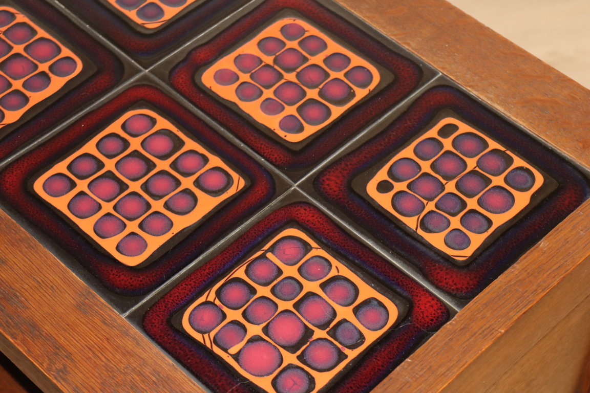 Parfaitement fonctionnelle, la structure est en chêne massif teinté et le plateau supérieur est composé de carreaux de céramique.