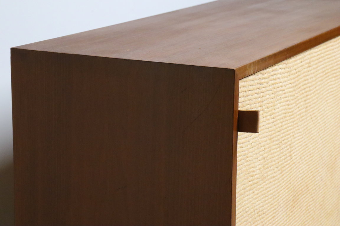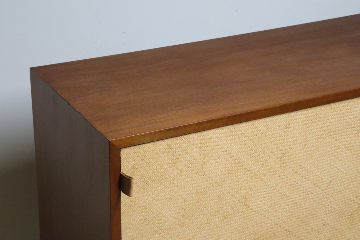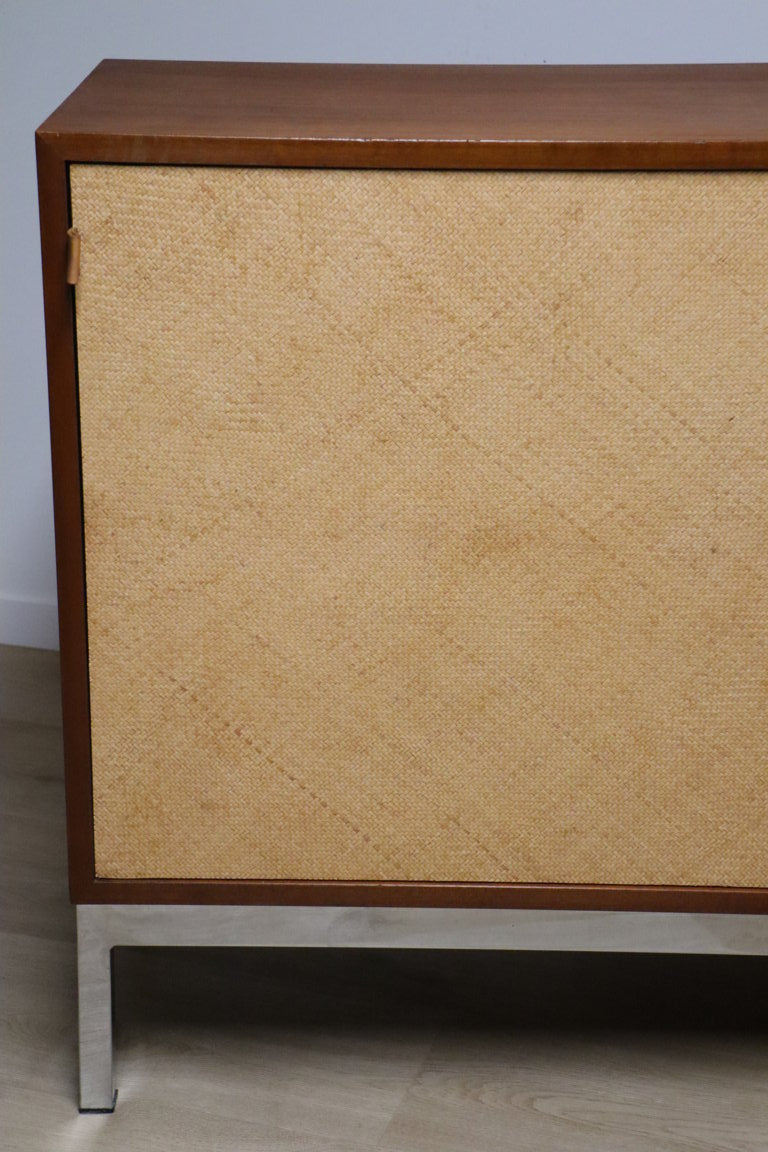 Réalisée en bois d'acajou sur un piètement en métal chromé ouvrant par deux portes coulissantes avec une finition en raphia naturel.
