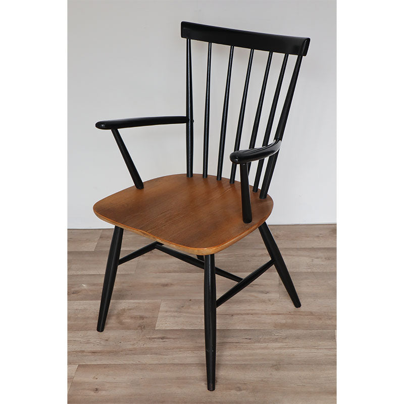 Assise en bois naturel. Piètement, dossier et accotoirs en bois teinté noir.