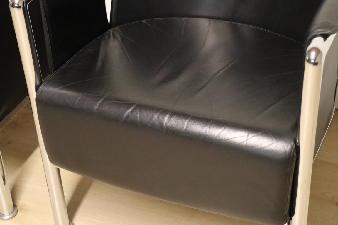 Les coussins sont revêtus d'un cuir synthétique noir. La structure est en métal chromé.