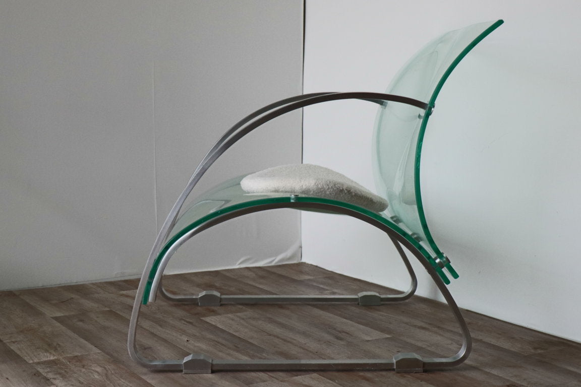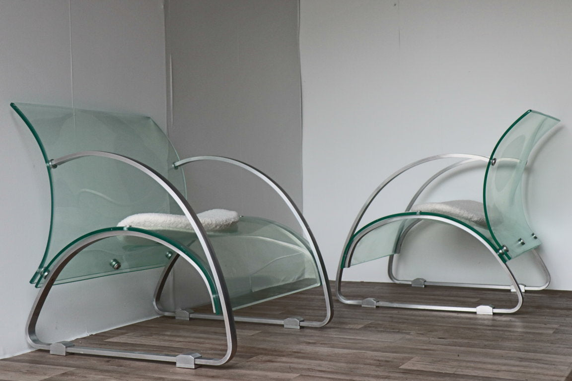Une structure en verre acrylique transparent sur une armature en acier brossé.