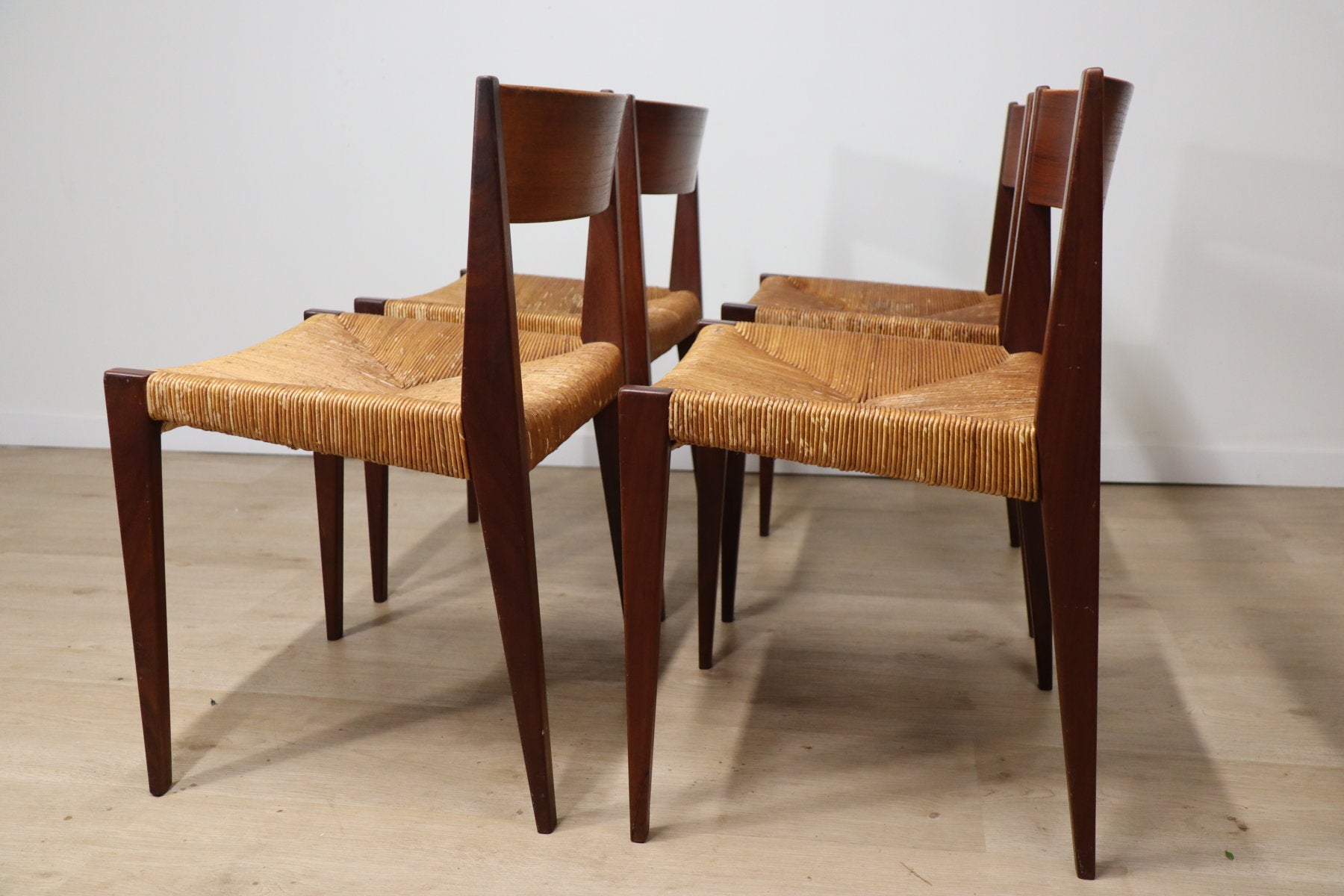 Série de 4 chaises scandinave dessinée par Poul Cadovius dans les années 60. Modèle "Pia" conçue en teck avec une assise en corde tressée.