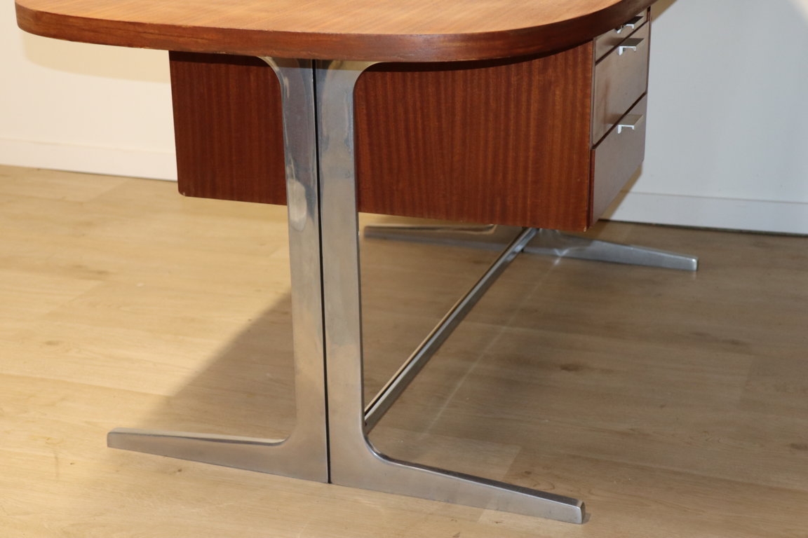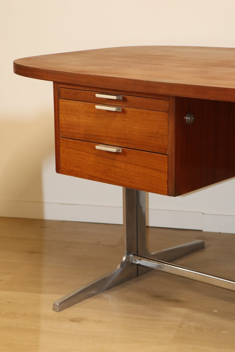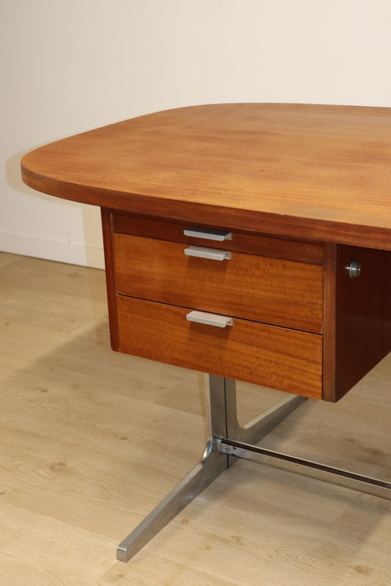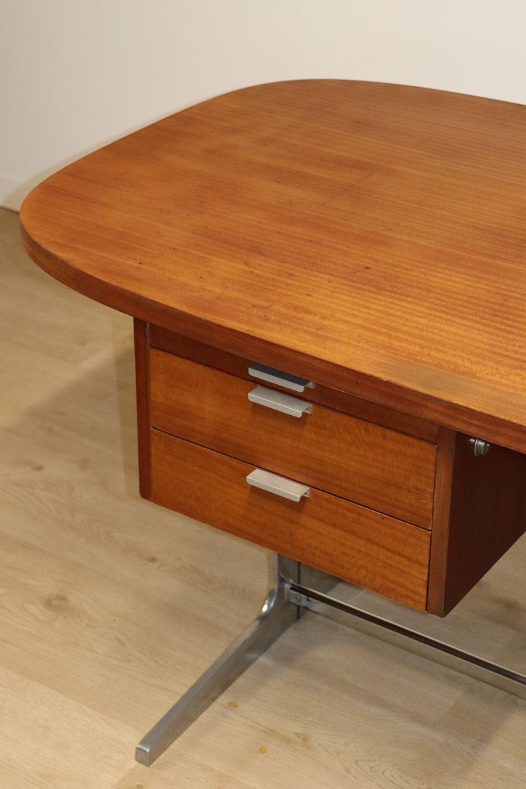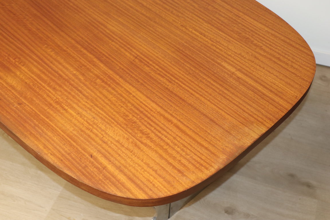 Un large plateau en acajou sipo aux courbes arrondies reposant sur un piètement en fonte d’aluminium brossé.
