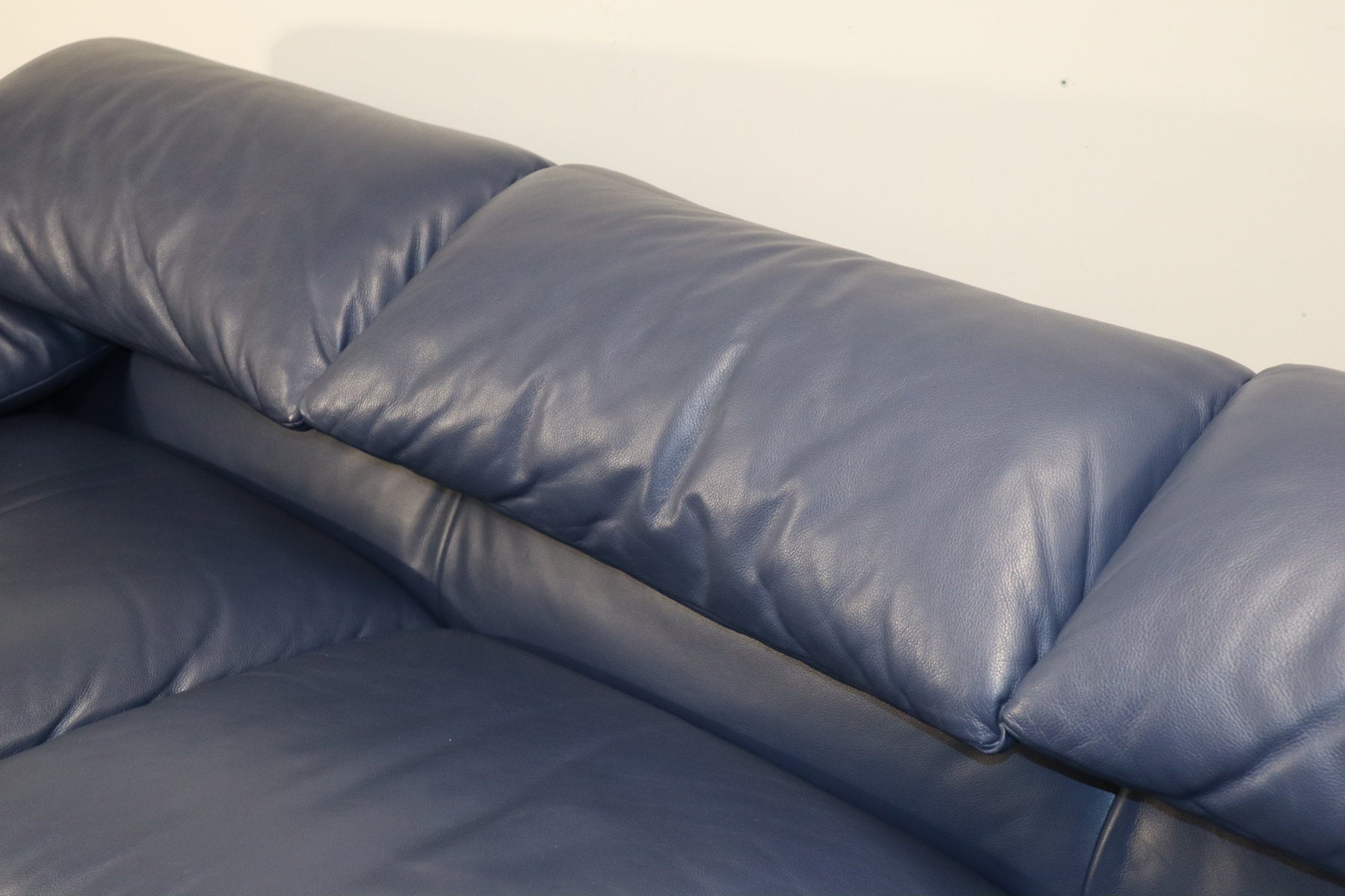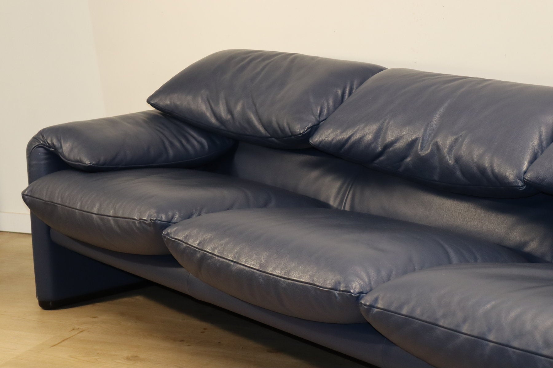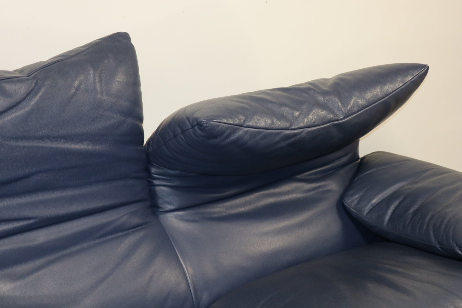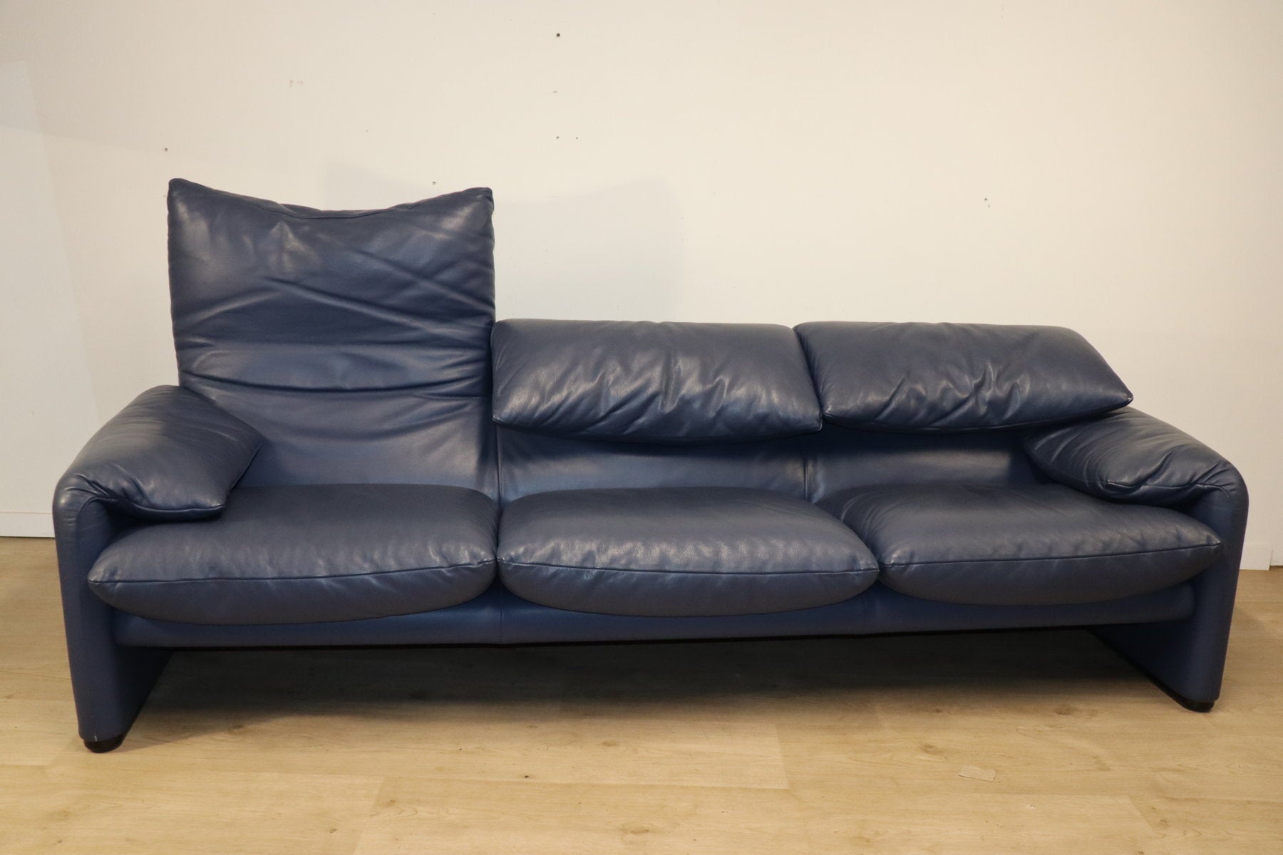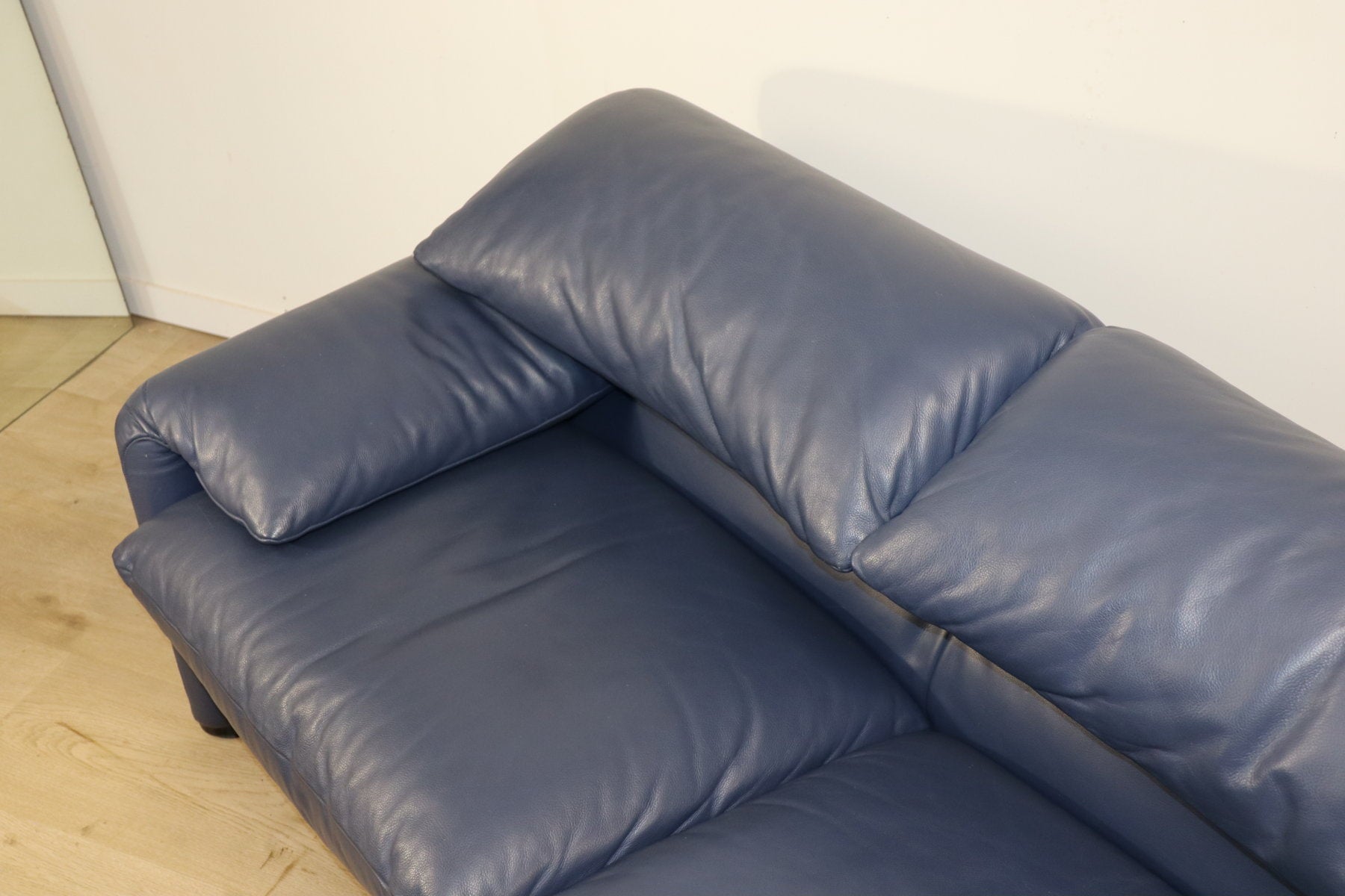 Revêtu d’un cuir bleu profond, il affiche une allure à la fois élégante et contemporaine. Ses appuie-têtes ajustables, véritable signature du modèle, permettent de moduler l’assise selon l’envie — détente ou maintien optimal.