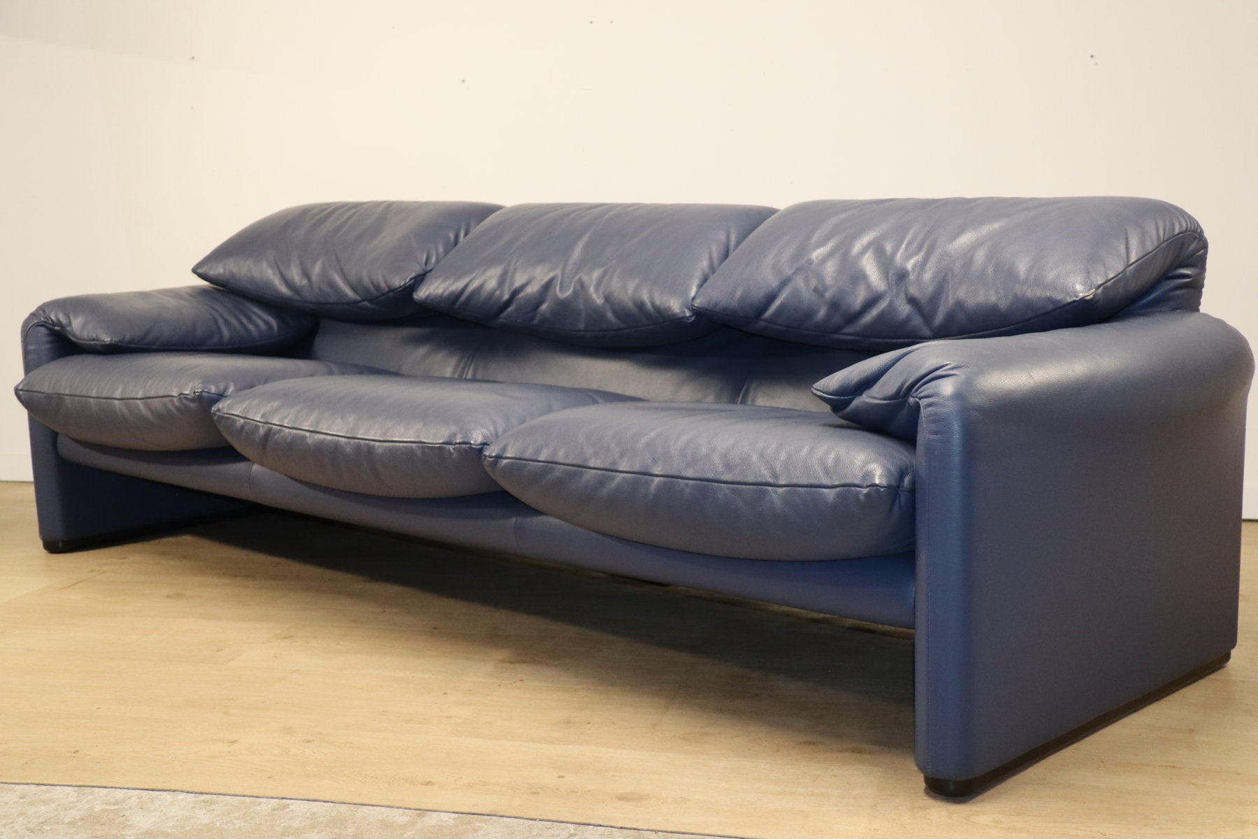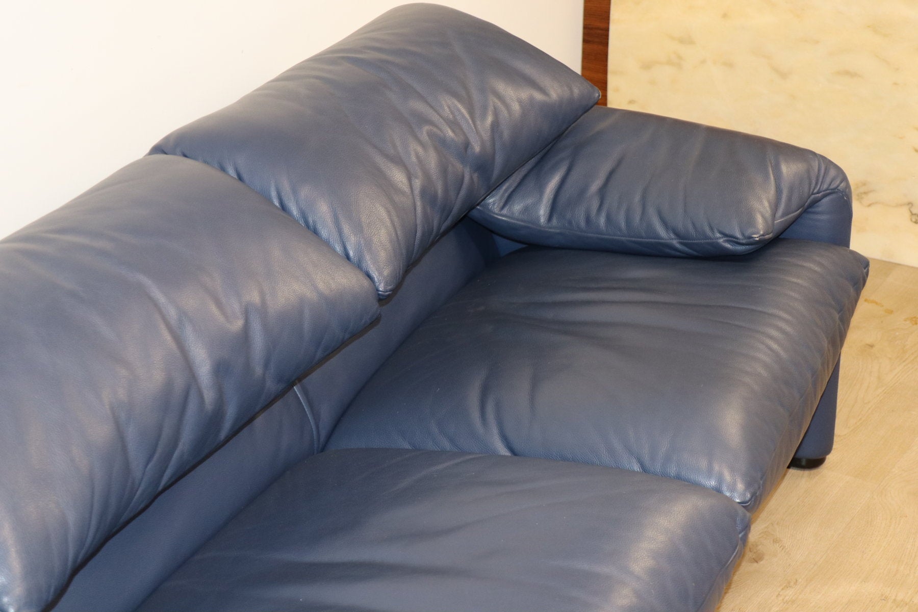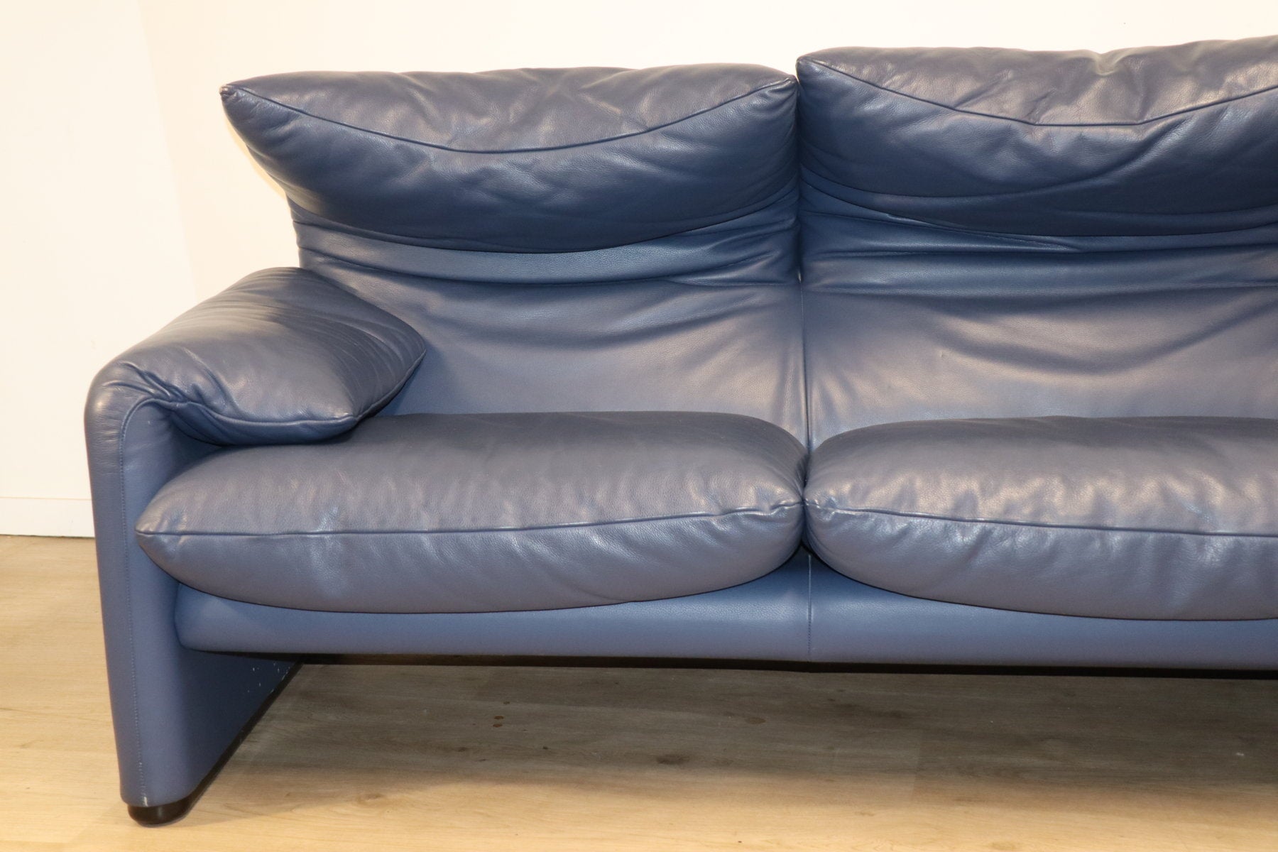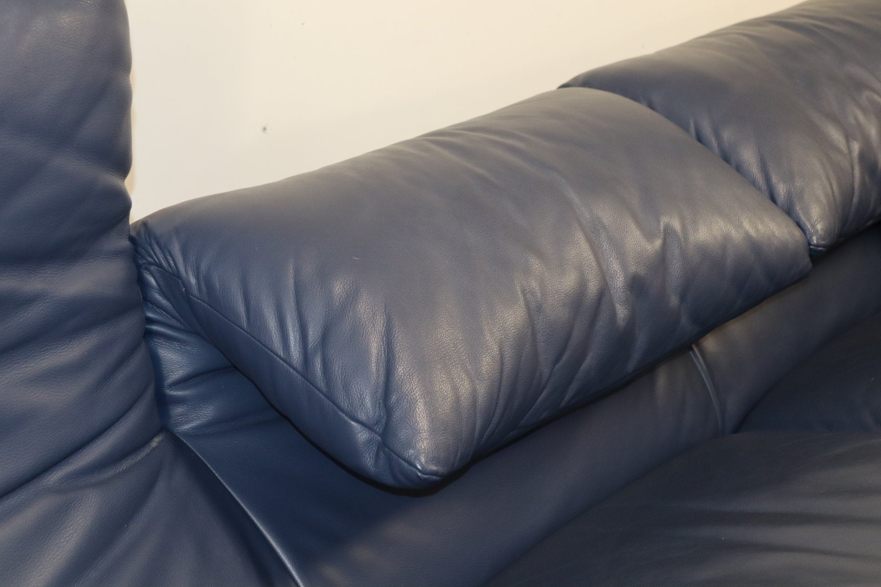 Revêtu d’un cuir bleu profond, il affiche une allure à la fois élégante et contemporaine. Ses appuie-têtes ajustables, véritable signature du modèle, permettent de moduler l’assise selon l’envie — détente ou maintien optimal.