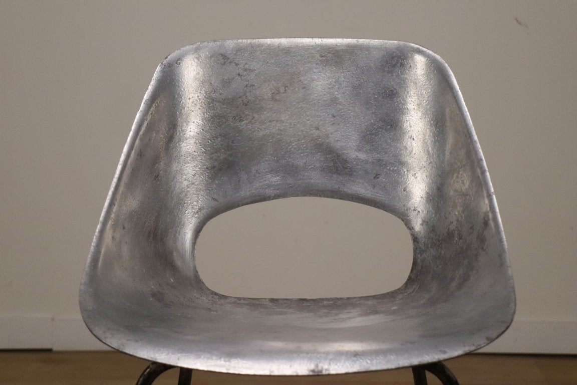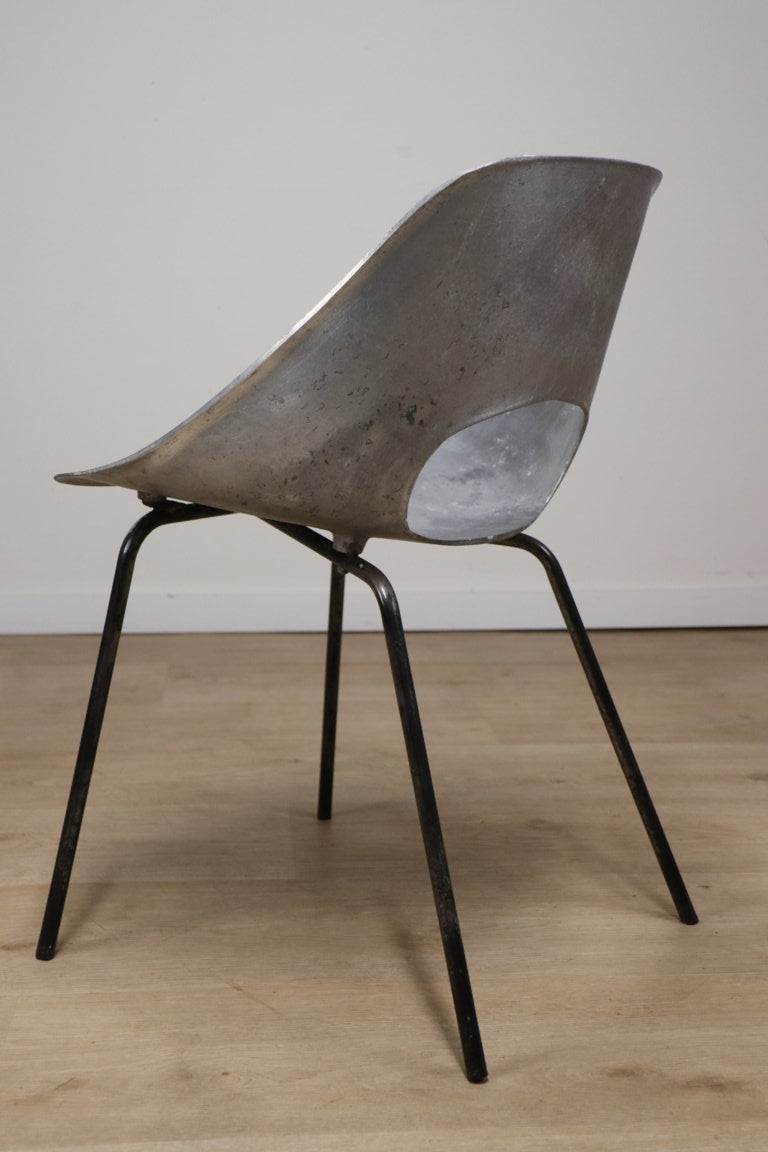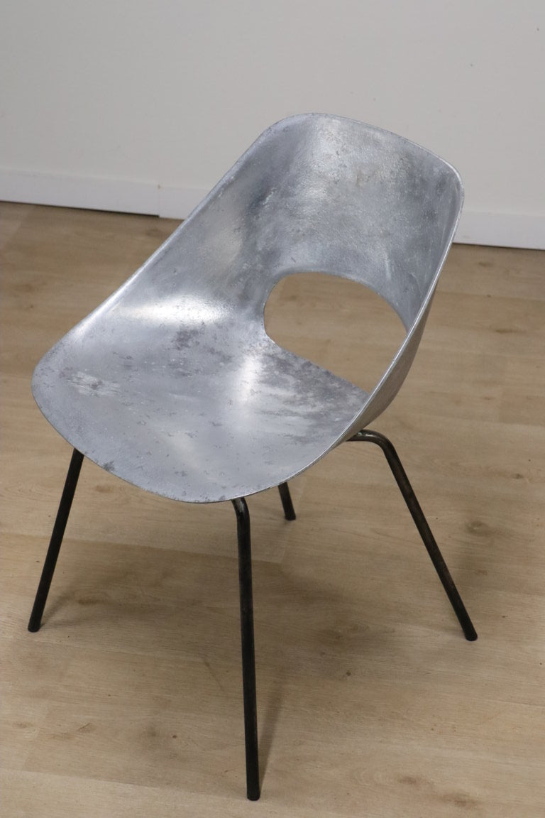 Chaise modèle "tulipe" de Pierre Guariche à coque d'assise ajouré en fonte d'aluminium sur un piètement en métal tubulaire laqué noir.