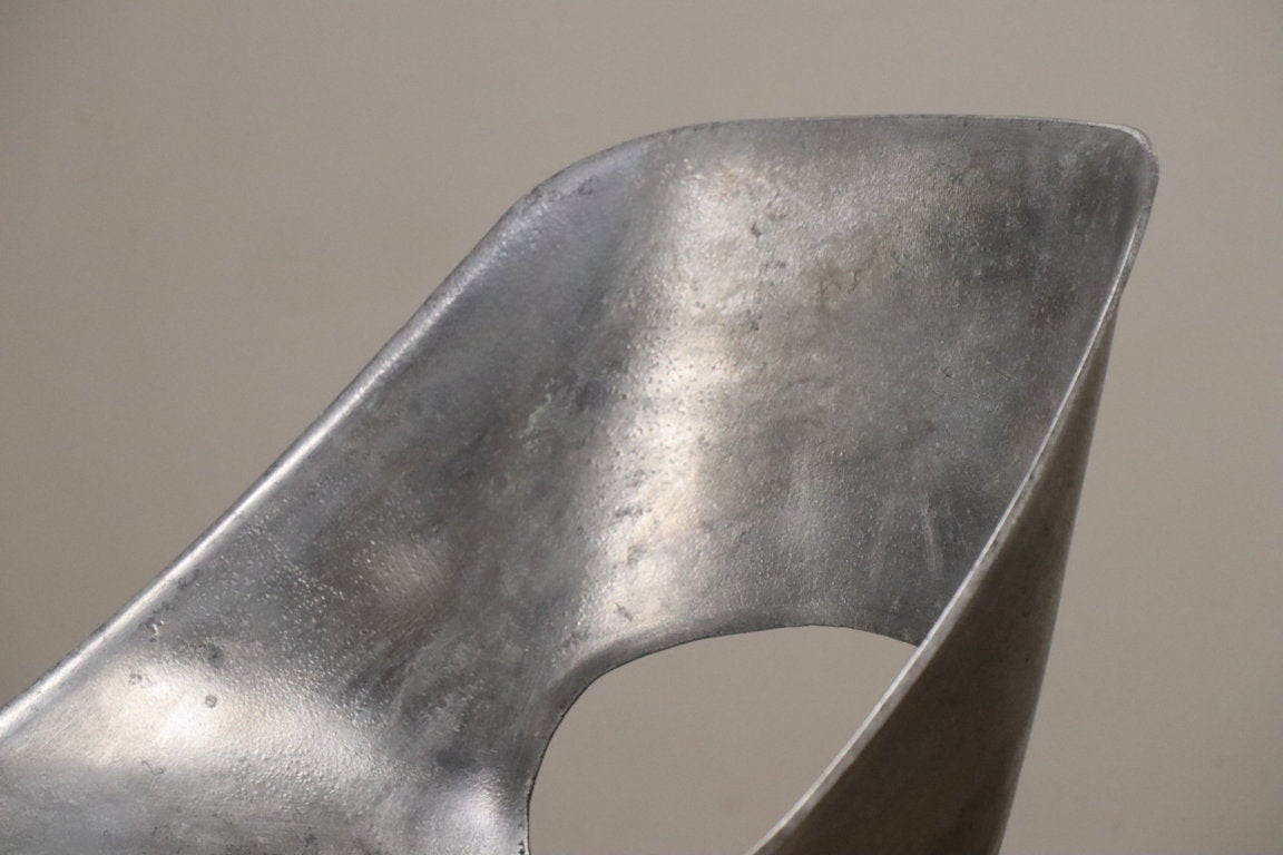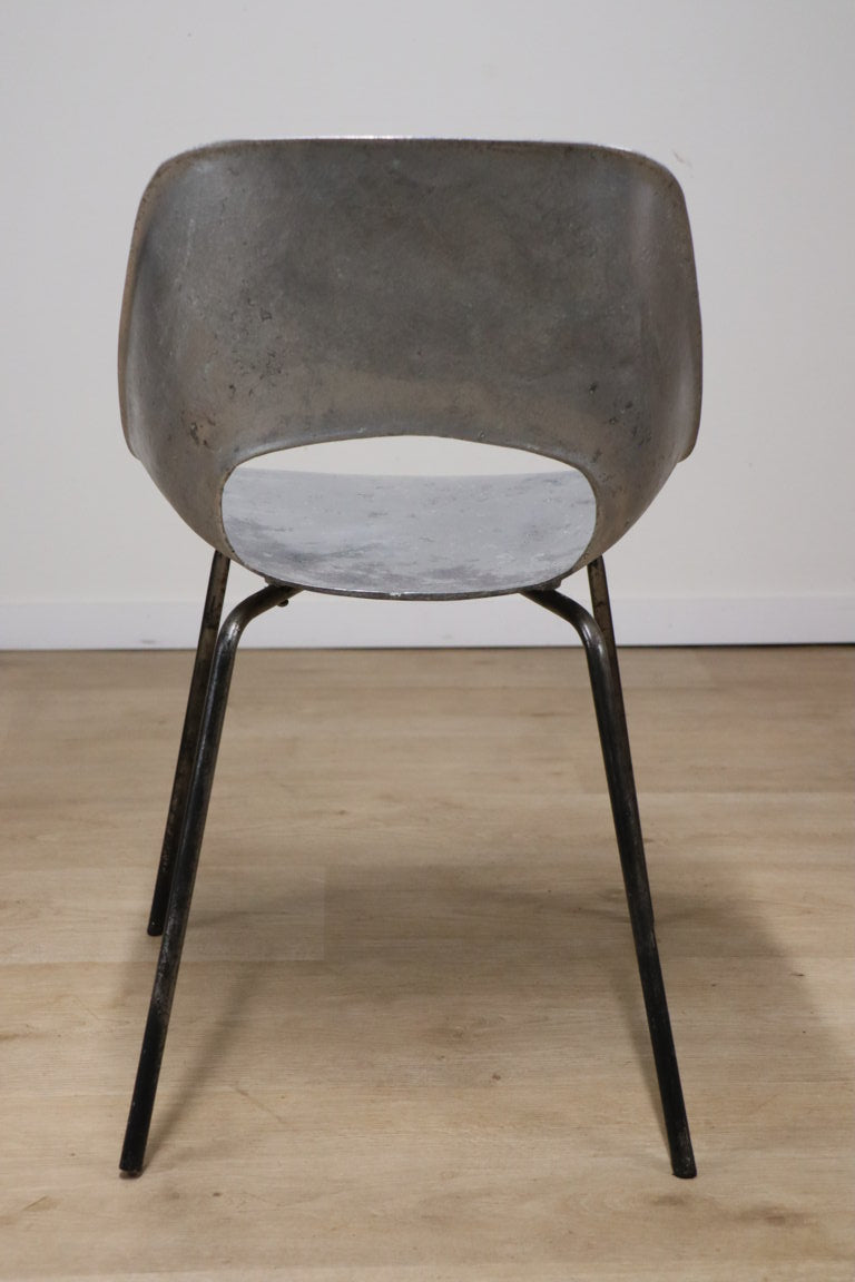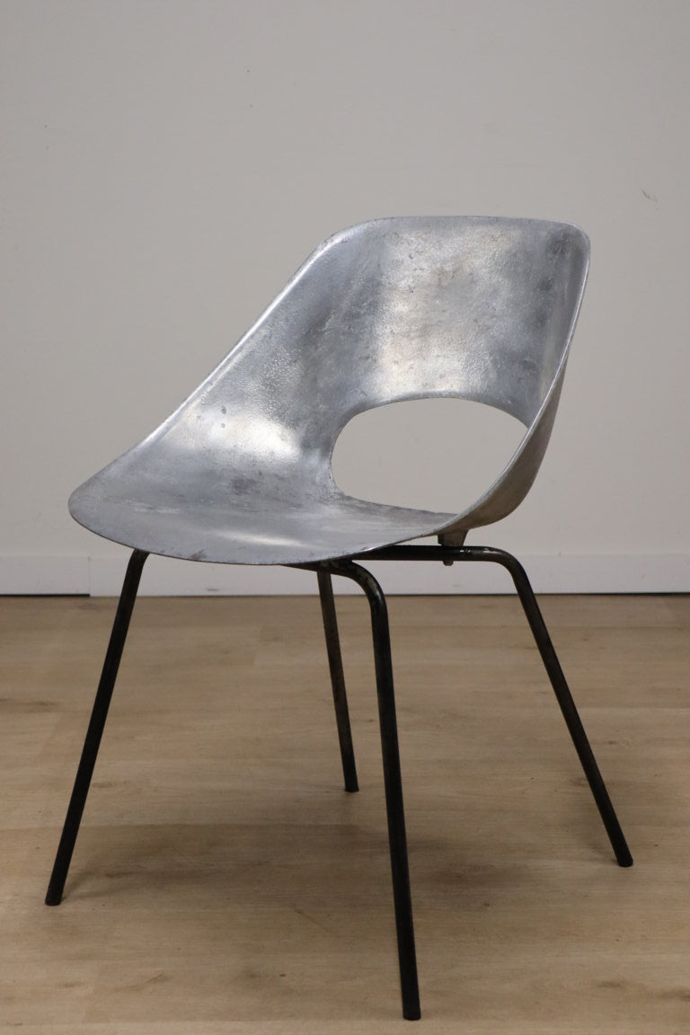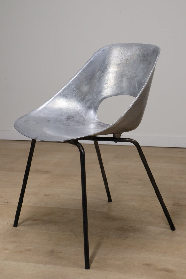 Chaise modèle "tulipe" de Pierre Guariche à coque d'assise ajouré en fonte d'aluminium sur un piètement en métal tubulaire laqué noir.