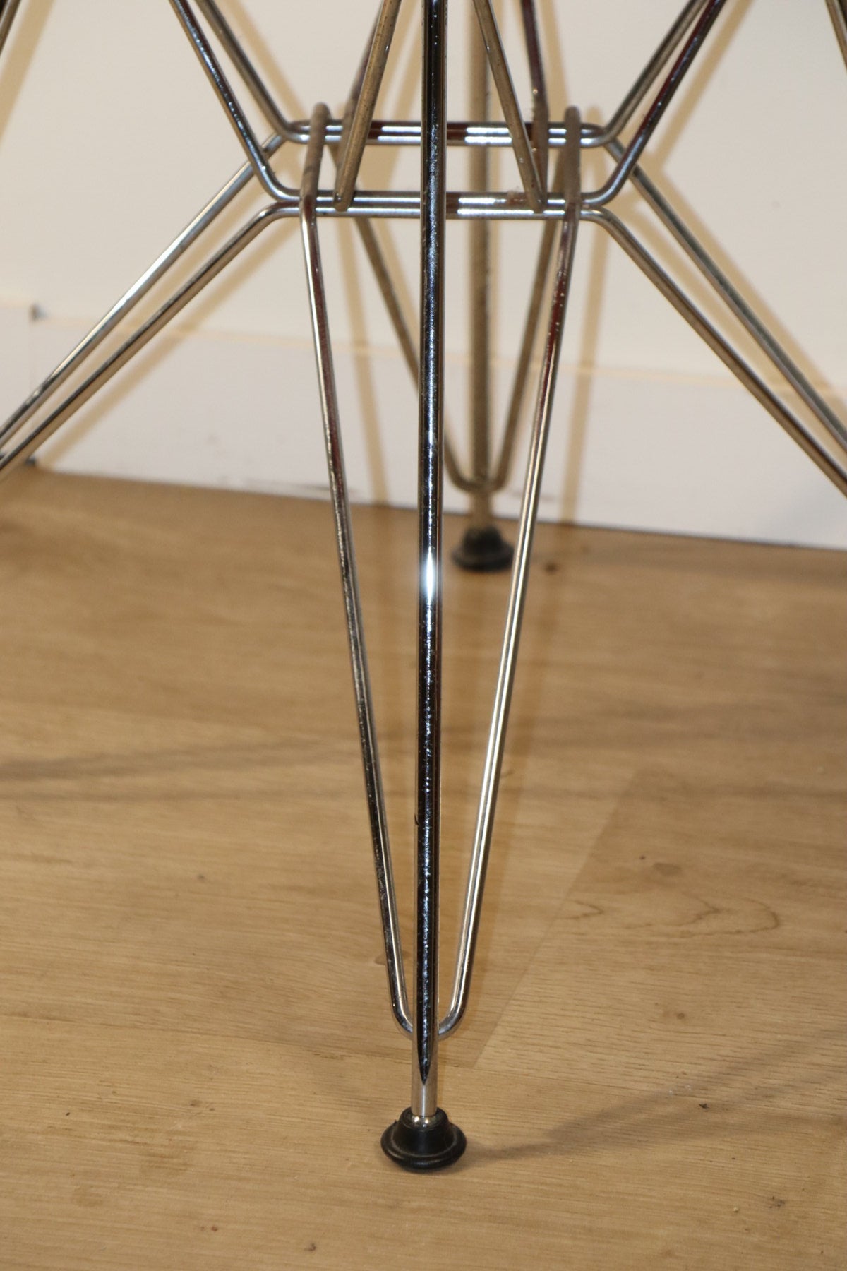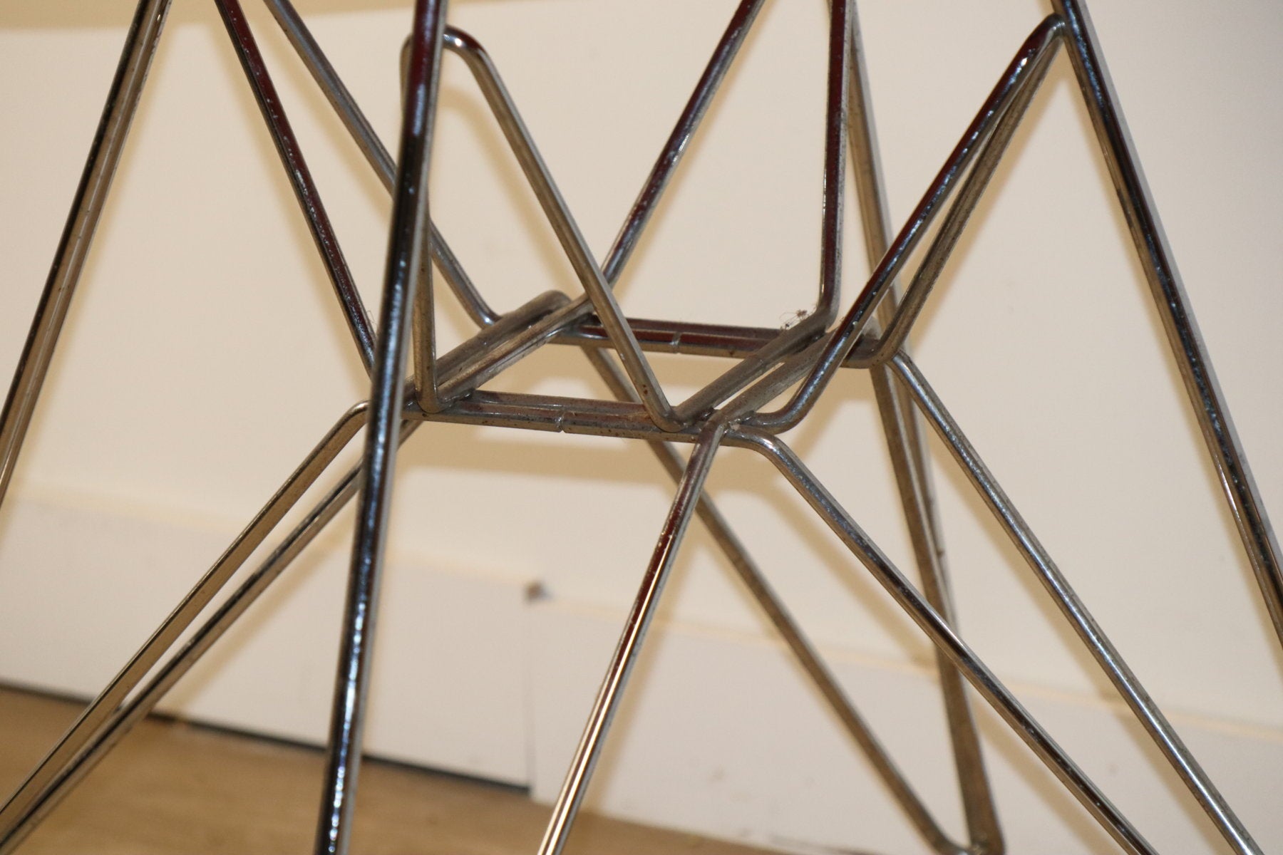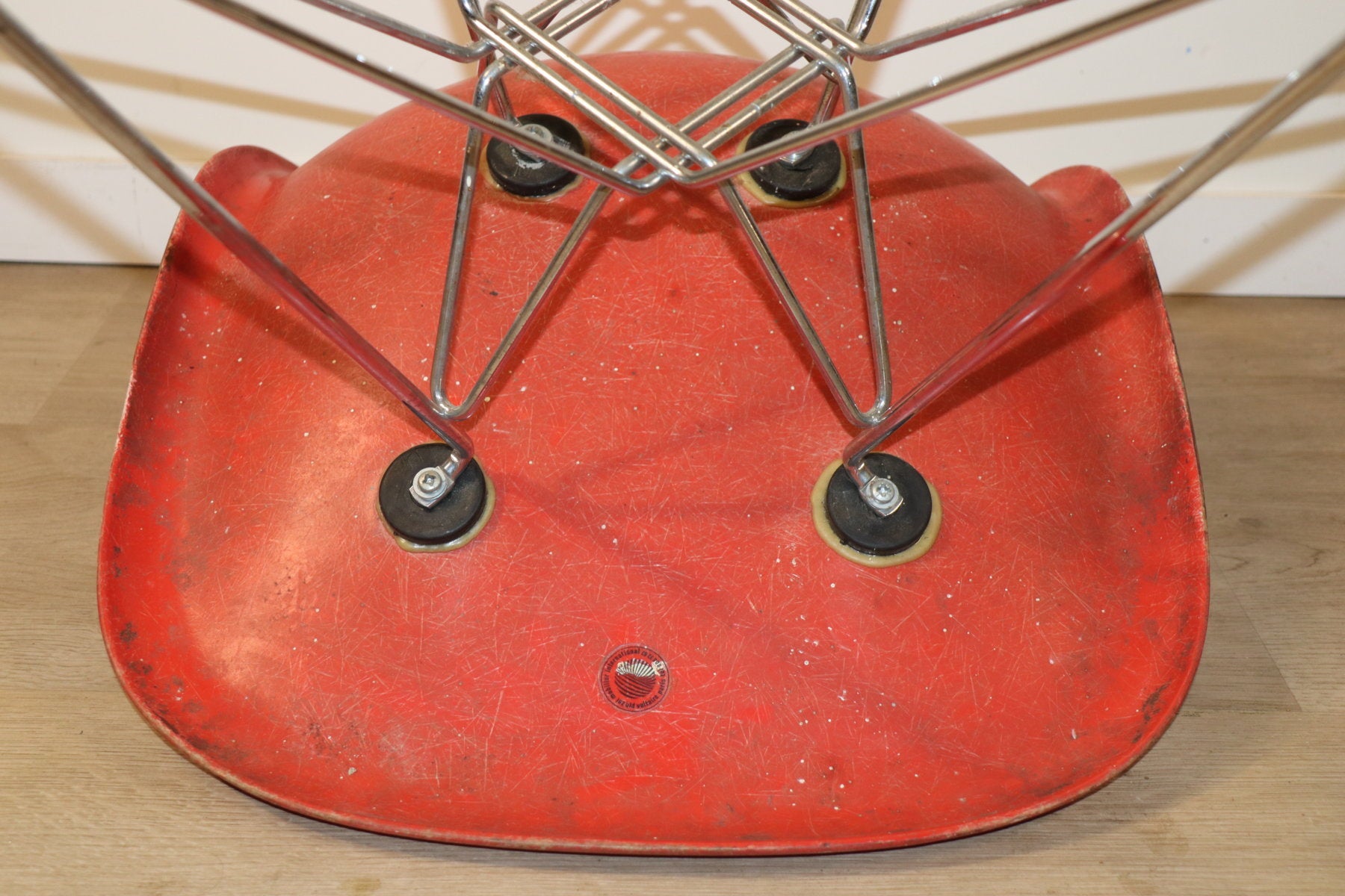 Chaise modèle "DSR" conçue par Charles & Ray Eames et éditée par Herman Miller dans les années 60. Une véritable icône du design du XXe siècle avec son piètement dit EIFFEL en métal chromé et sa coque en résine de fibre de verre rouge !