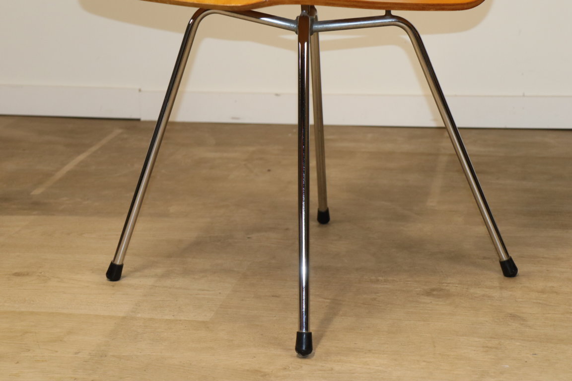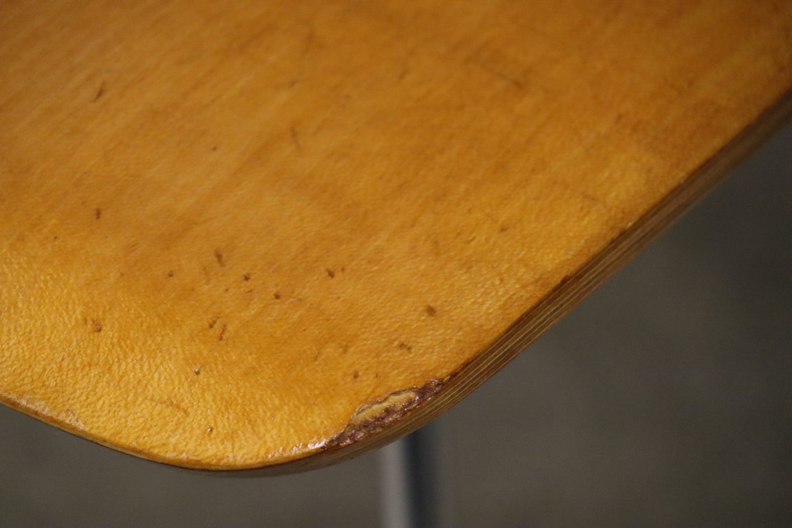 Conçue en hêtre contreplaqué sur un piètement en métal chromé.