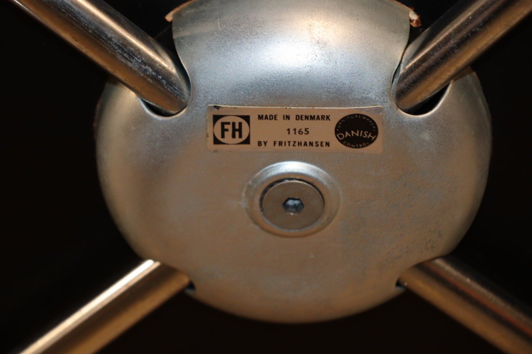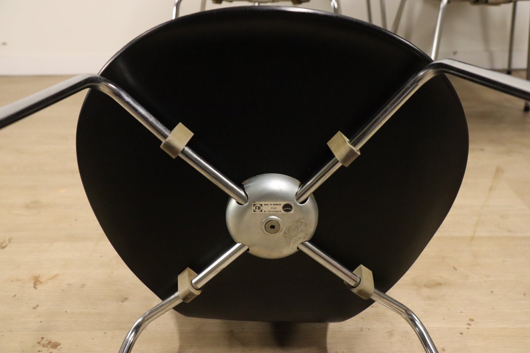 Les étiquettes Fritz Hansen d’origine sont présentes sous les assises, attestant de l’authenticité et de la période de production.