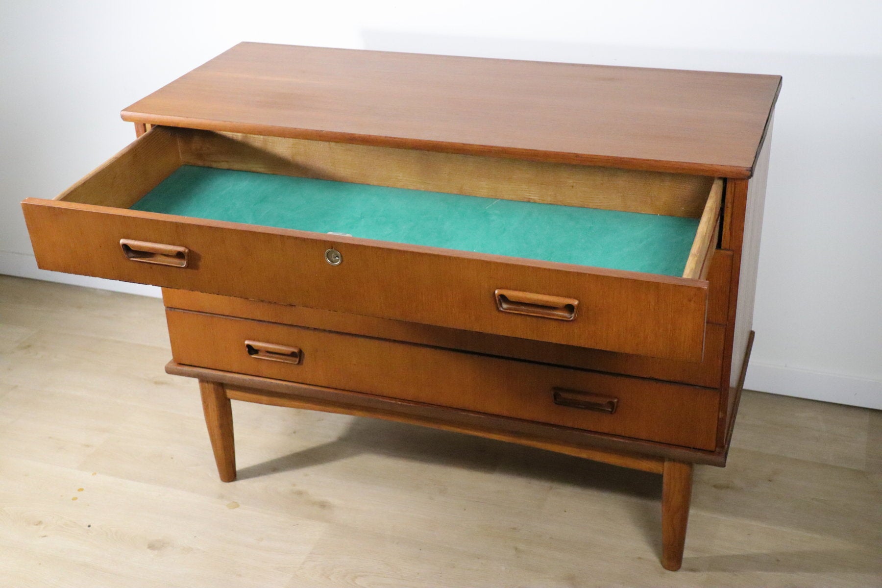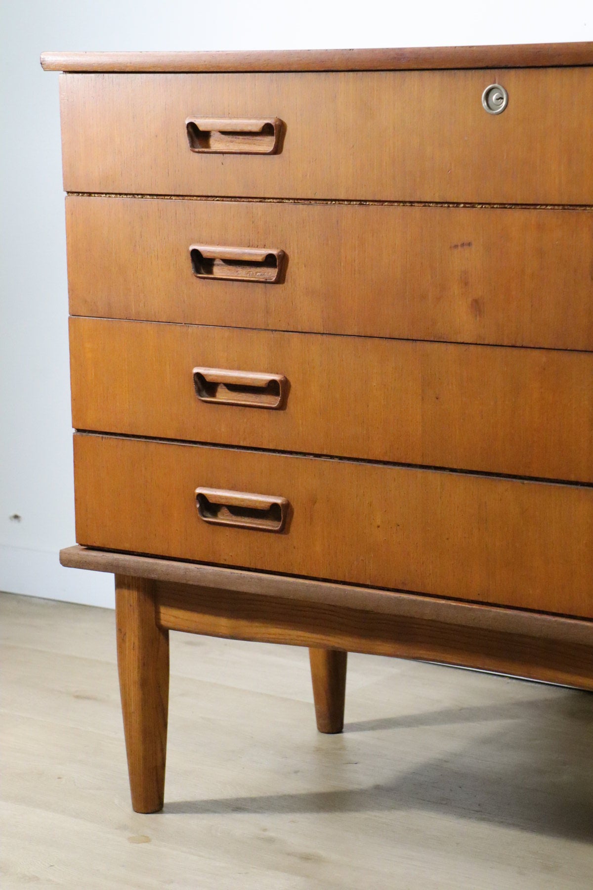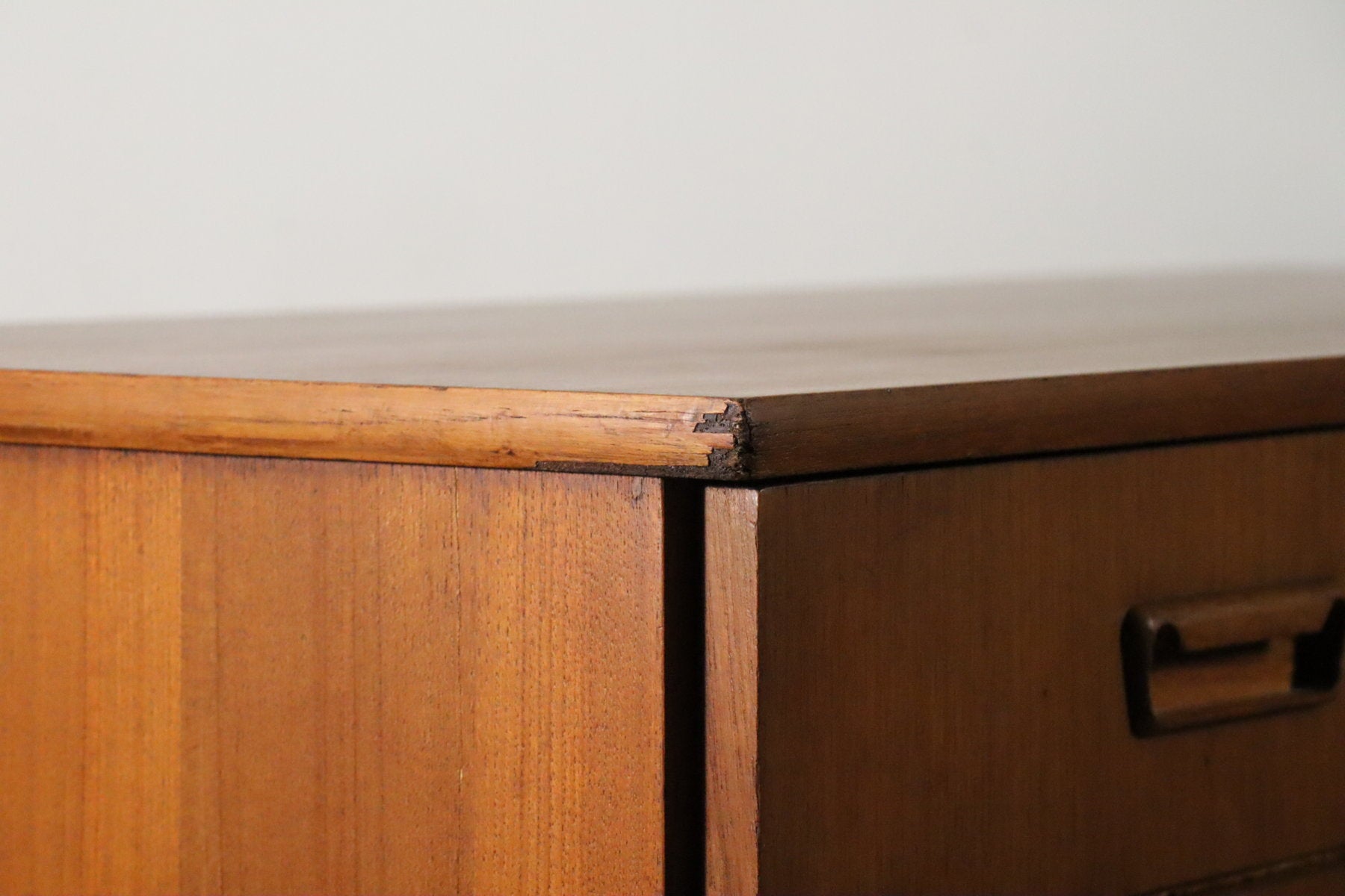 Commode scandinave en teck conçue dans les années 60. Une ligne légère et épurée avec ses poignées creusées.