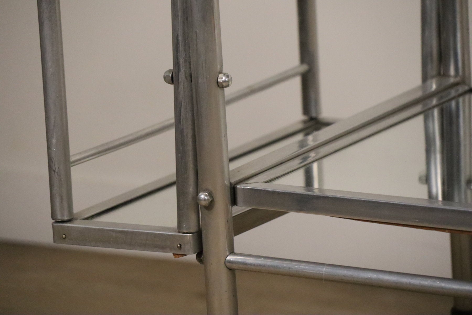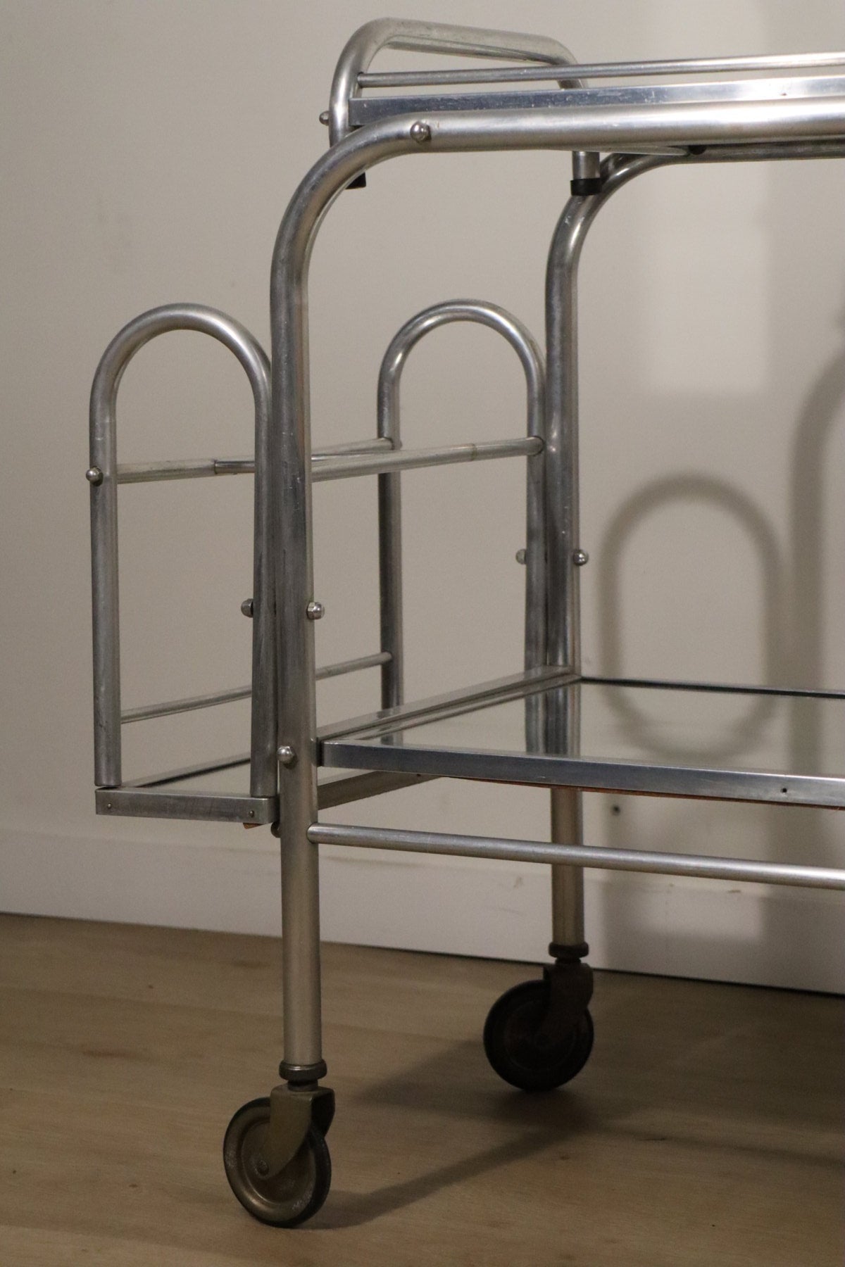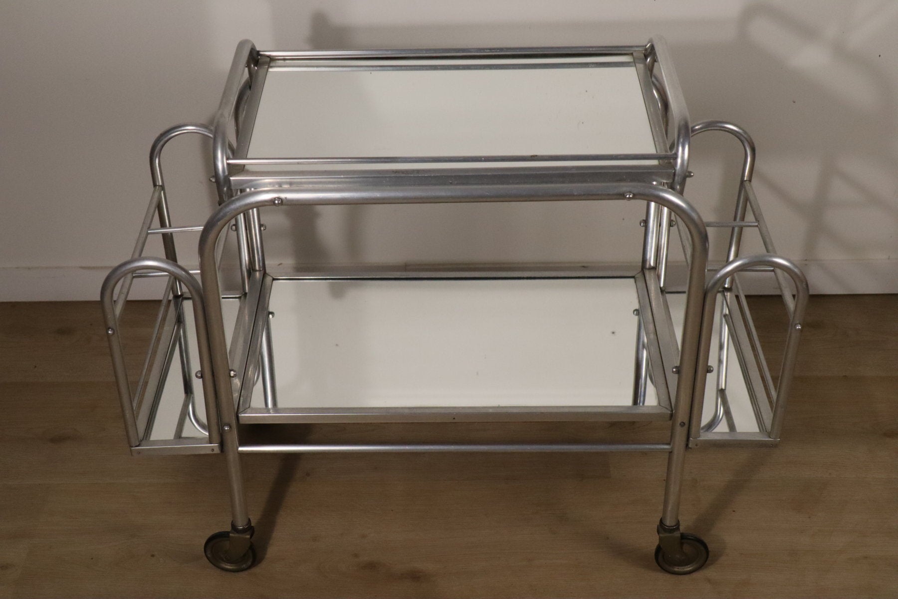 Sa structure en métal chromé lui donne une allure résolument moderniste, typique des années 70, tandis que ses plateaux en verre miroir apportent une touche chic et lumineuse.