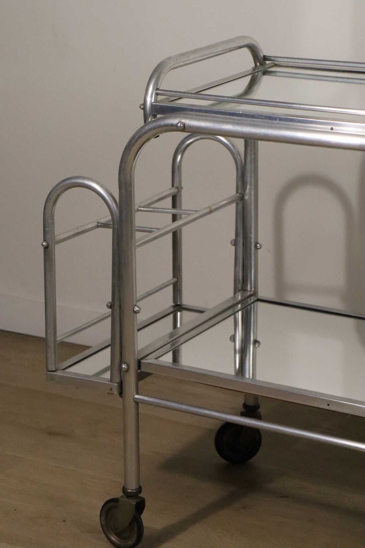 Desserte roulante vintage années 70 en métal chromé et verre miroir