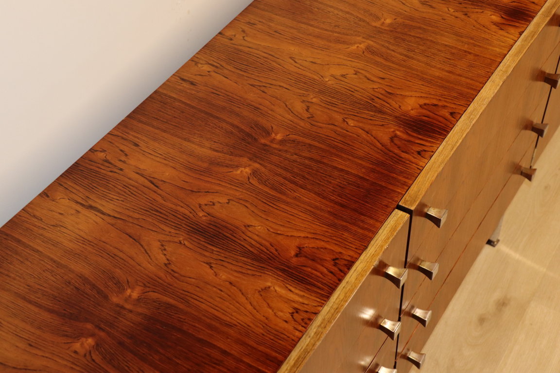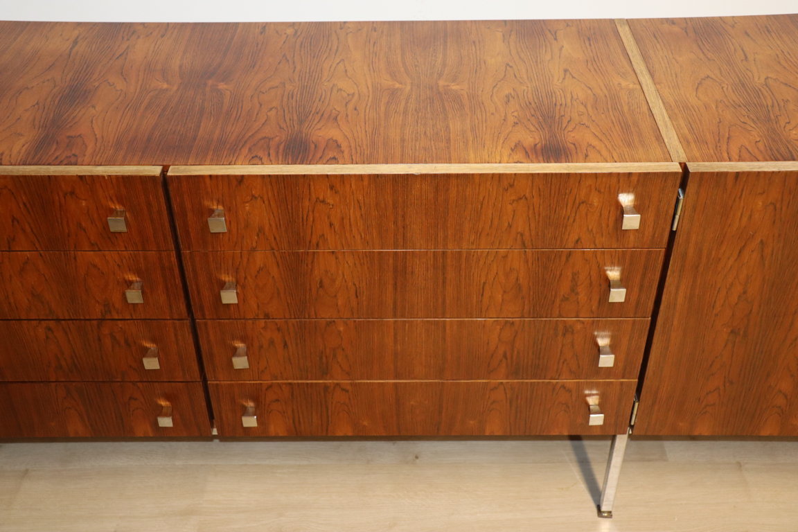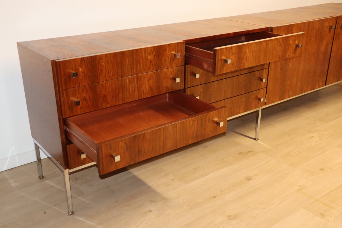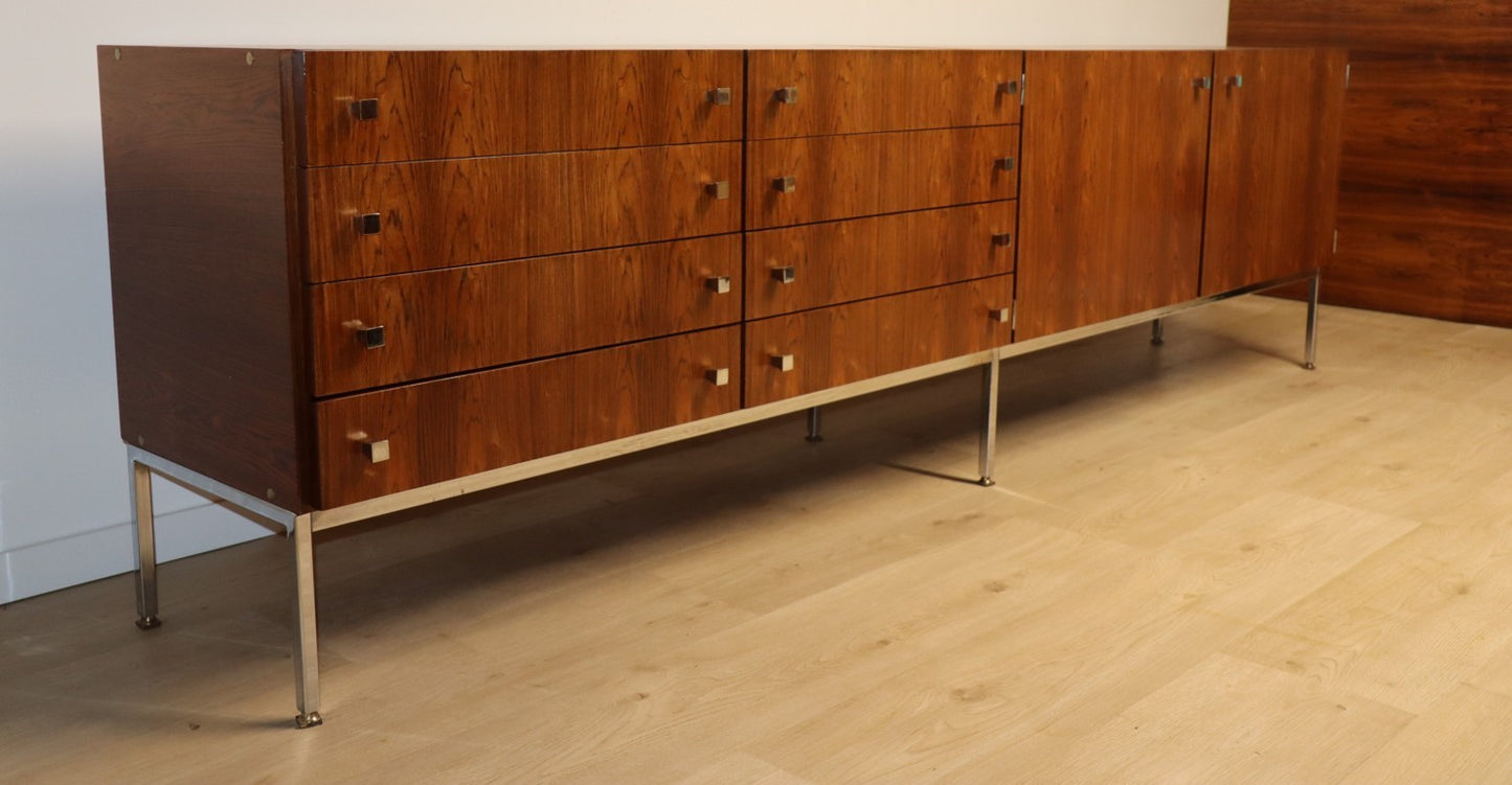 Réalisée en bois de placage palissandre sur une structure et poignées en métal chromé.