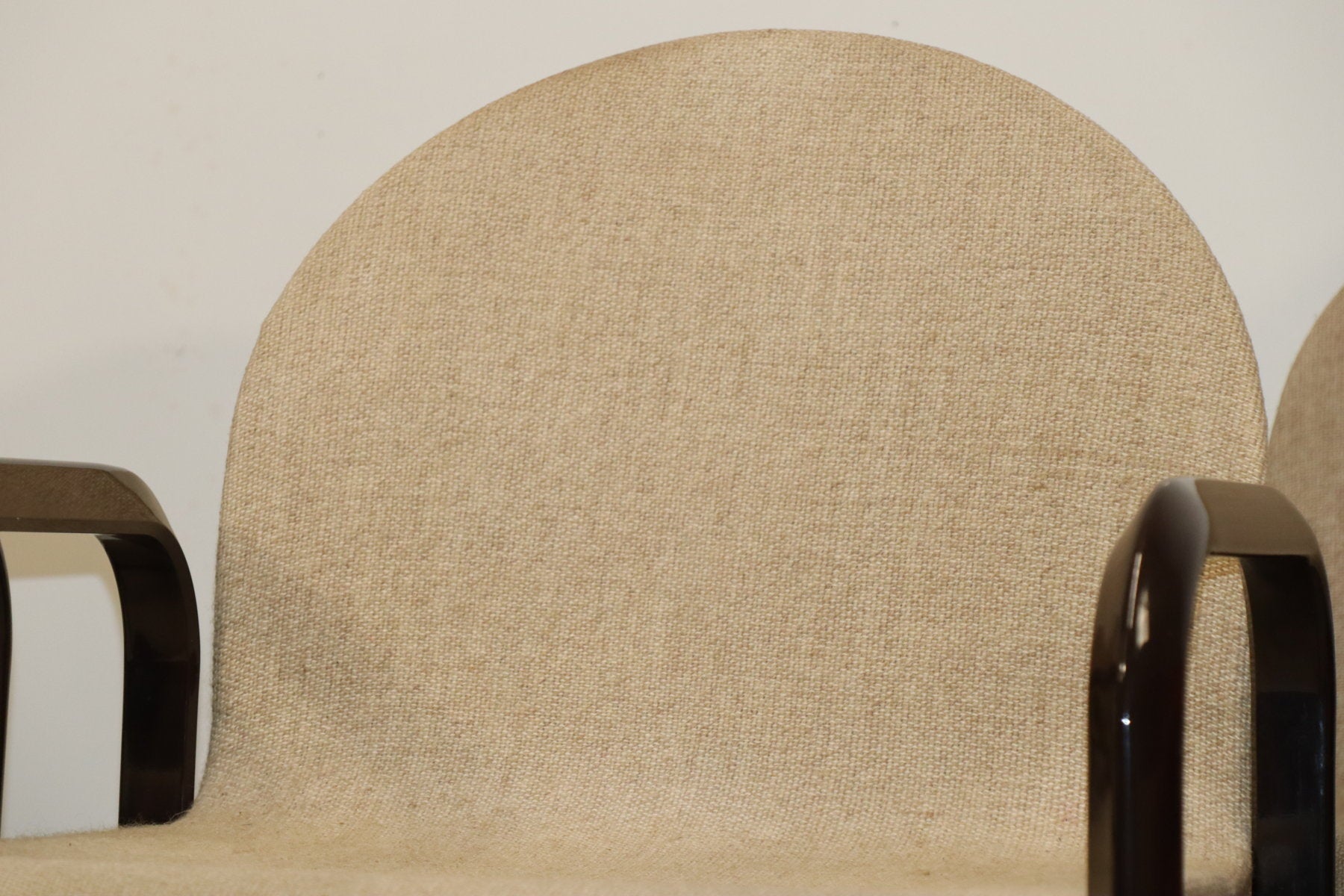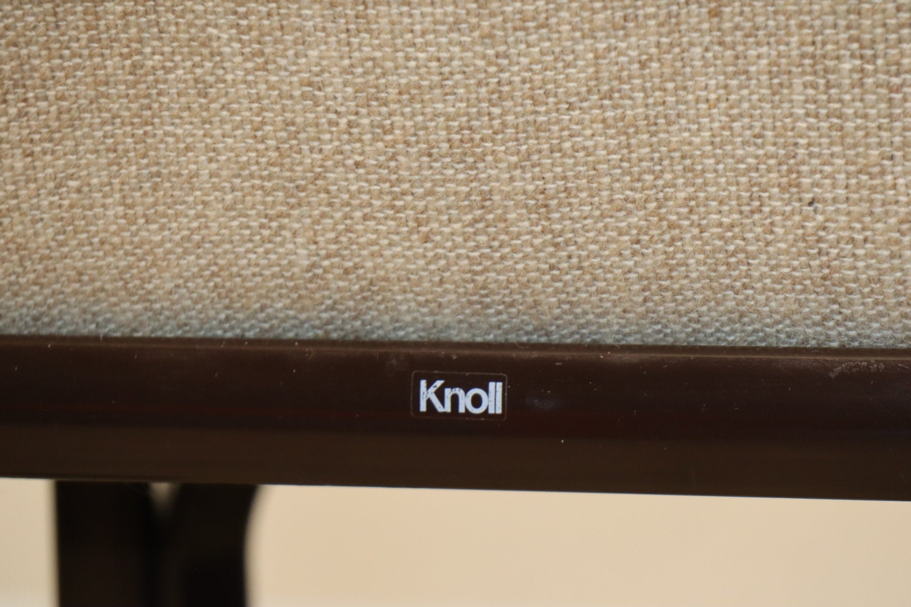 Éditées par Knoll, ces 4 chaises dessinées par Gae Aulenti reflètent le design audacieux et fonctionnel des années 1970. Leur structure tubulaire en métal laqué brun s’allie harmonieusement à une assise et un dossier tapissés d'un tissu beige en laine, offrant à la fois confort et élégance.