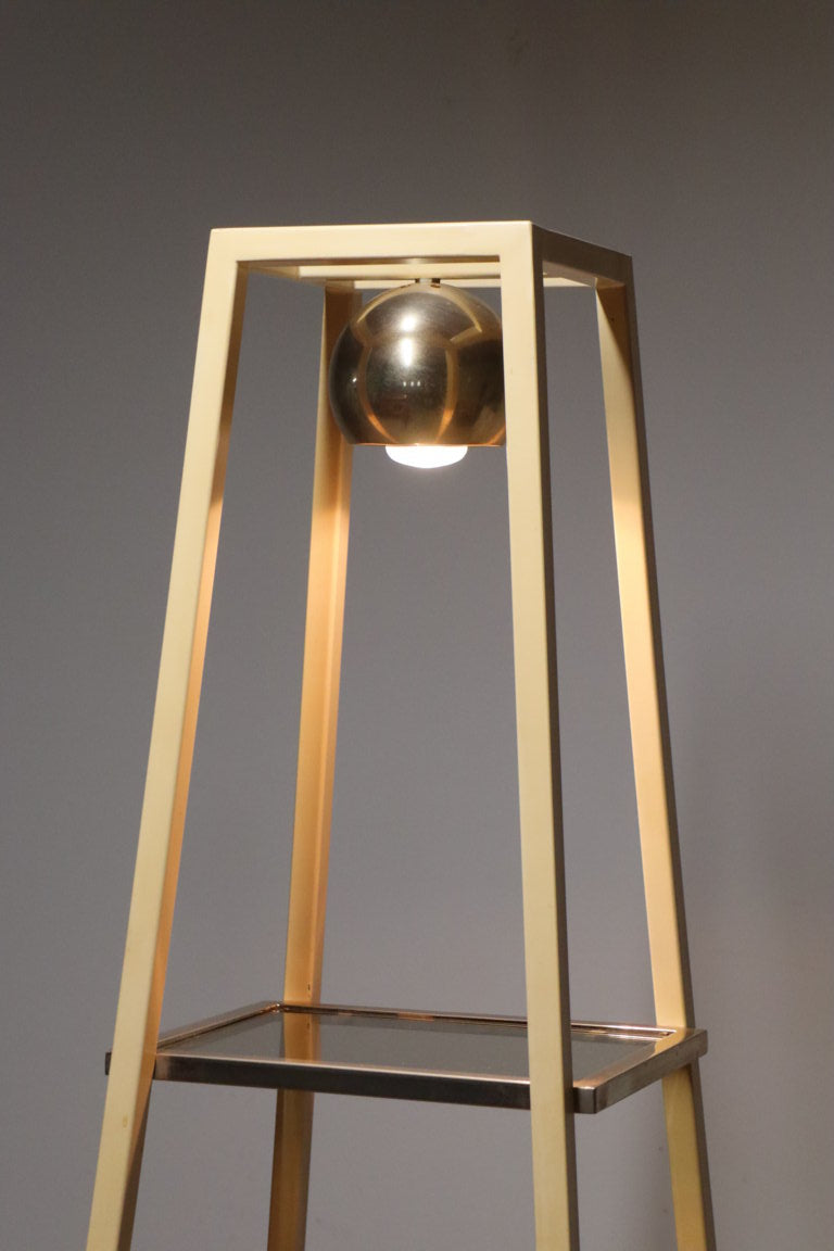 La structure est en métal avec une base en bois laqué crème et une ceinture en laiton doré.
