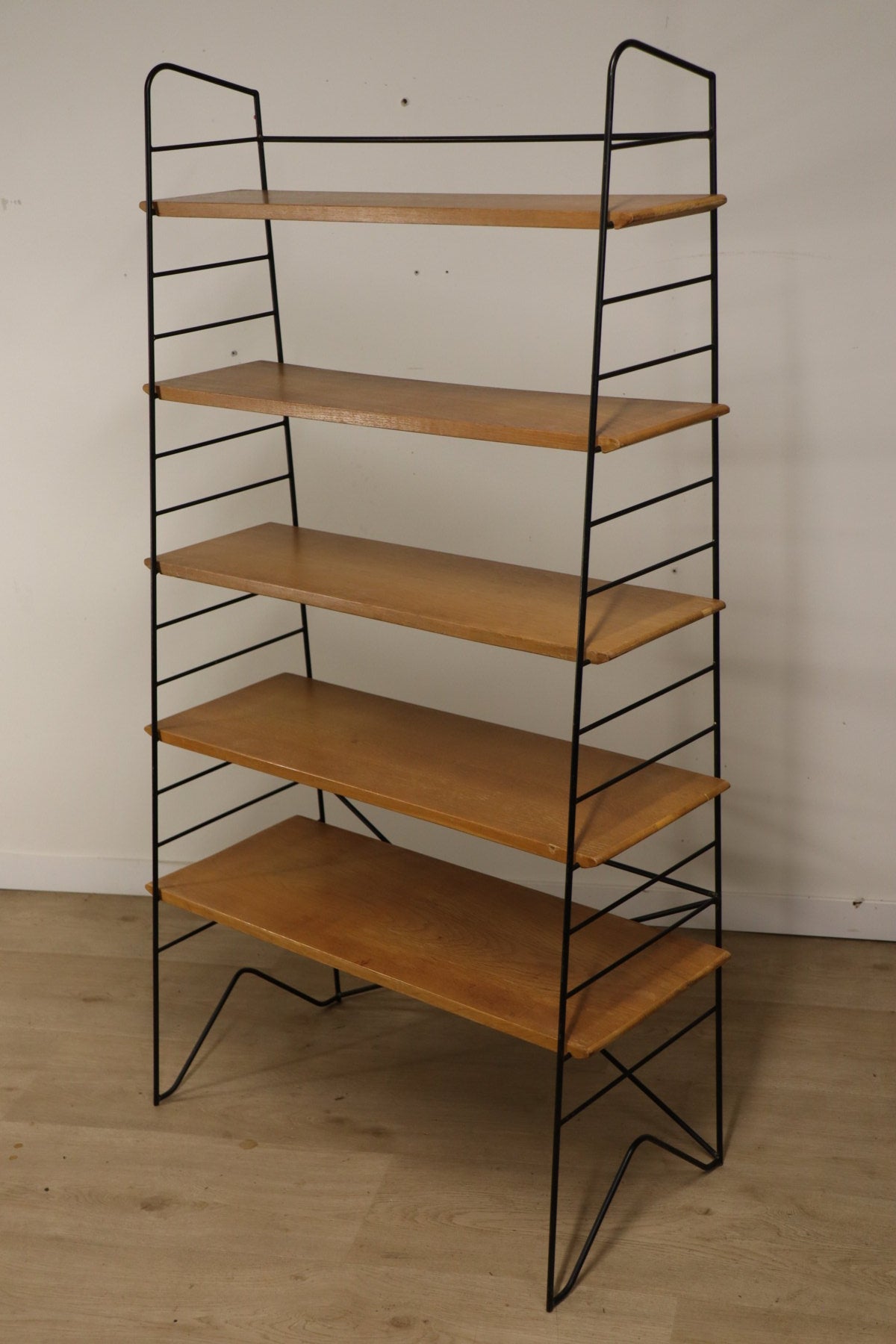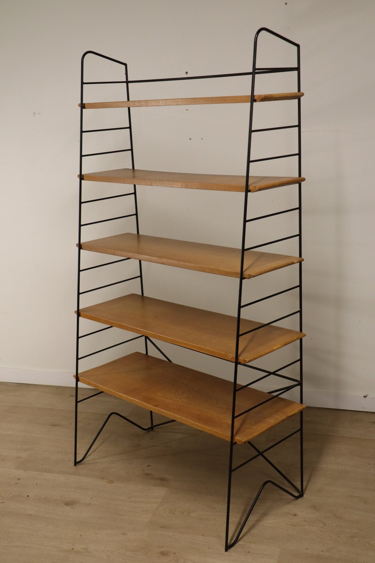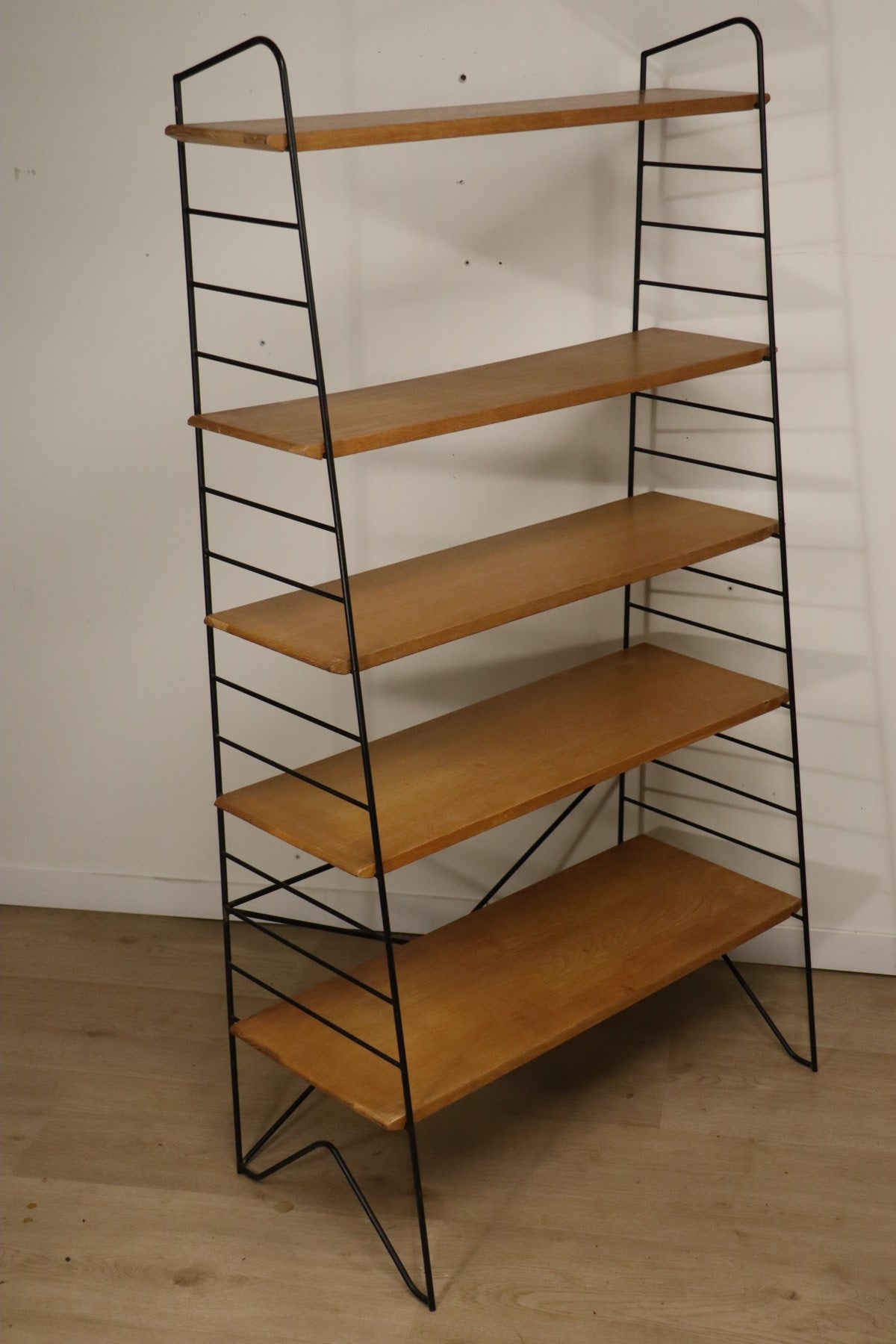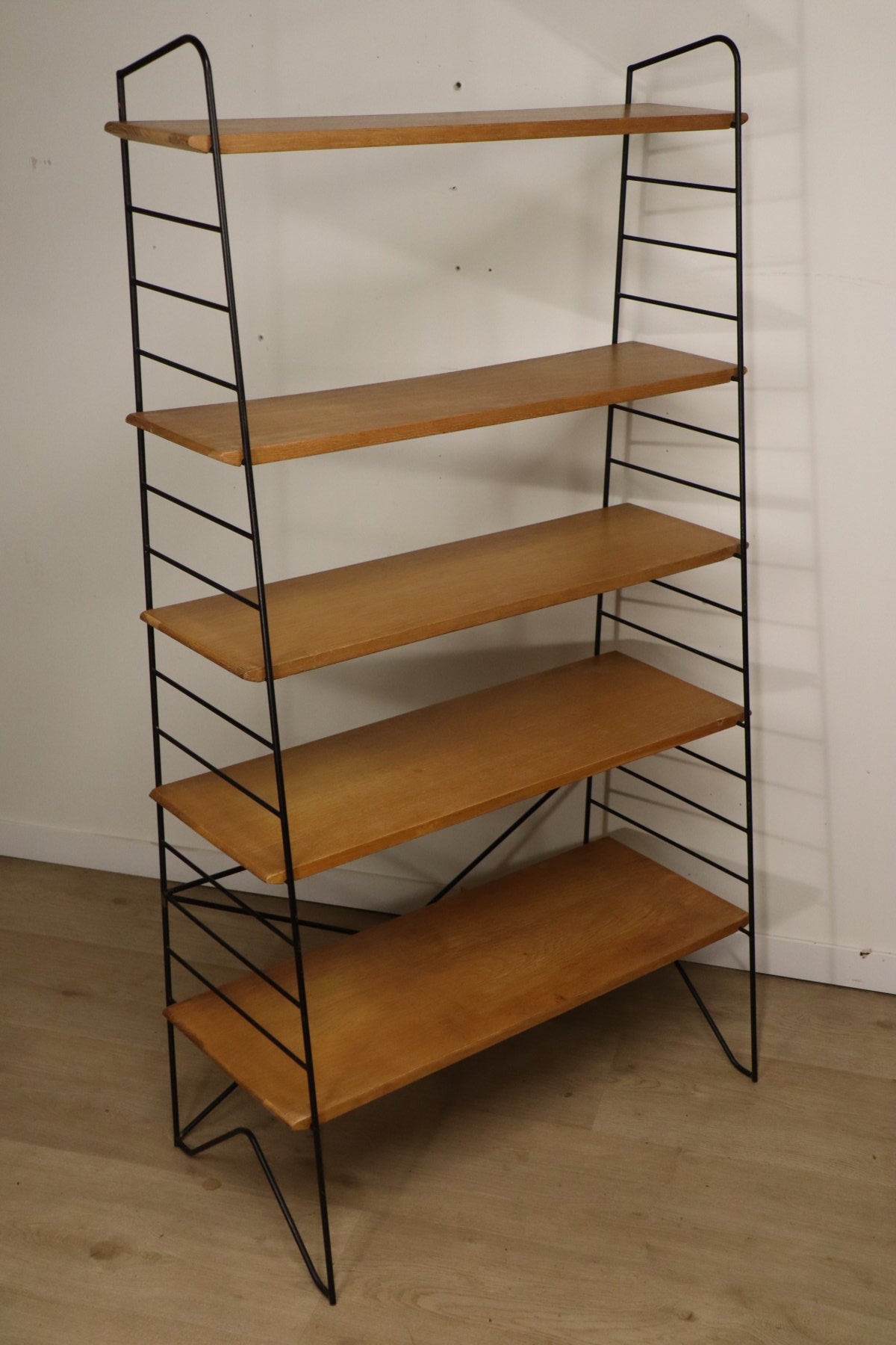 Etagère vintage conçue dans les années 60, au design chic et élégant. Une structure en métal noir laqué formant une silhouette légère et graphique, associée à cinq étagères en chêne clair pouvant être ajusté selon votre envie. I