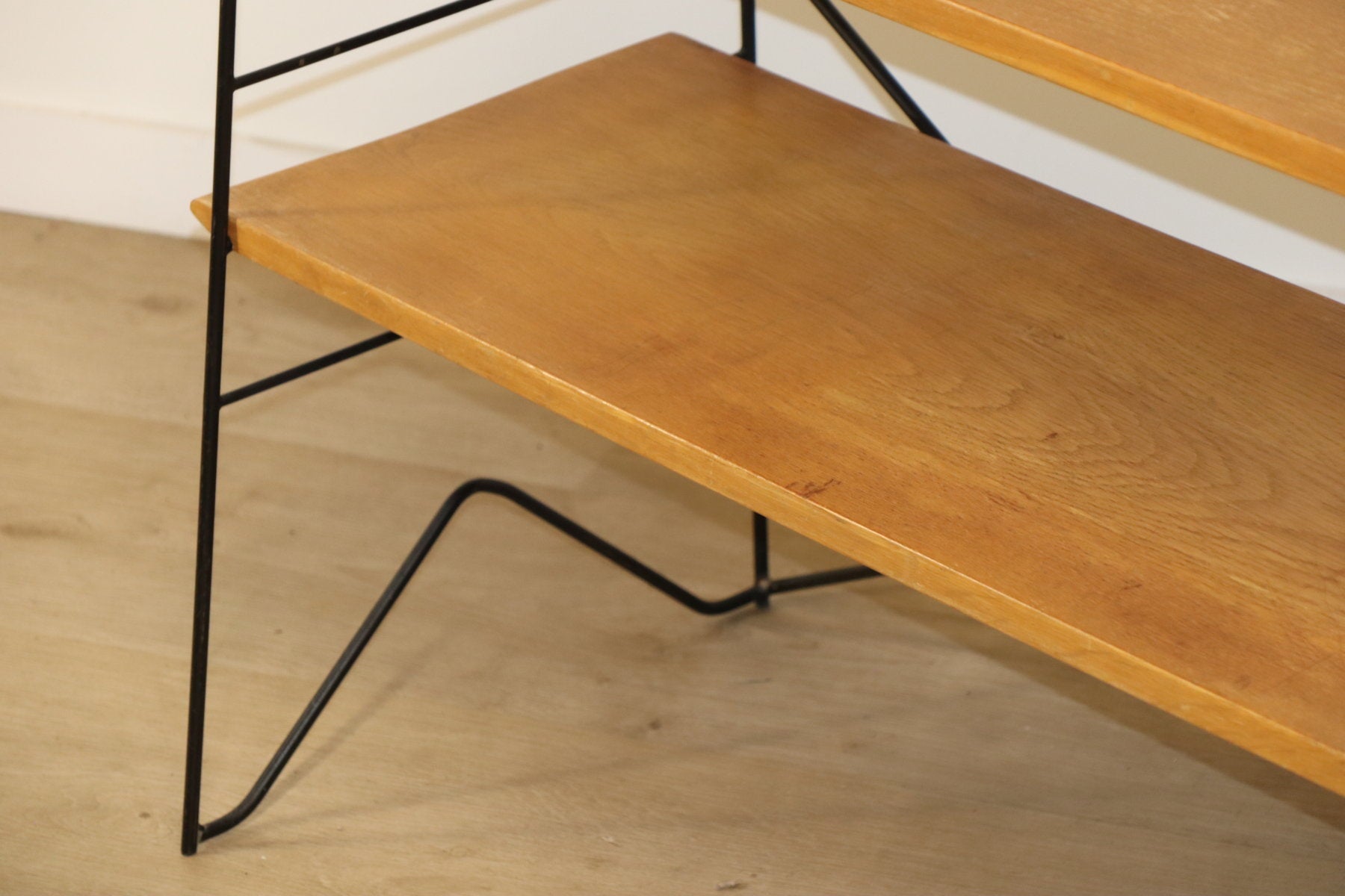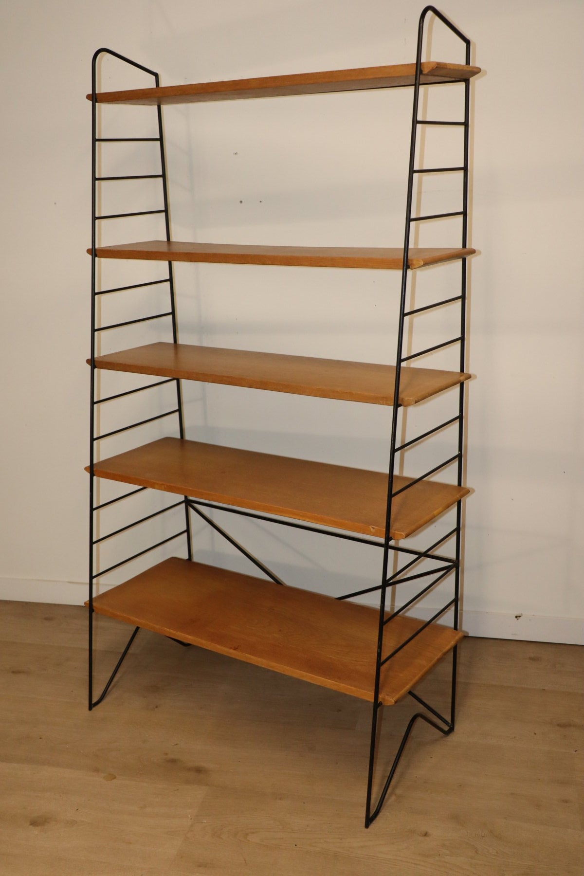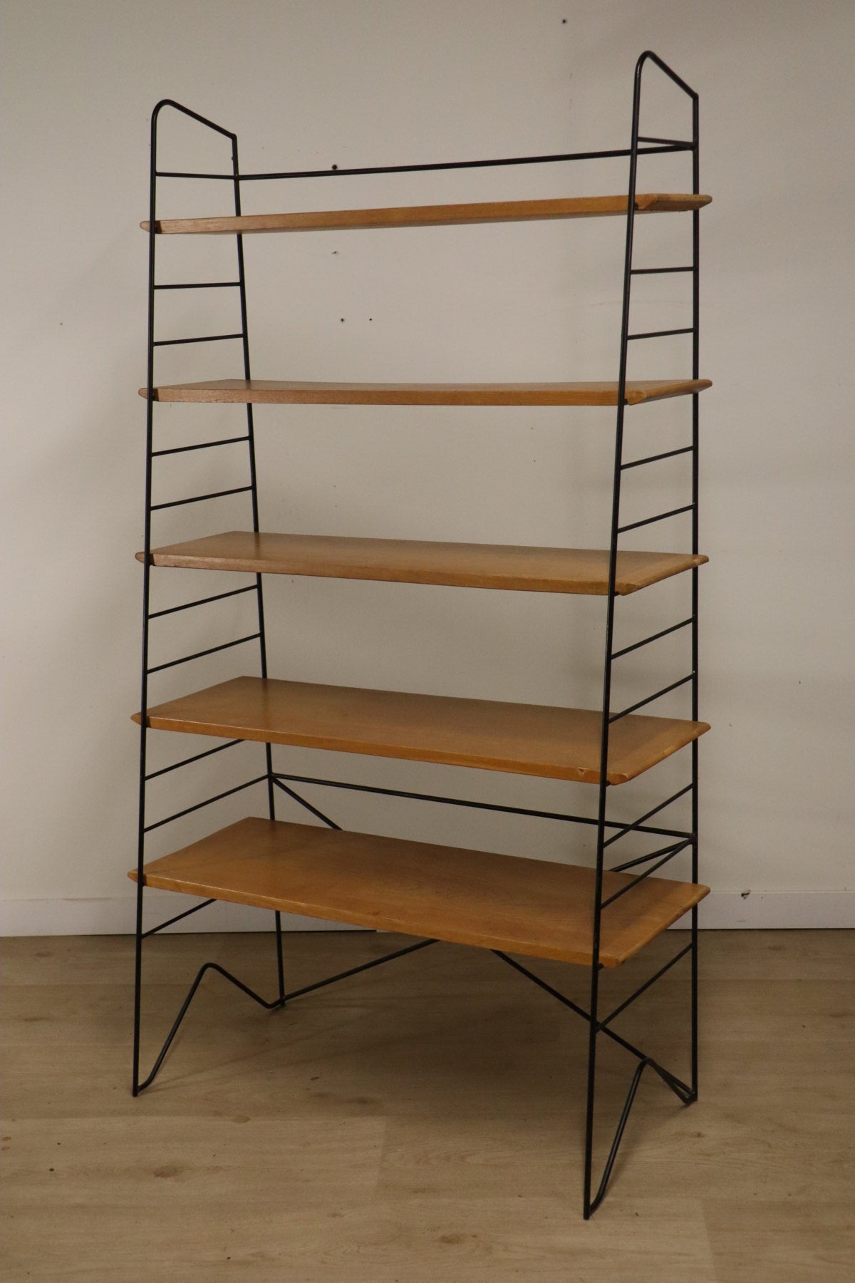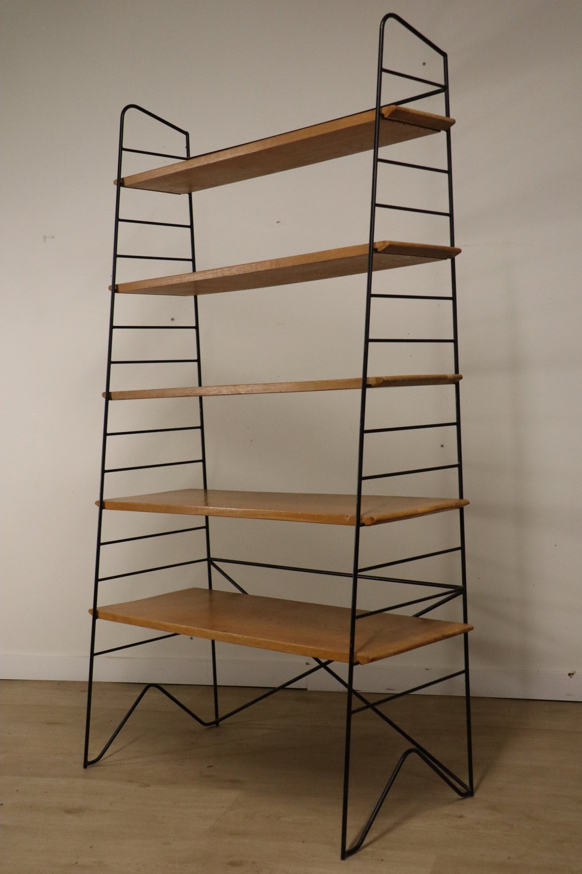 Etagère vintage conçue dans les années 60, au design chic et élégant. Une structure en métal noir laqué formant une silhouette légère et graphique, associée à cinq étagères en chêne clair pouvant être ajusté selon votre envie. I