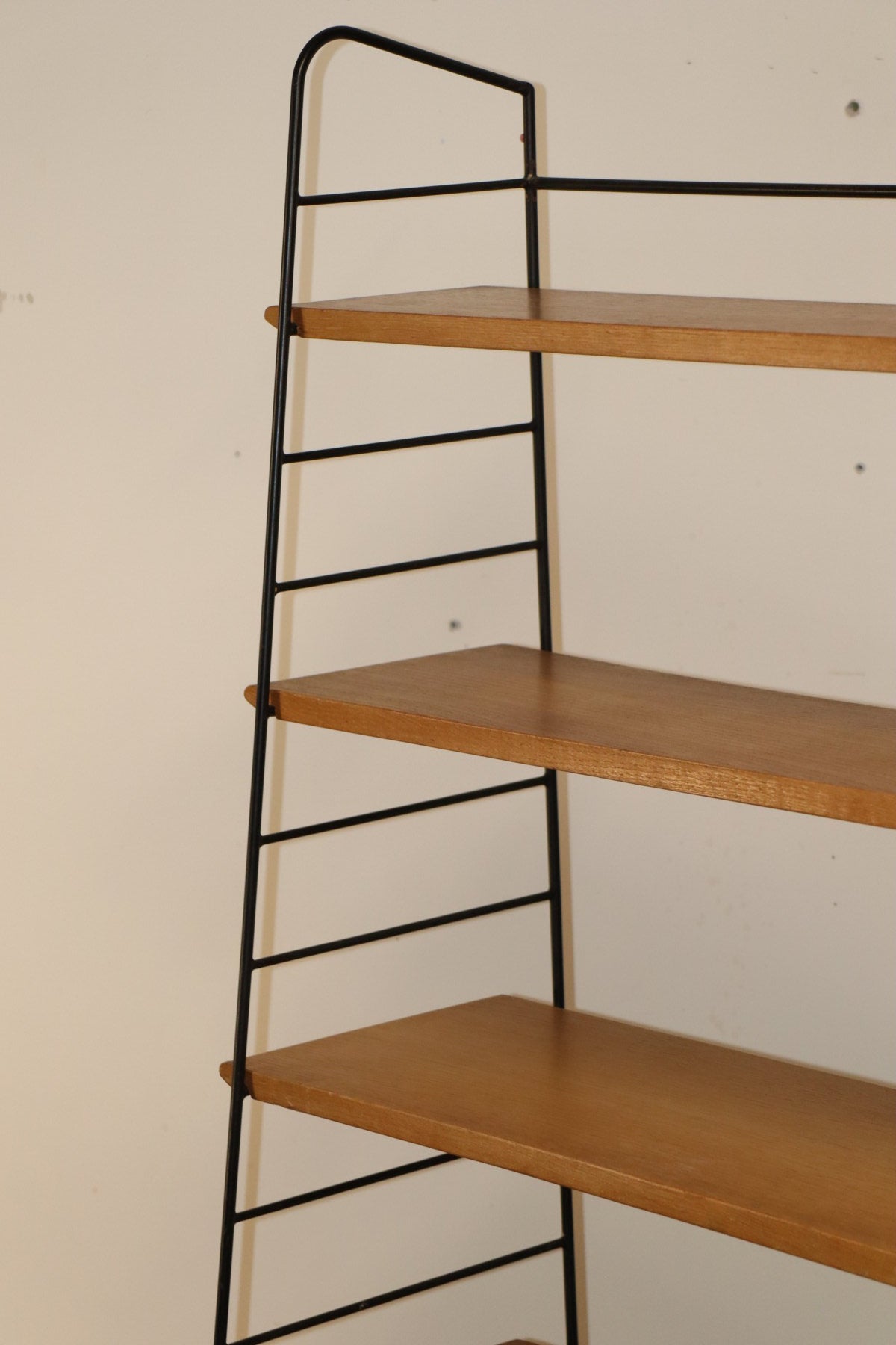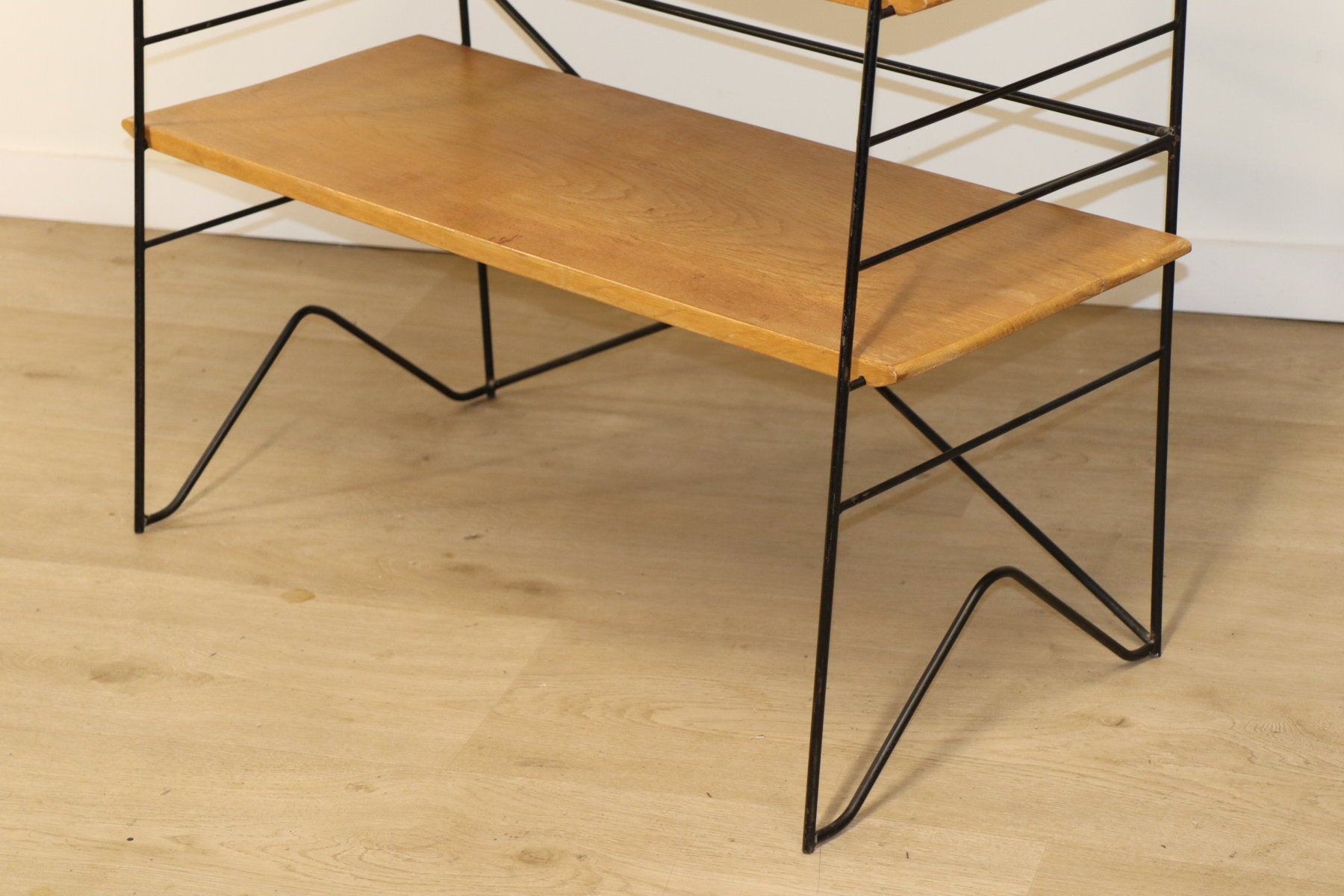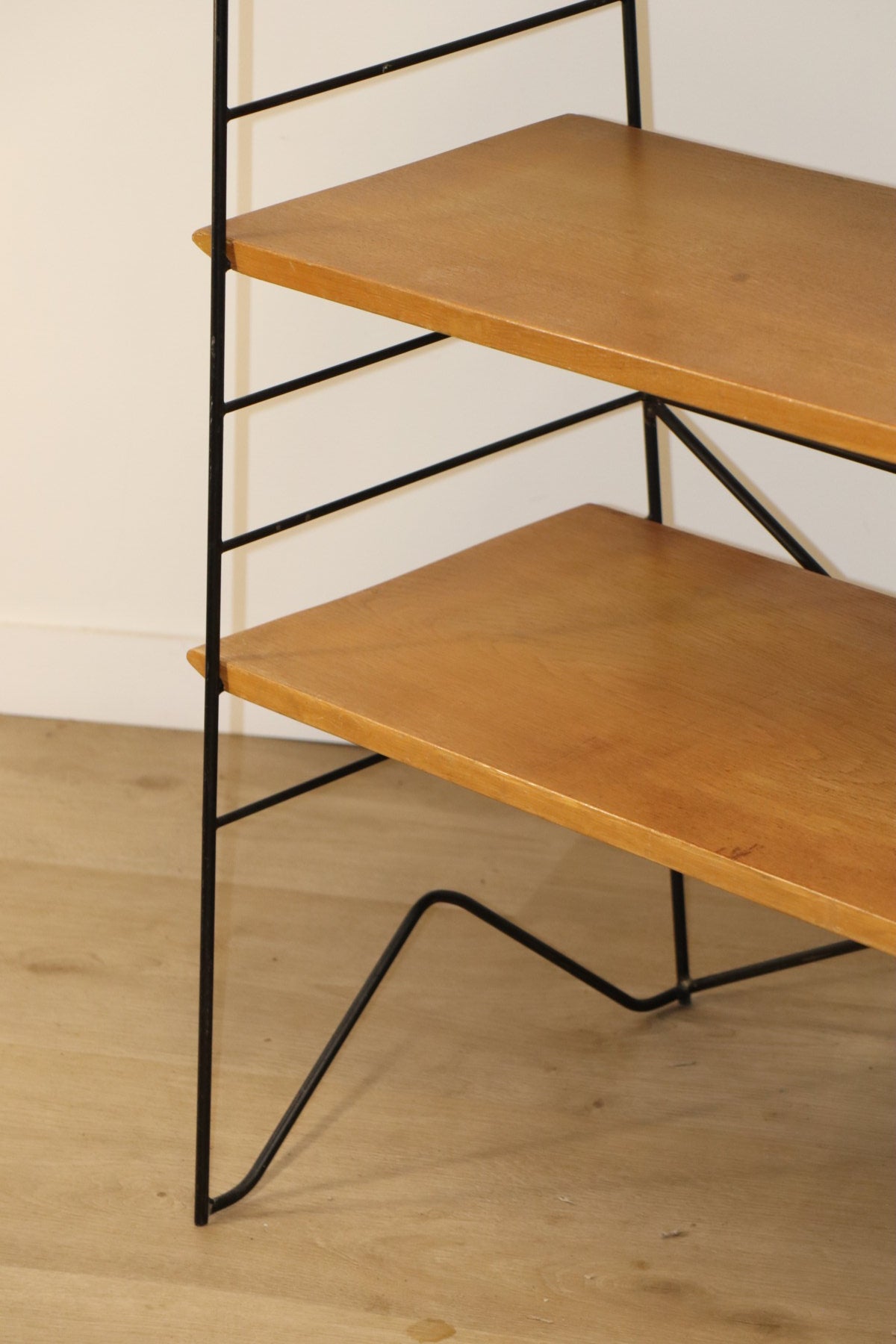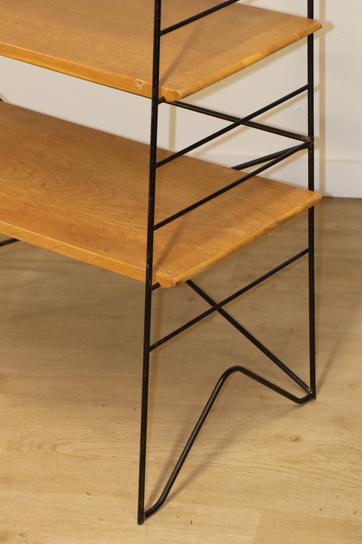 Etagère vintage conçue dans les années 60, au design chic et élégant. Une structure en métal noir laqué formant une silhouette légère et graphique, associée à cinq étagères en chêne clair pouvant être ajusté selon votre envie. I