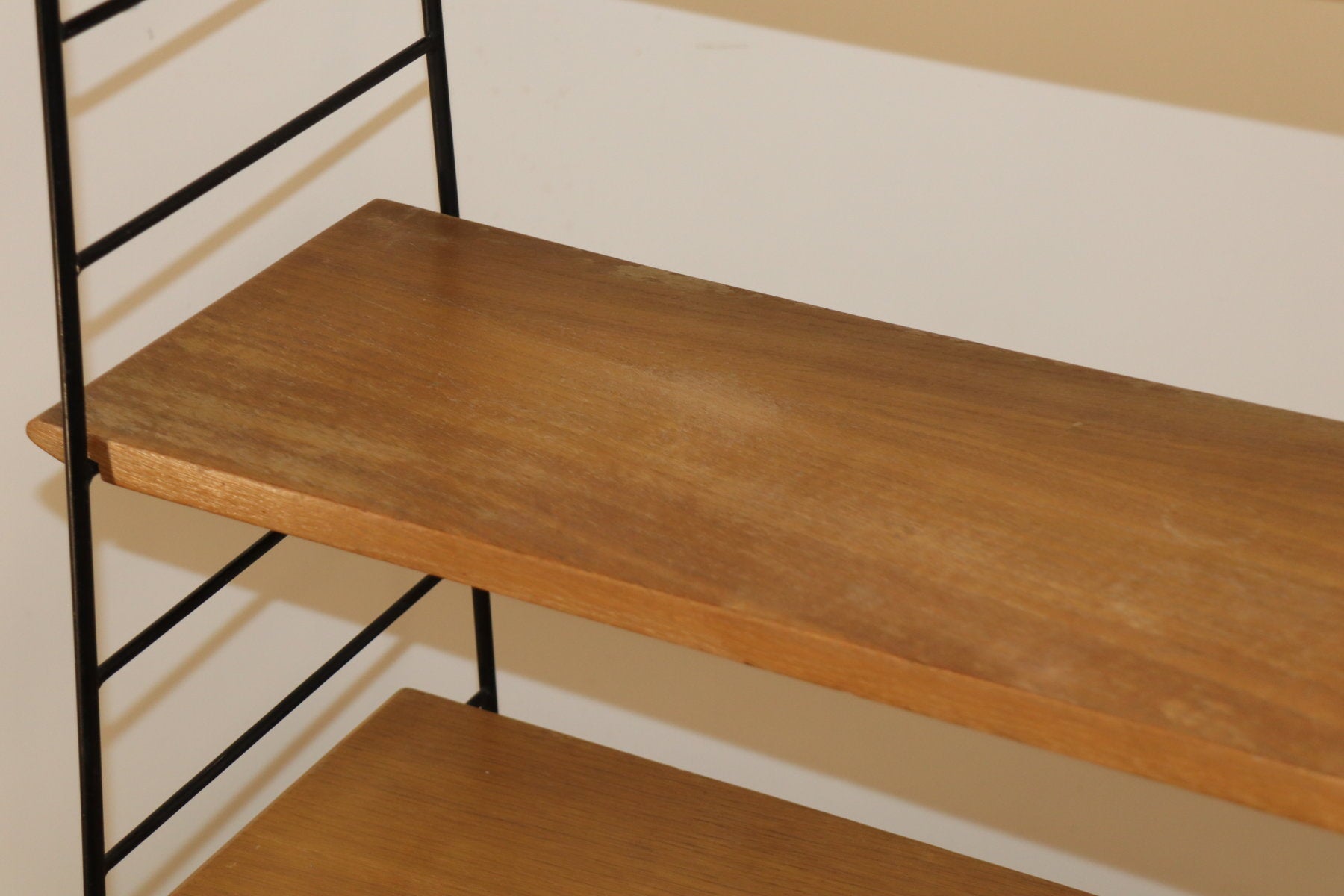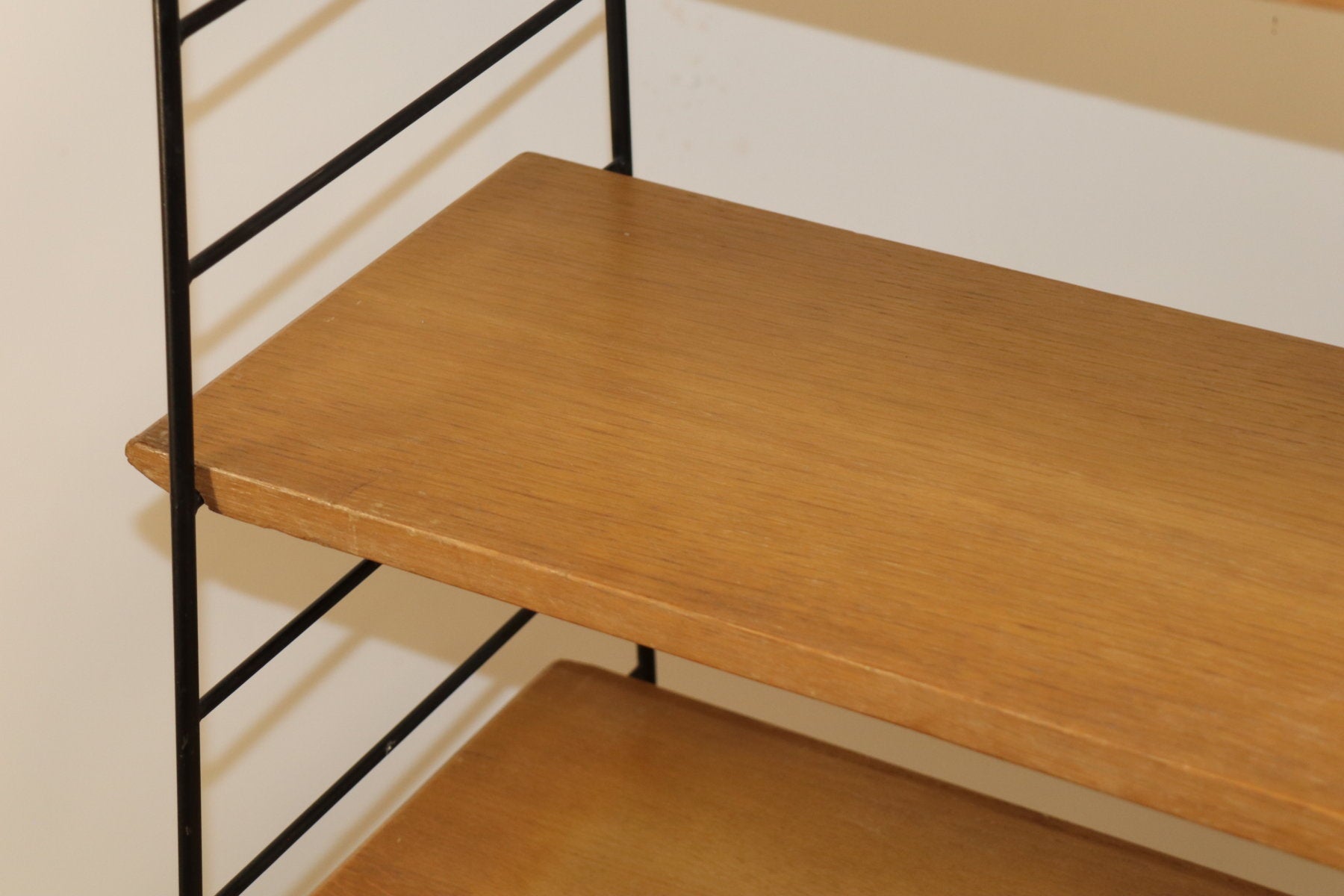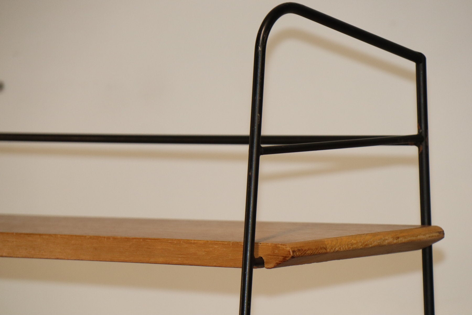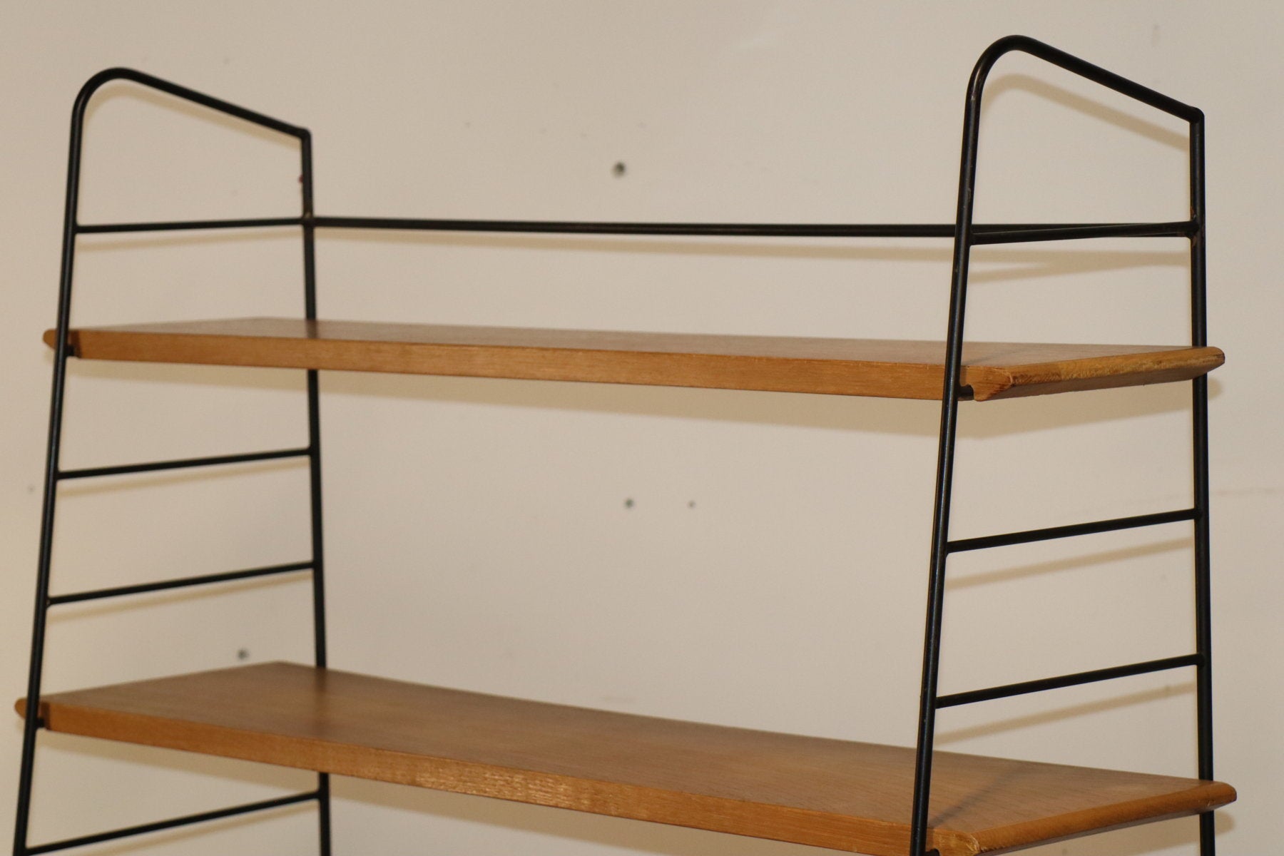 Etagère vintage conçue dans les années 60, au design chic et élégant. Une structure en métal noir laqué formant une silhouette légère et graphique, associée à cinq étagères en chêne clair pouvant être ajusté selon votre envie. I