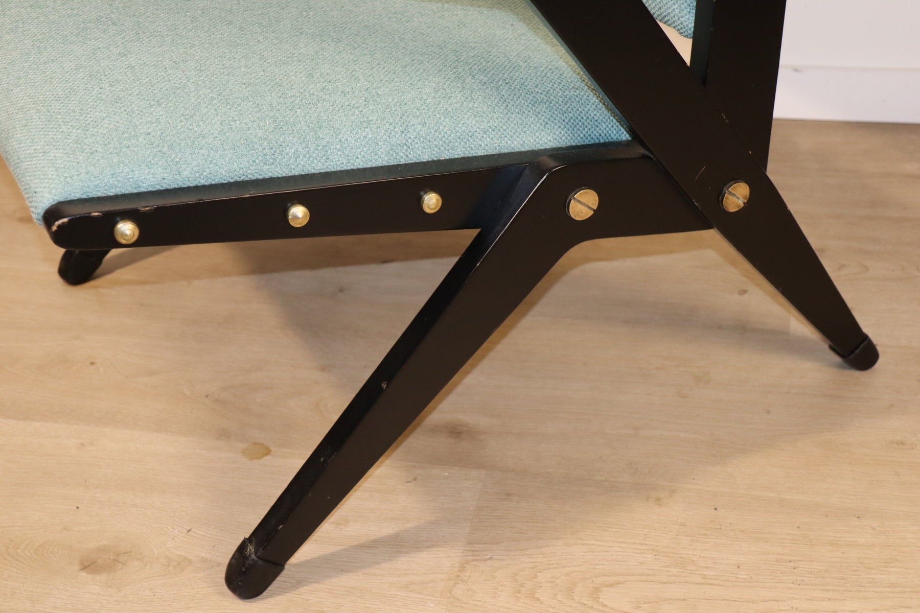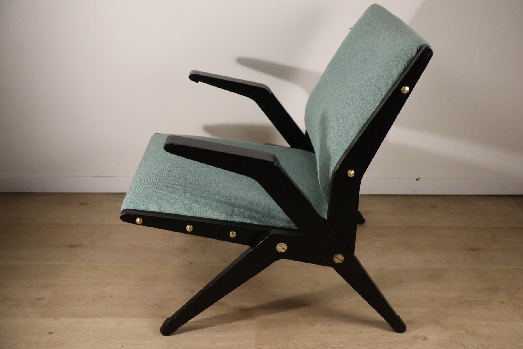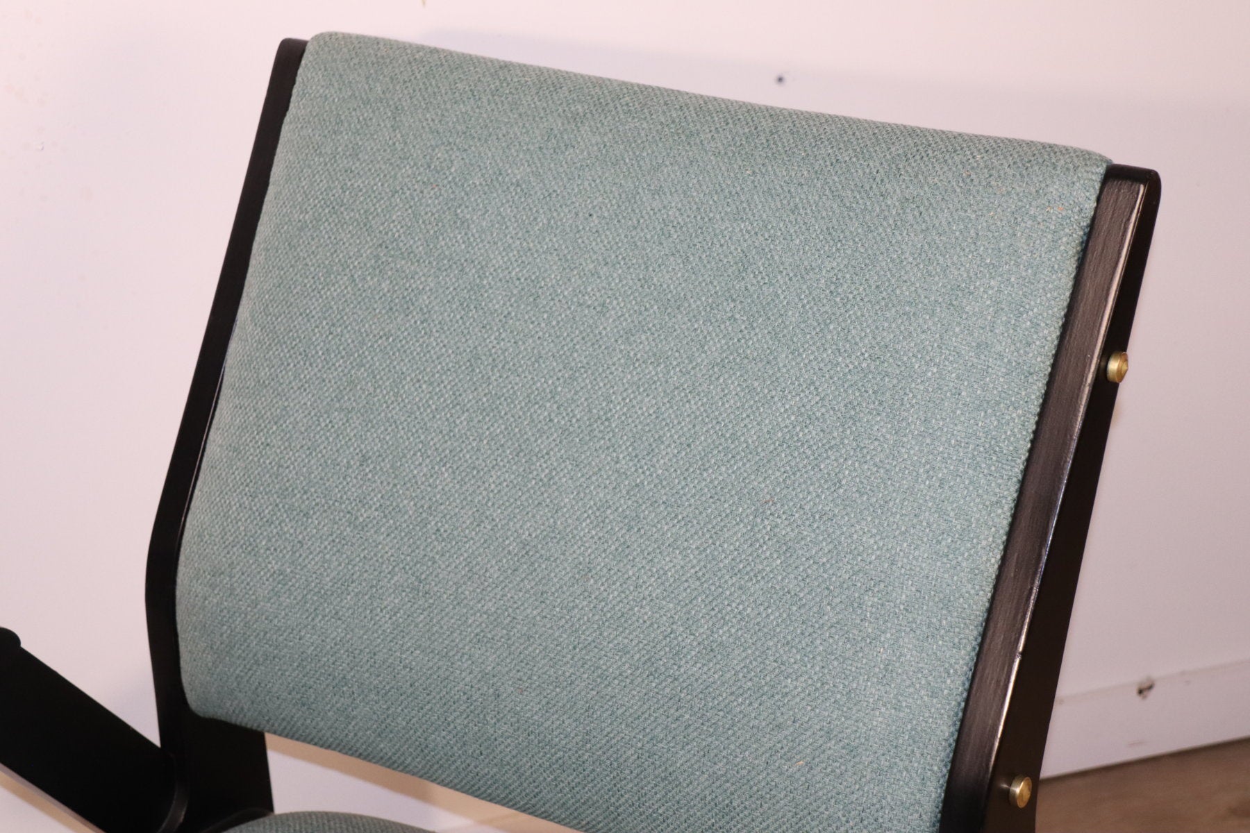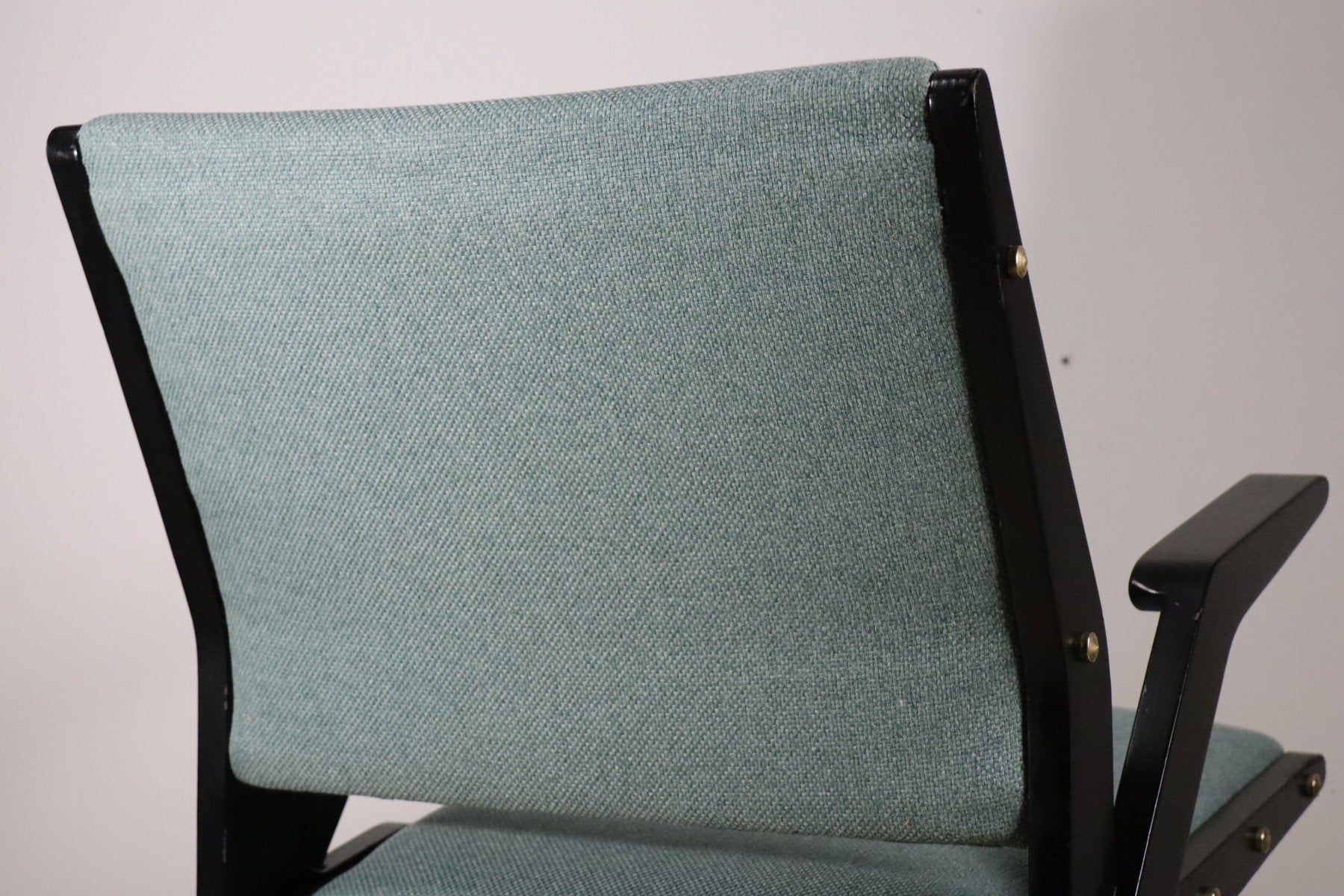 Sa structure en bois laqué noir, ponctuée de vis apparentes en laiton, contraste harmonieusement avec l’assise et le dossier rembourrés recouverts d’un tissu à la teinte douce et lumineuse.