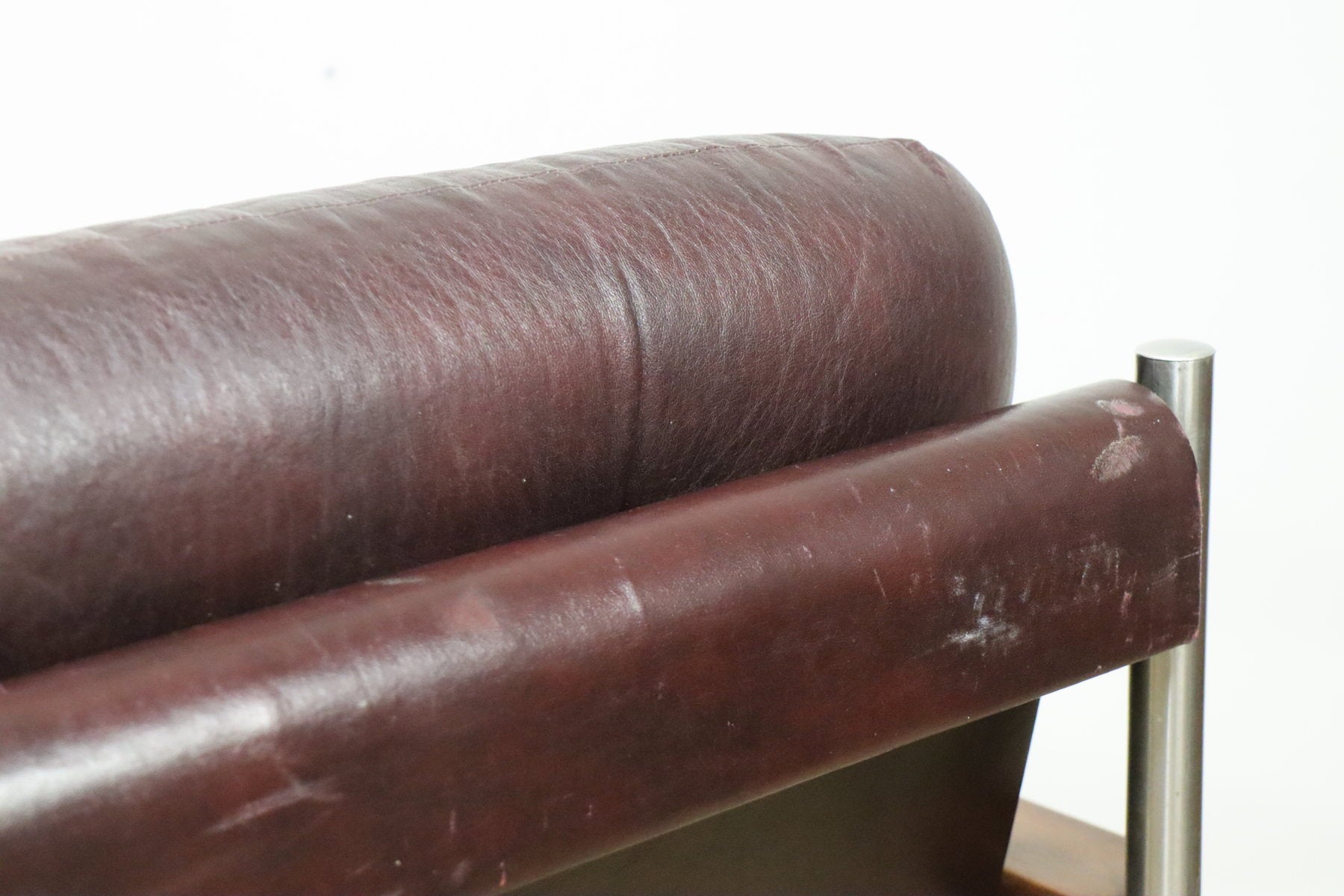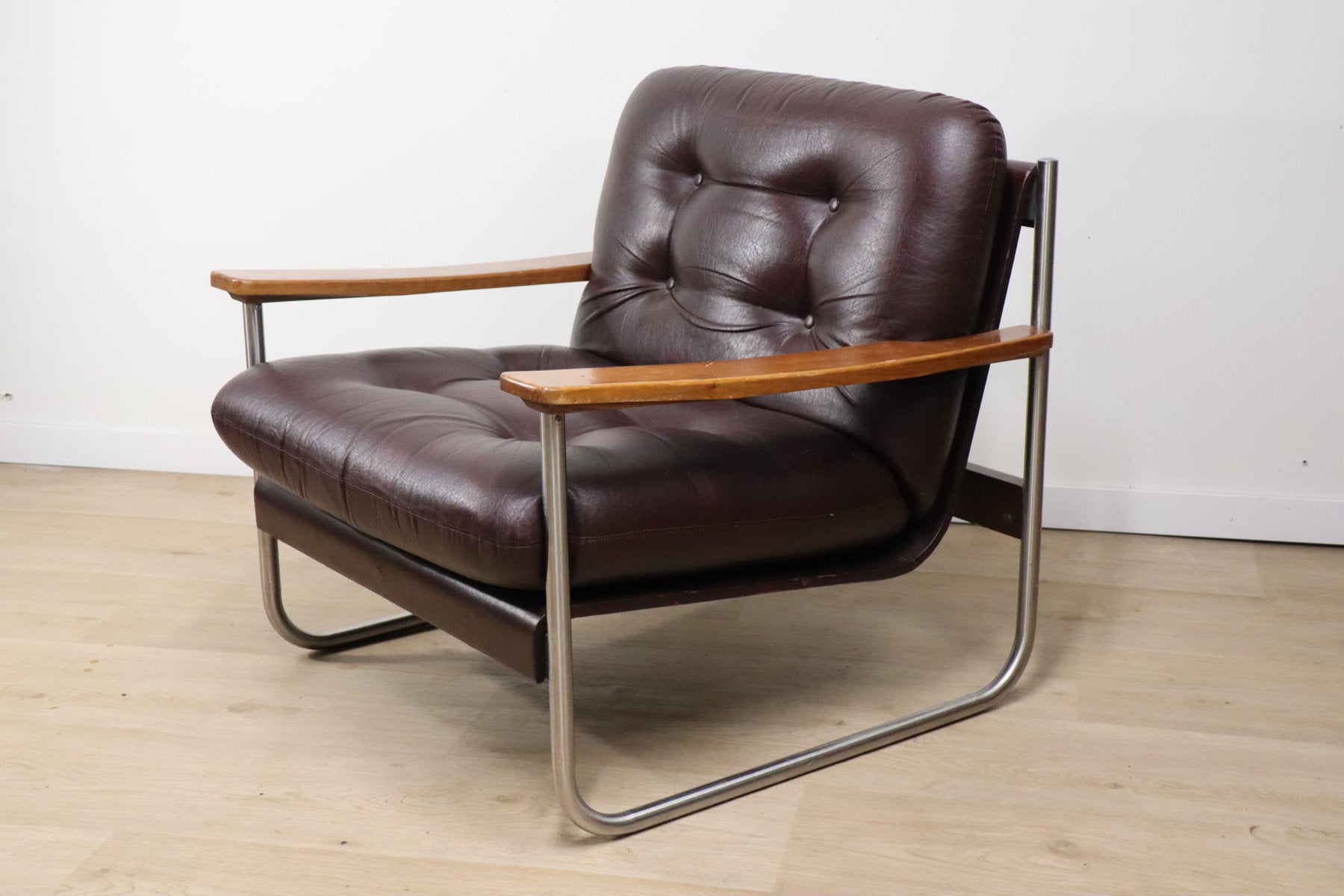 Fauteuil vintage datant des années 70 dans un style bauhaus très épuré. Une structure en métal avec des accoudoirs en bois et une assise en revêtement skaï en font un véritable fauteuil confortable et élégant.