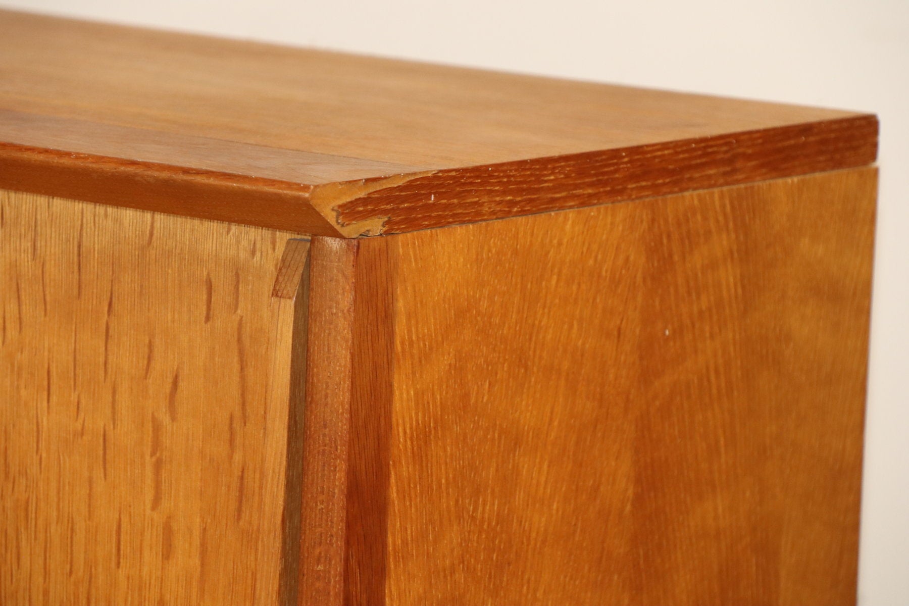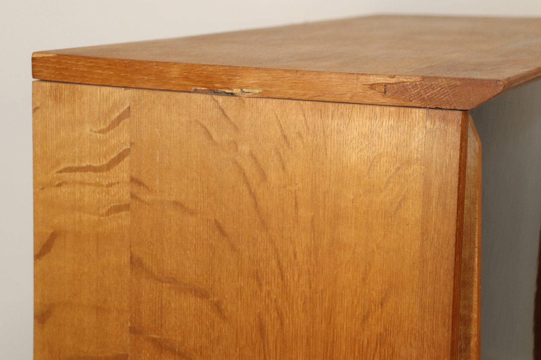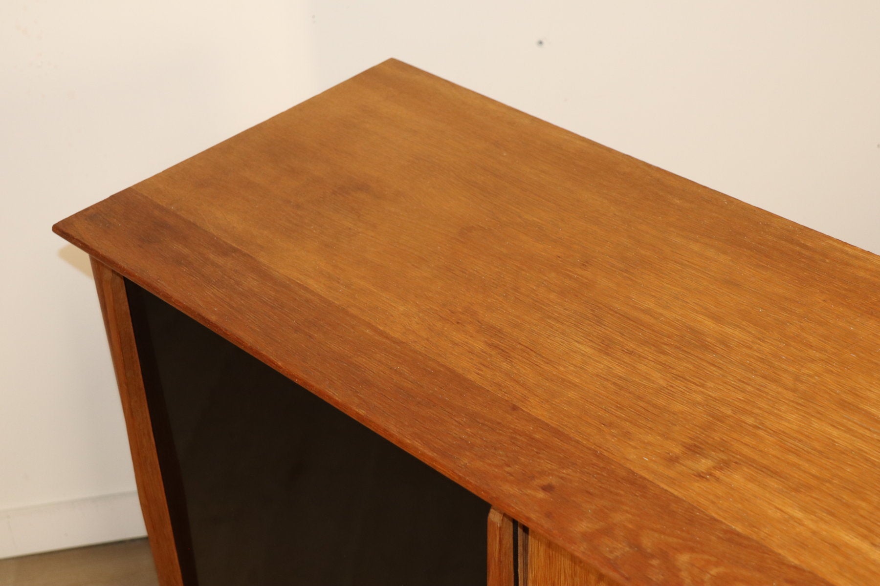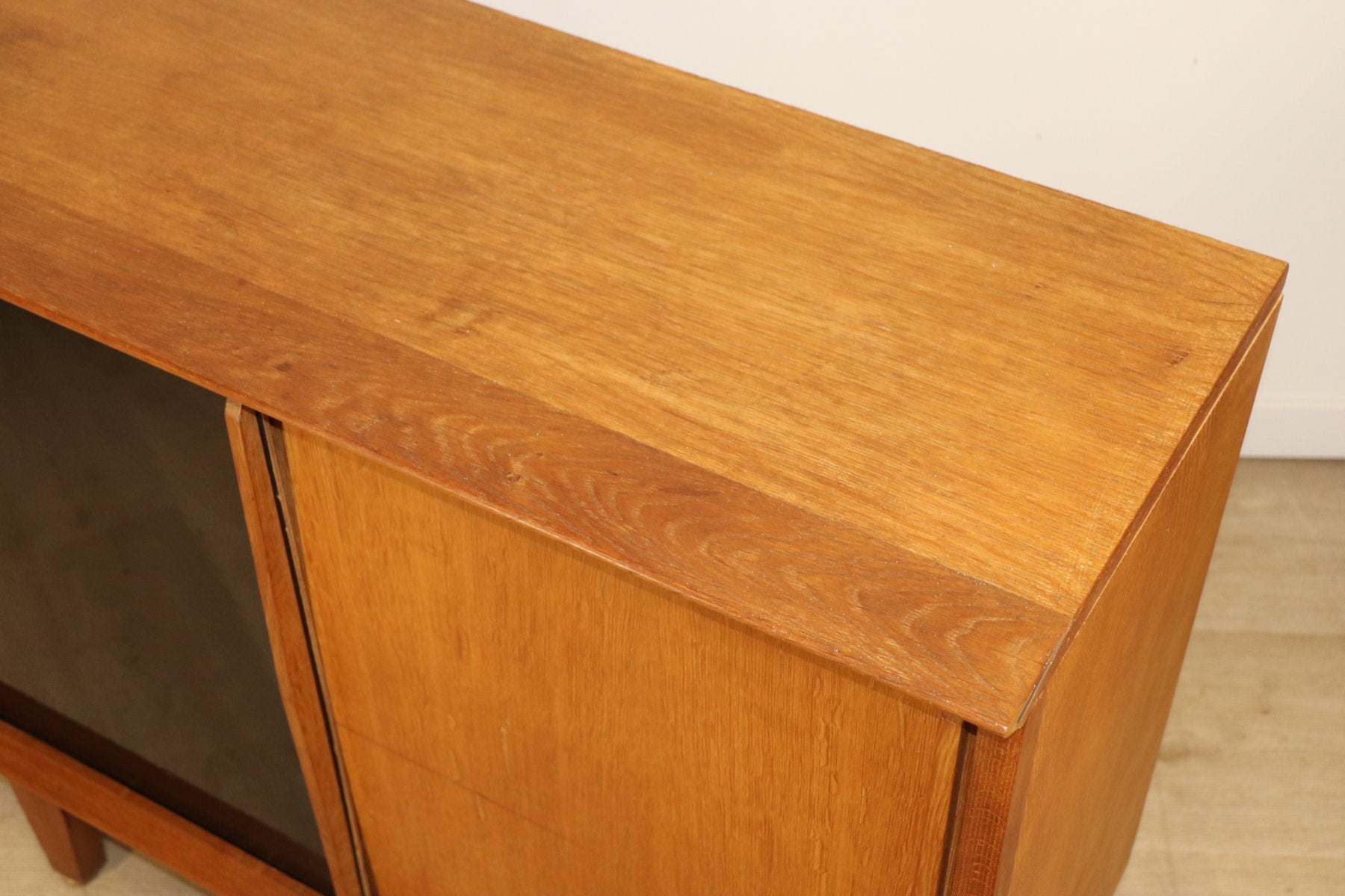 Élégant meuble d’appoint vintage au design sobre et fonctionnel. Sa structure en chêne clair s’accorde parfaitement avec les portes coulissantes contrastées, dont l’une est en bois naturel et l’autre en panneau vinyle noir d'origine. Un duo de matières typique des créations modernistes des années 50–60.