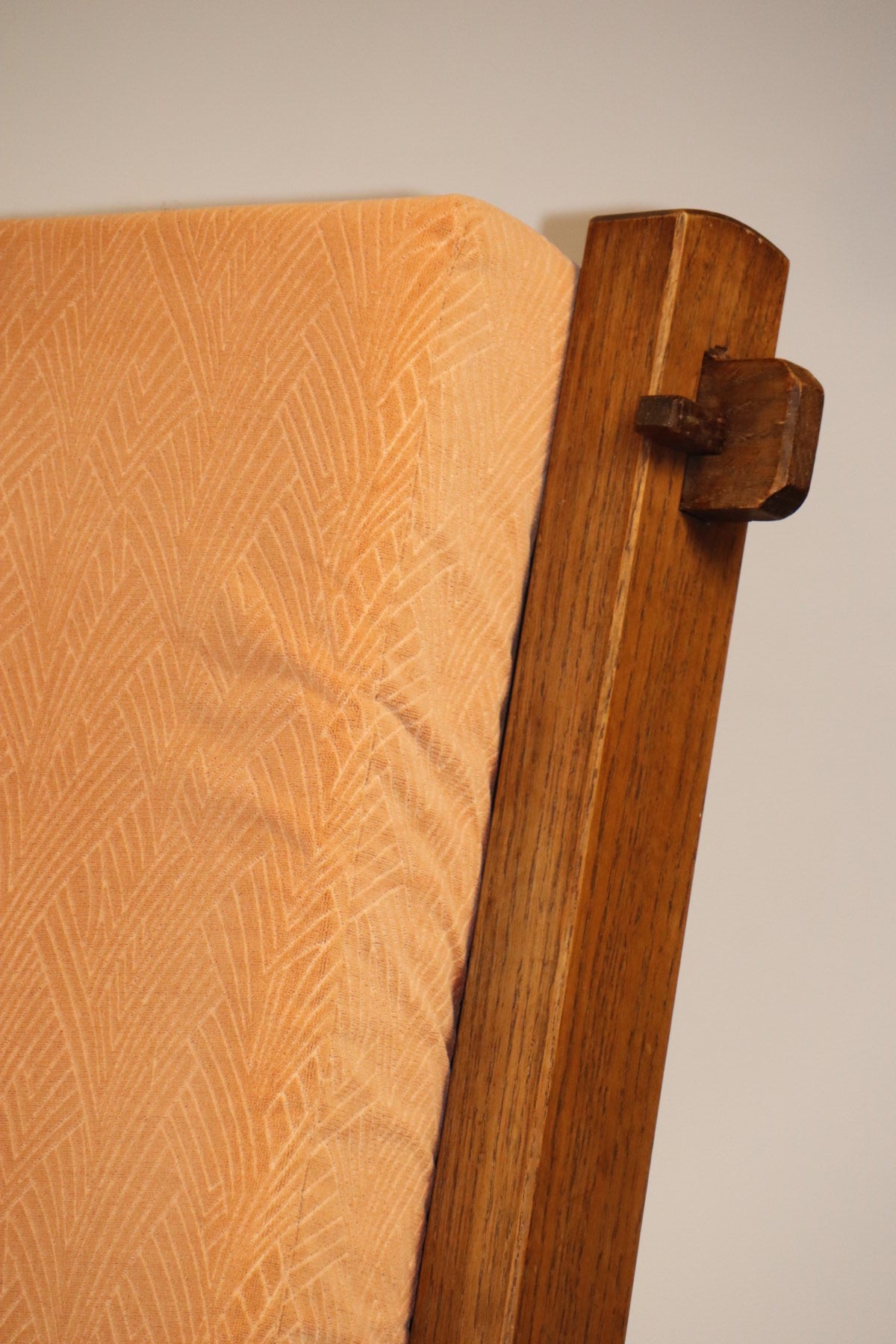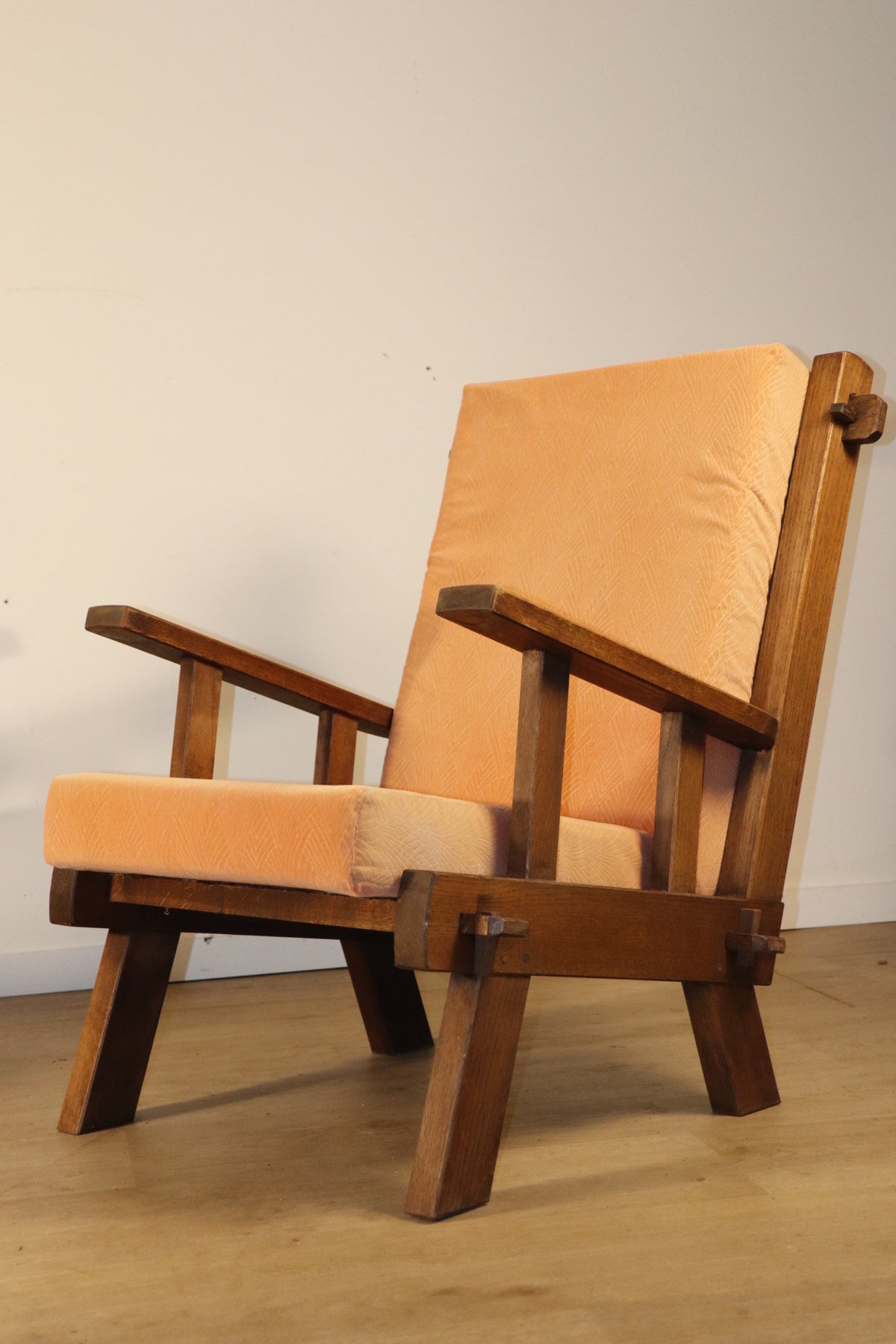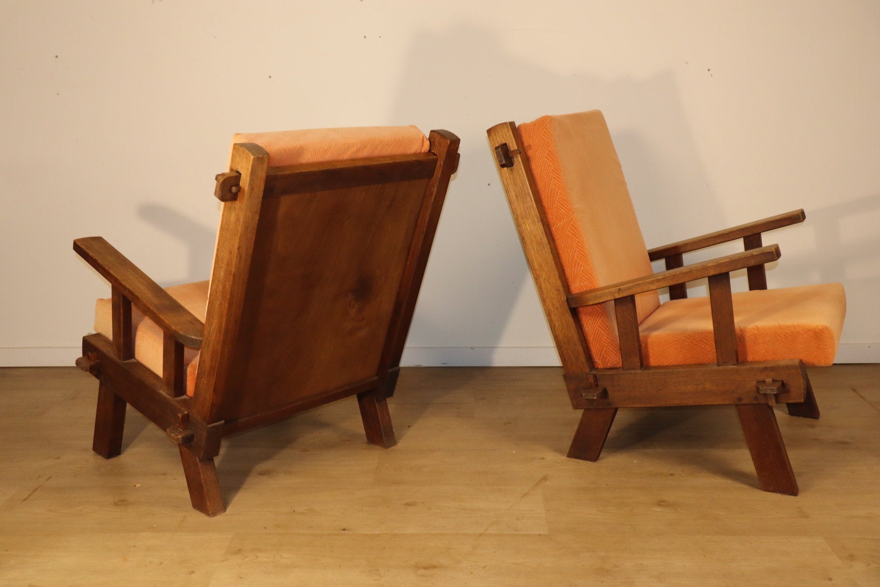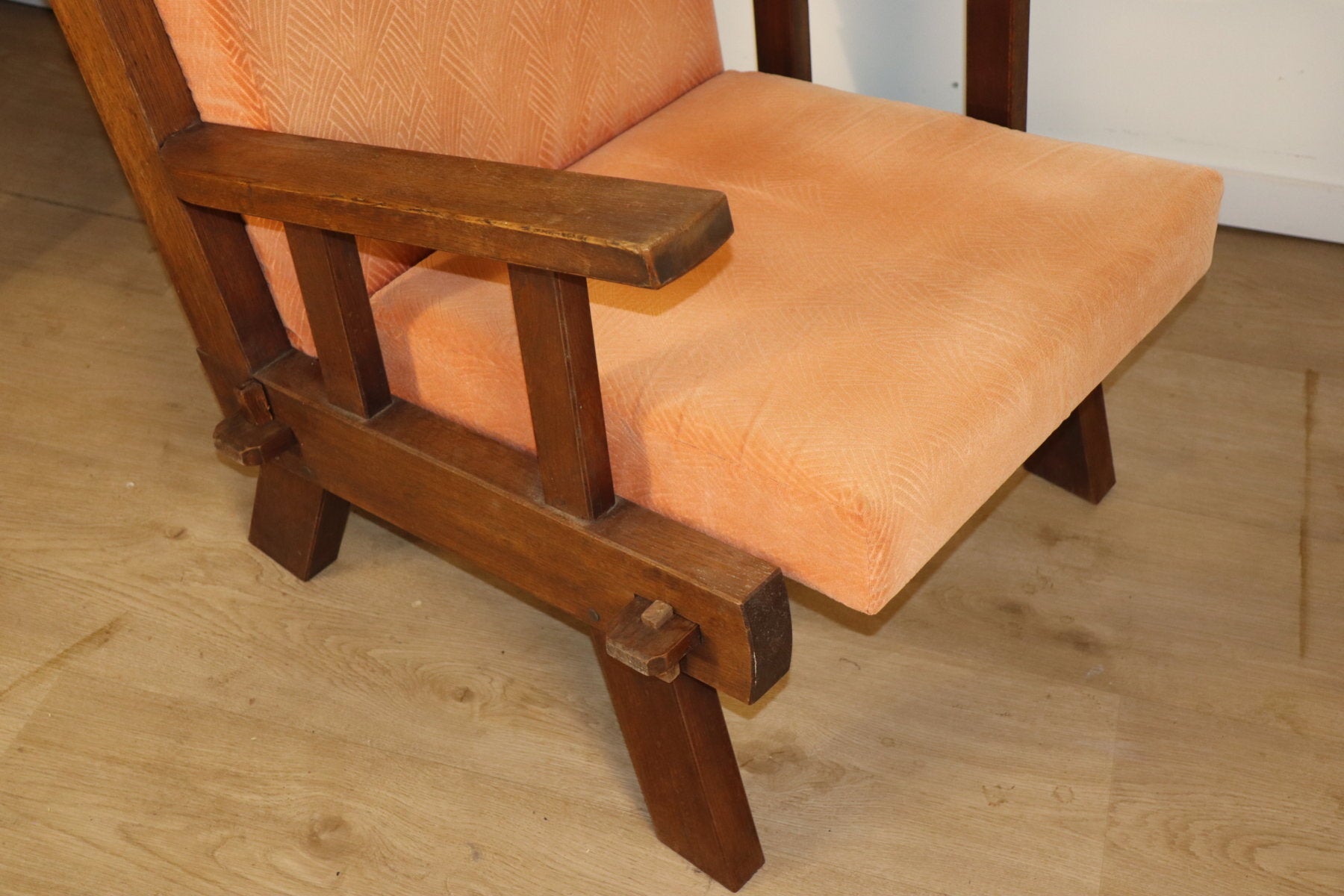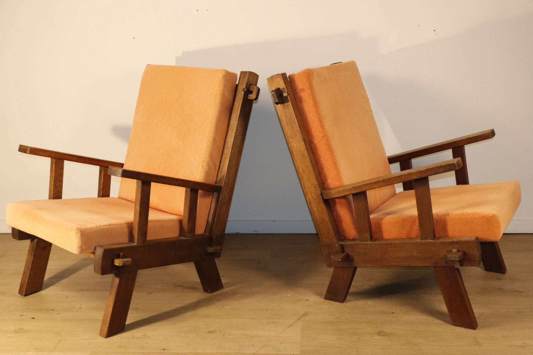 Les assises et dossiers sont garnis d’un velours épais couleur pêche/orangé, apportant une touche chaleureuse et un contraste élégant avec la rigueur du bois.