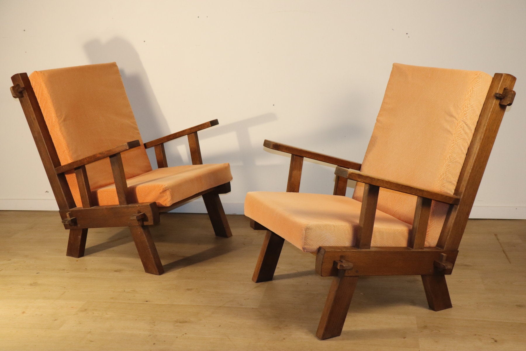 Paire de fauteuils brutalistes en chêne et velours – années 60/70