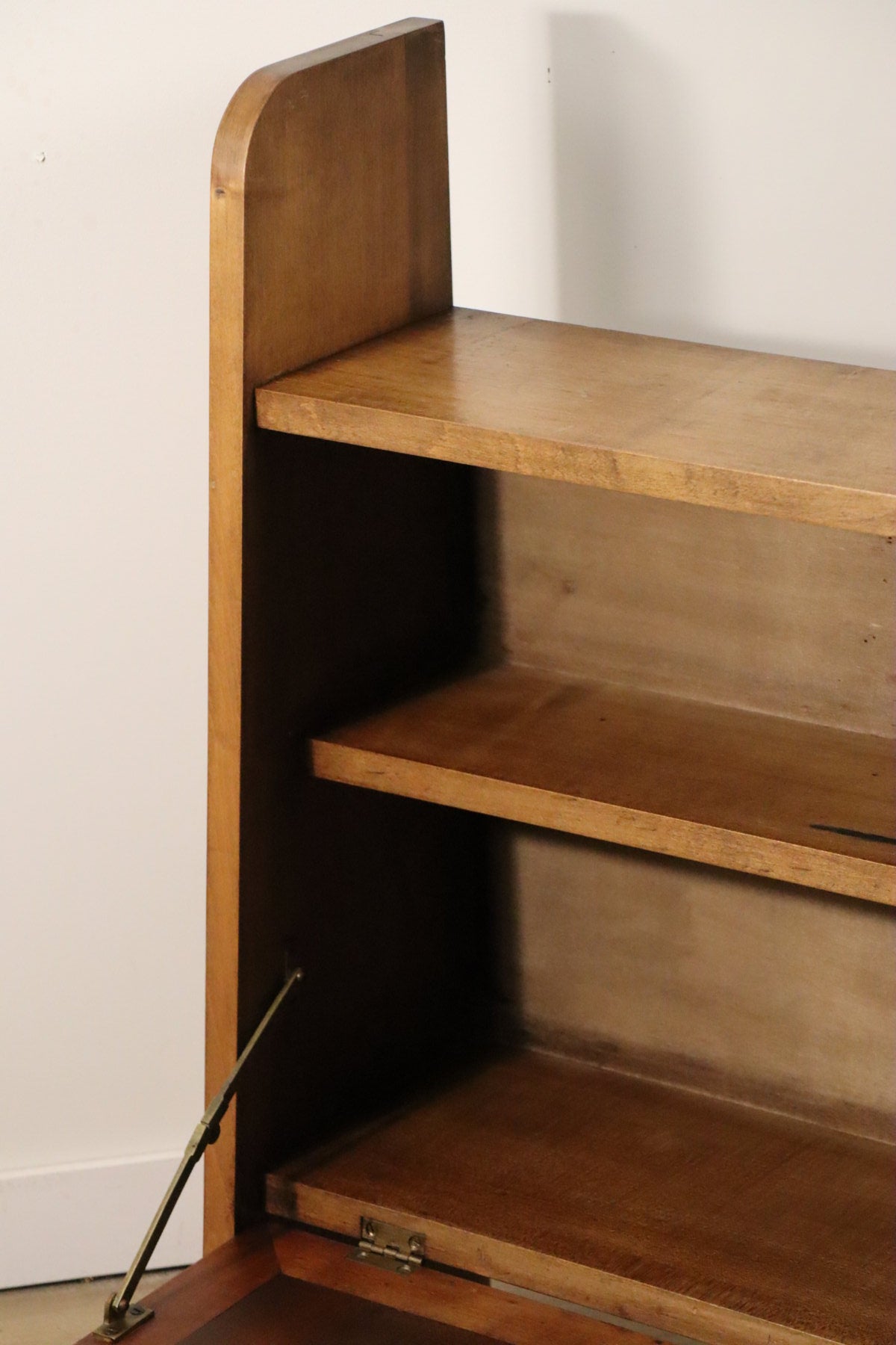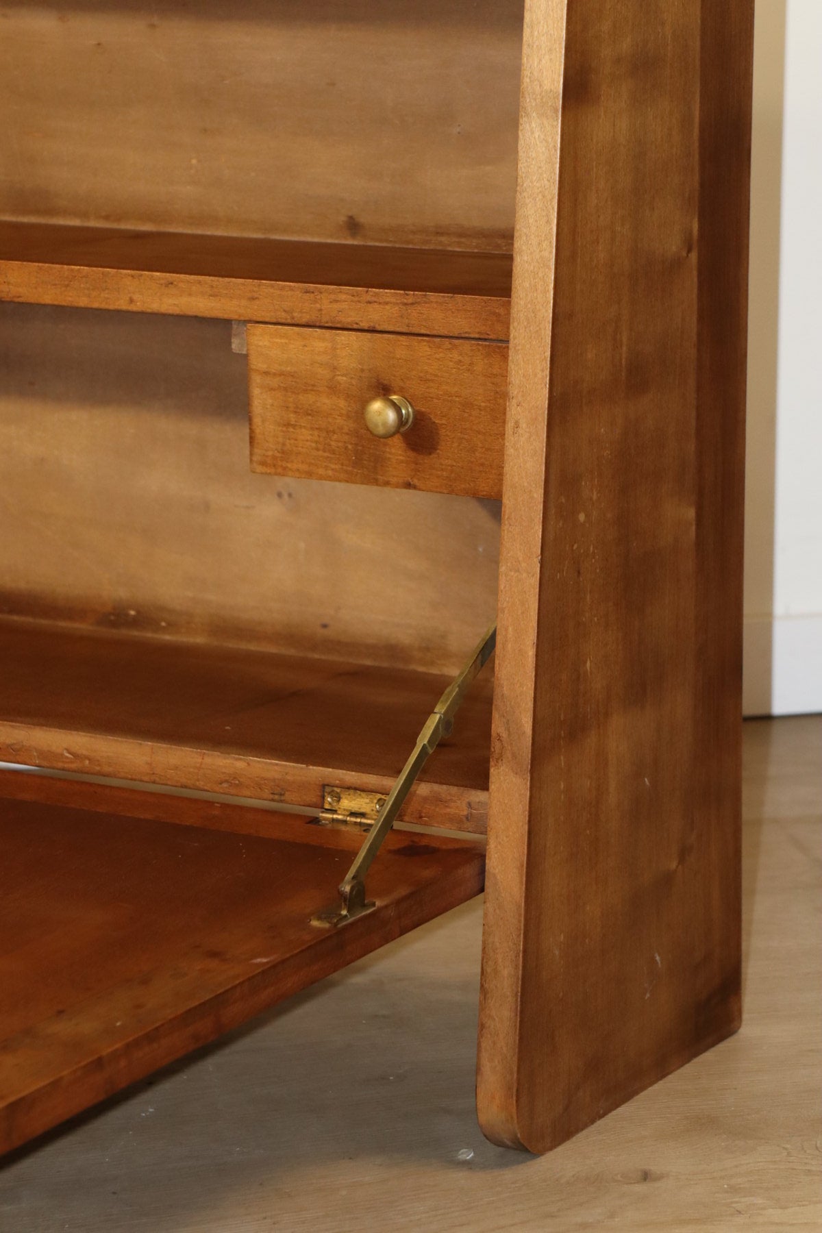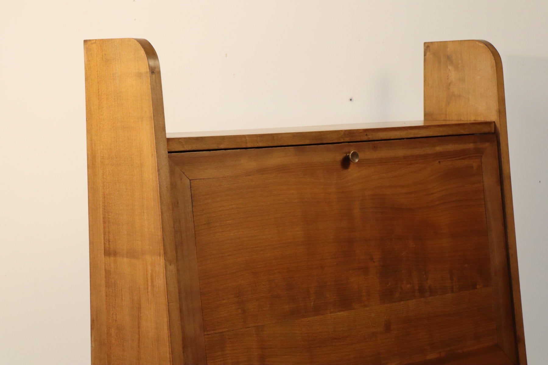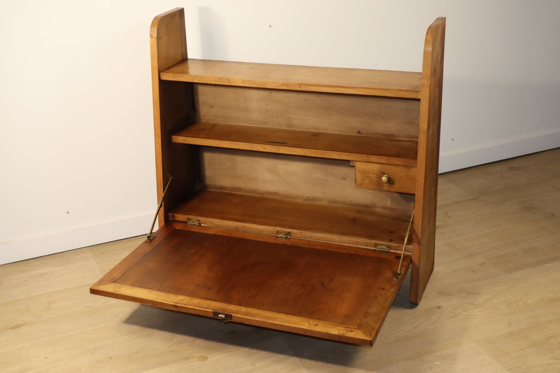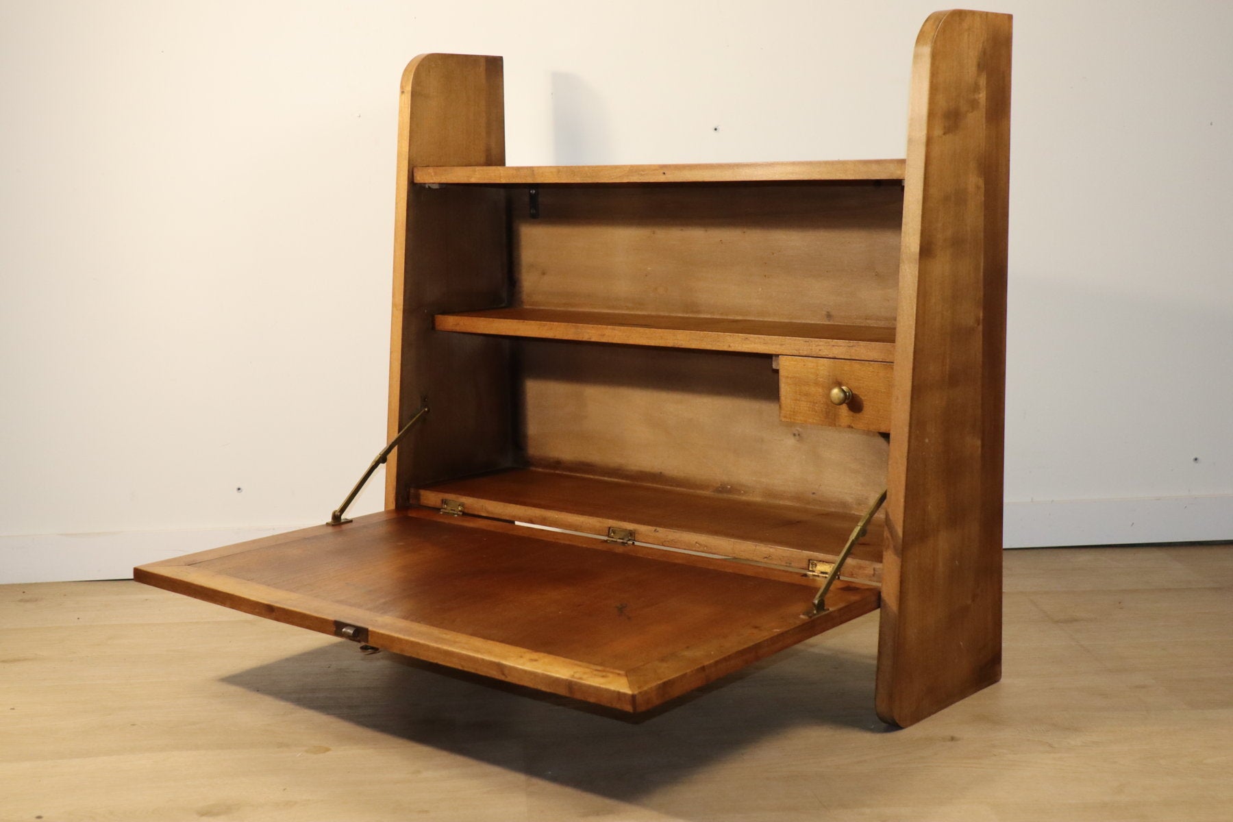 Secrétaire mural vintage en bois datant des années 50. Une ligne élégante et épurée avec sa porte à battant donnant un bel espace de rangement et de travail.