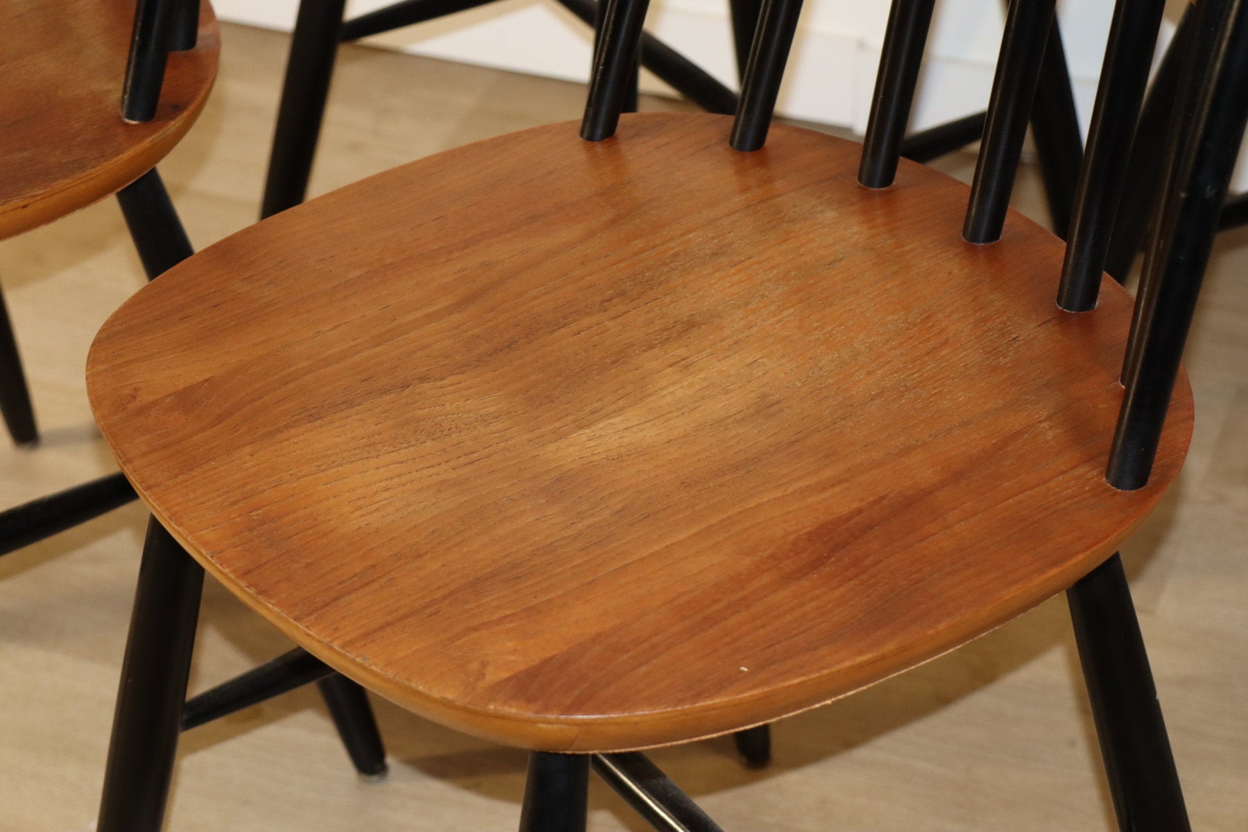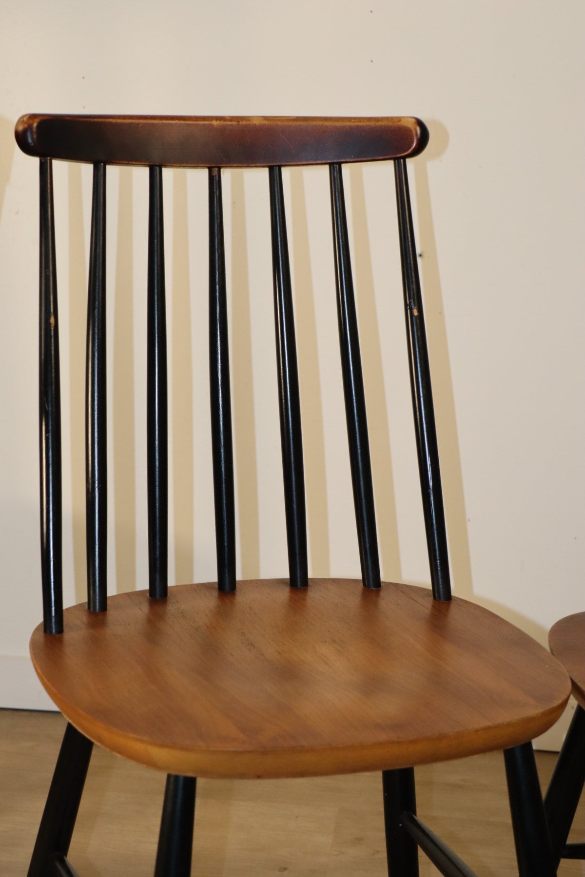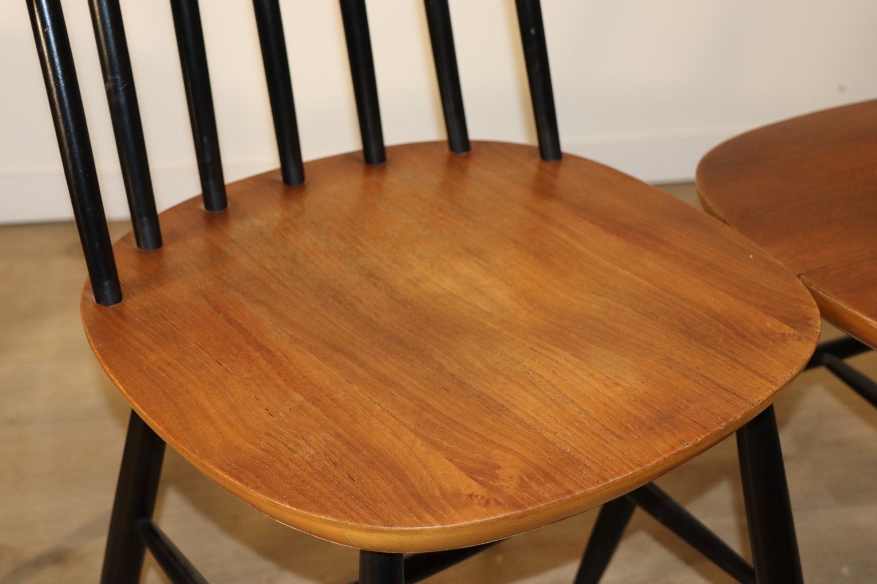 Modèle en hêtre massif avec dossier à barreaux et piètement laqué noir d'origine.