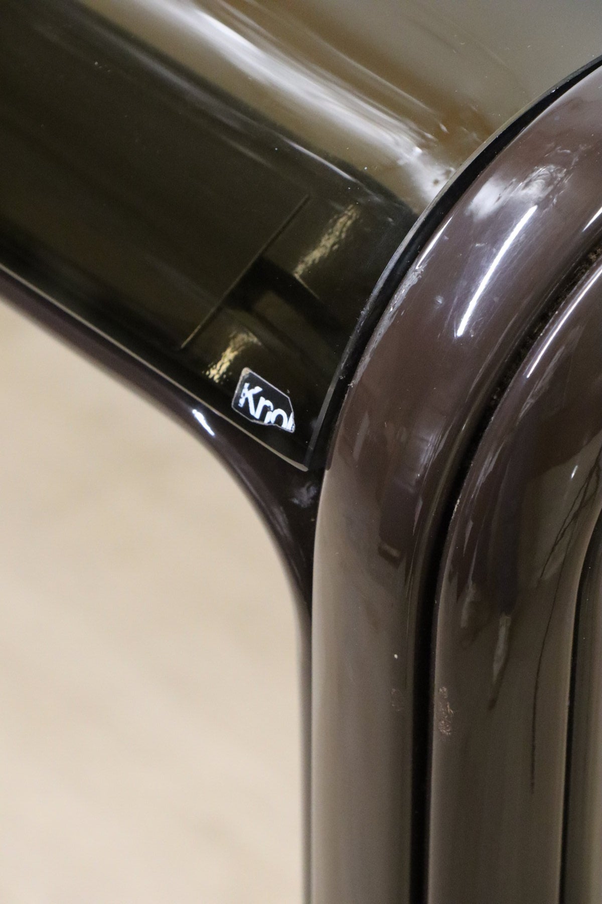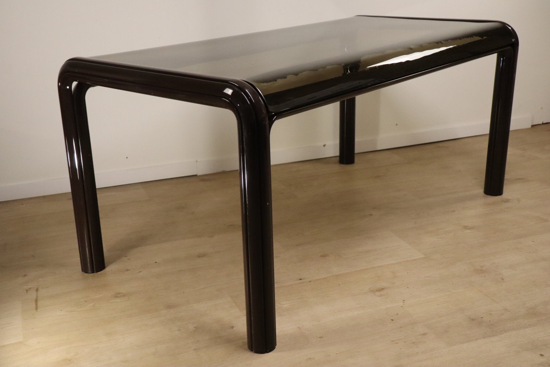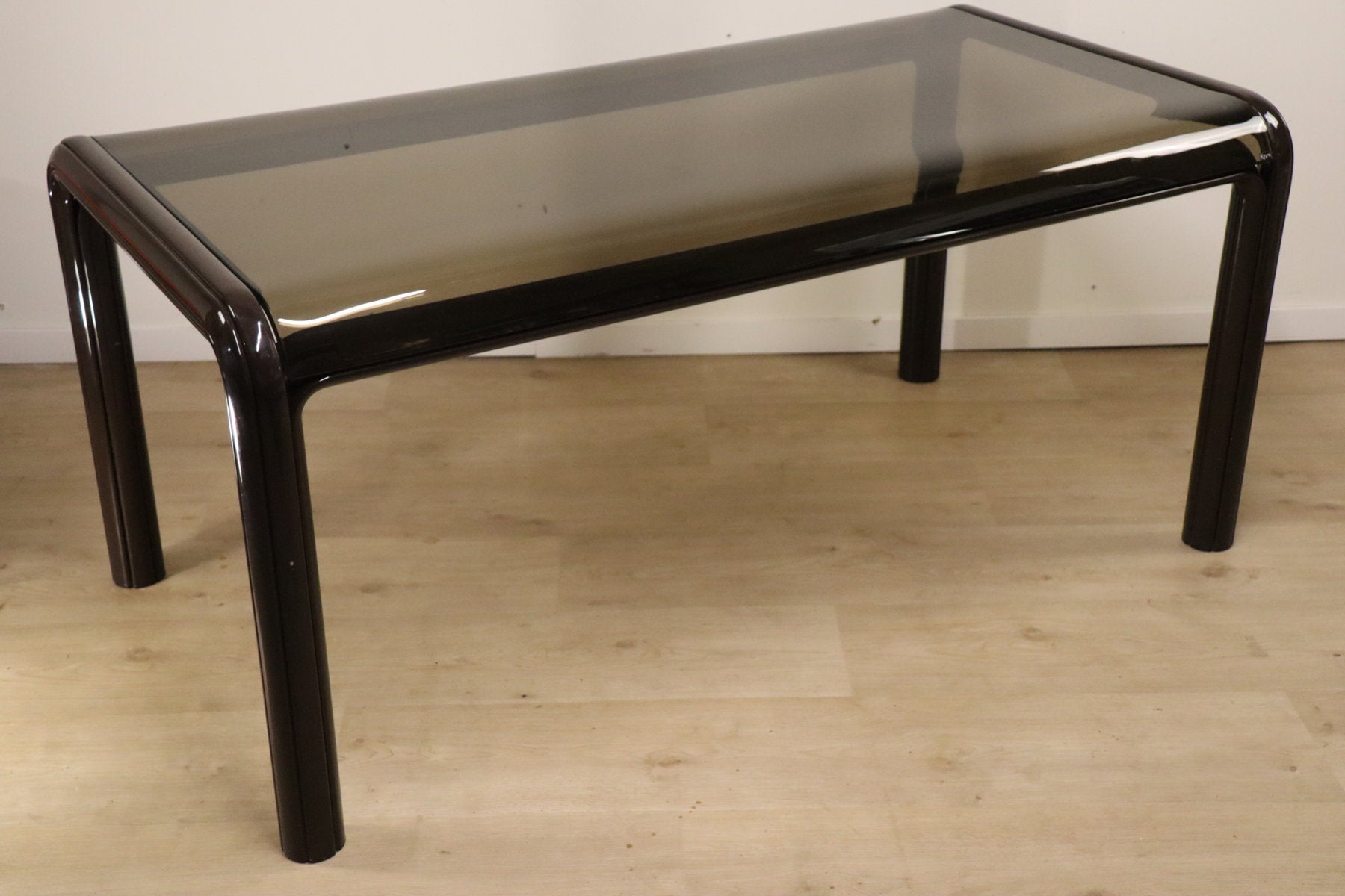 On adore sa silhouette futuriste, toute en courbes arrondies et son élégant plateau en verre fumé qui laisse deviner la belle structure tubulaire en métal laqué.