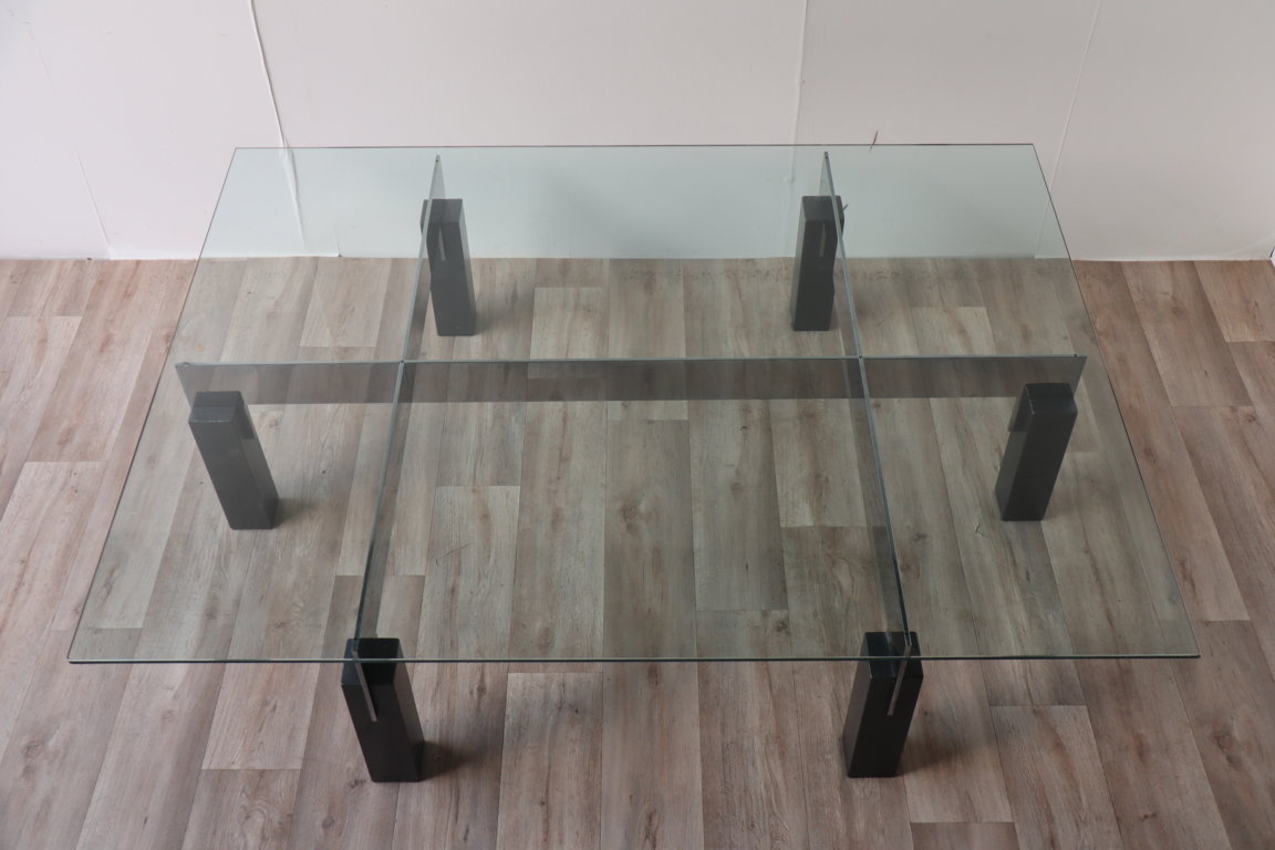 Un travail d'une belle qualité. La structure composé de 3 traverses emboitables en acier chromé. Piètement à base carré en métal. Plateau en verre trempé transparent.