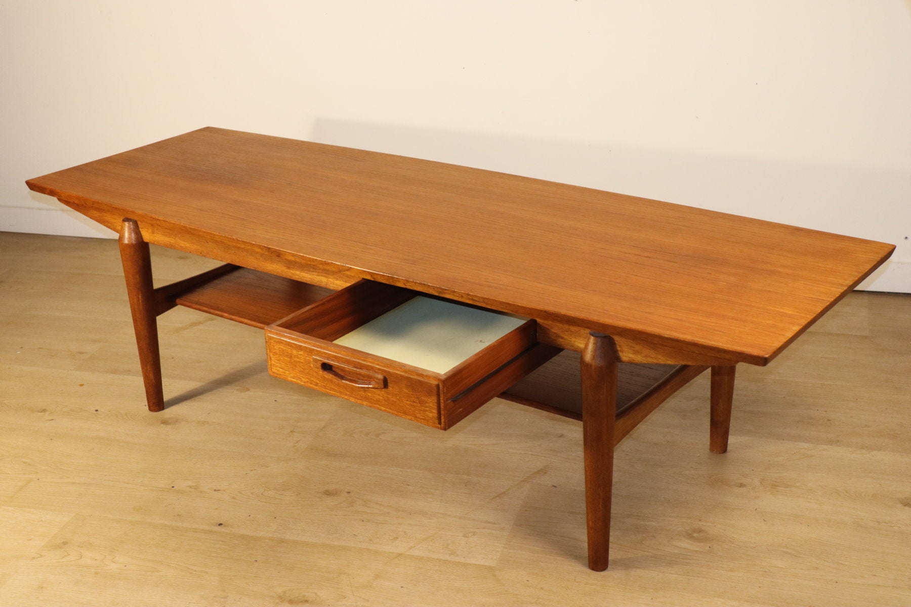 Le teck présente un beau veinage chaleureux et une patine homogène. En bon état, voir photos.