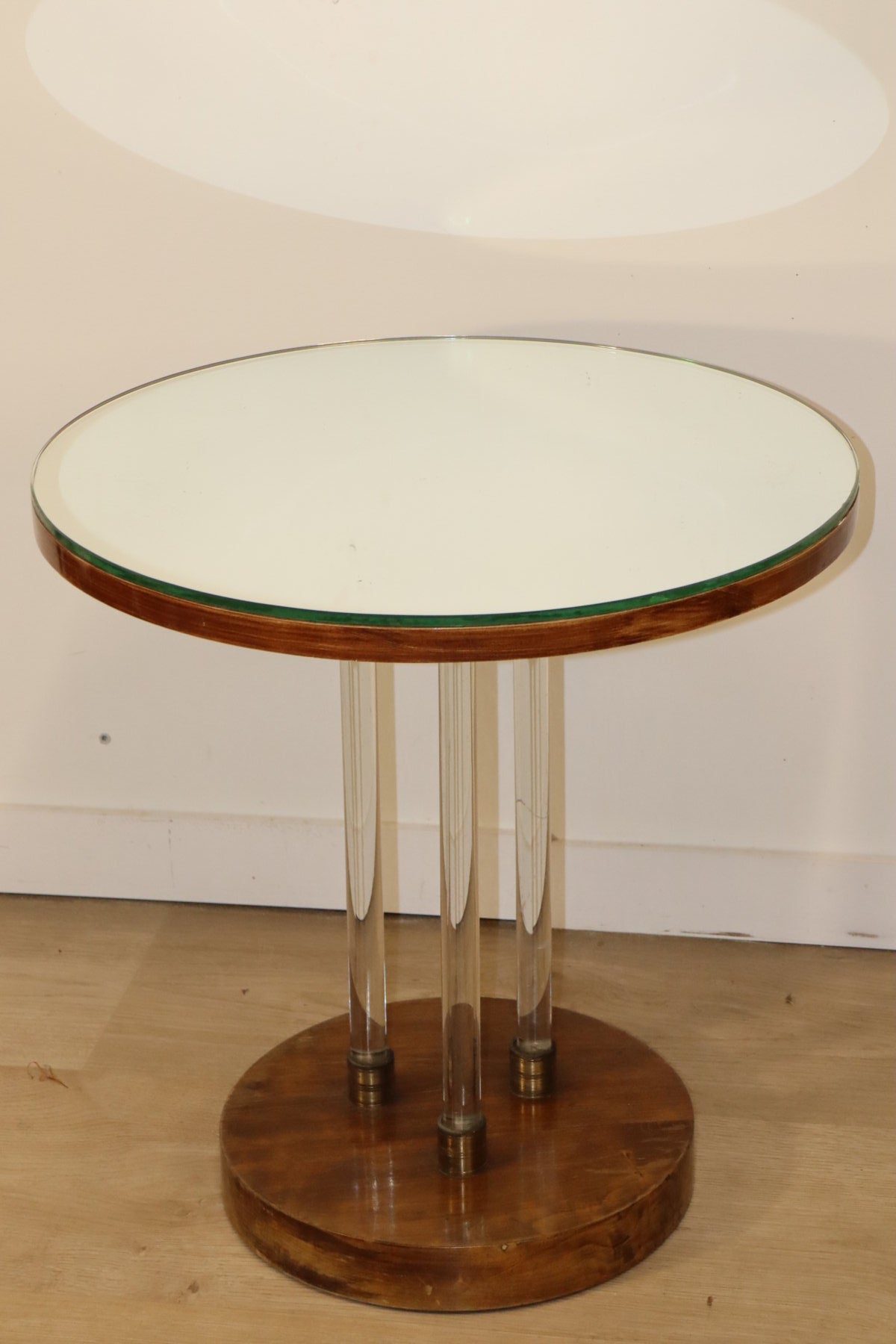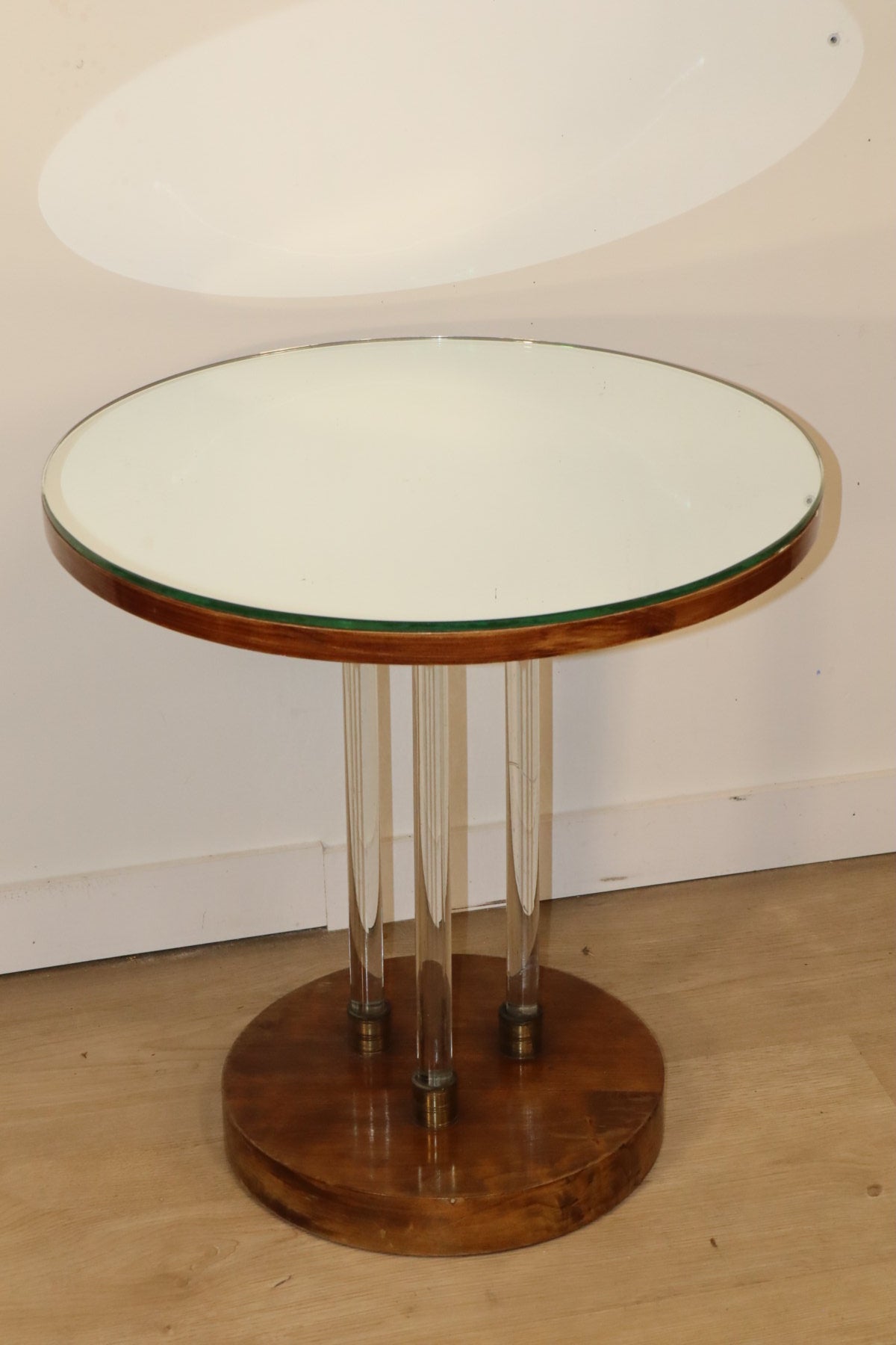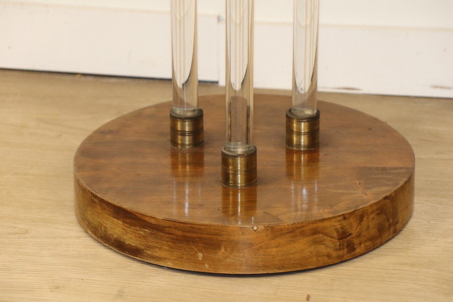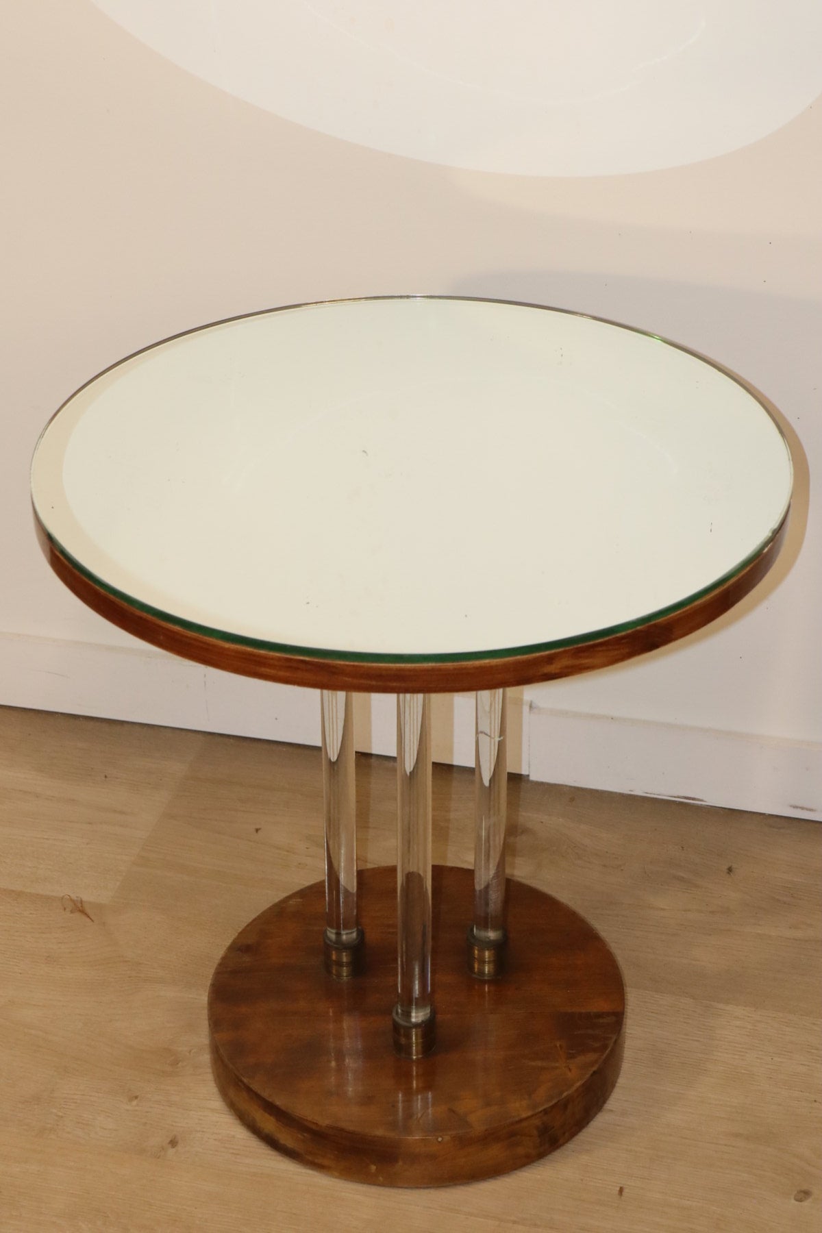 Son plateau circulaire en verre effet miroir, repose sur une base ronde en bois soutenue par trois colonnes en verre verre transparent à embouts en laiton doré sur une base en noyer.