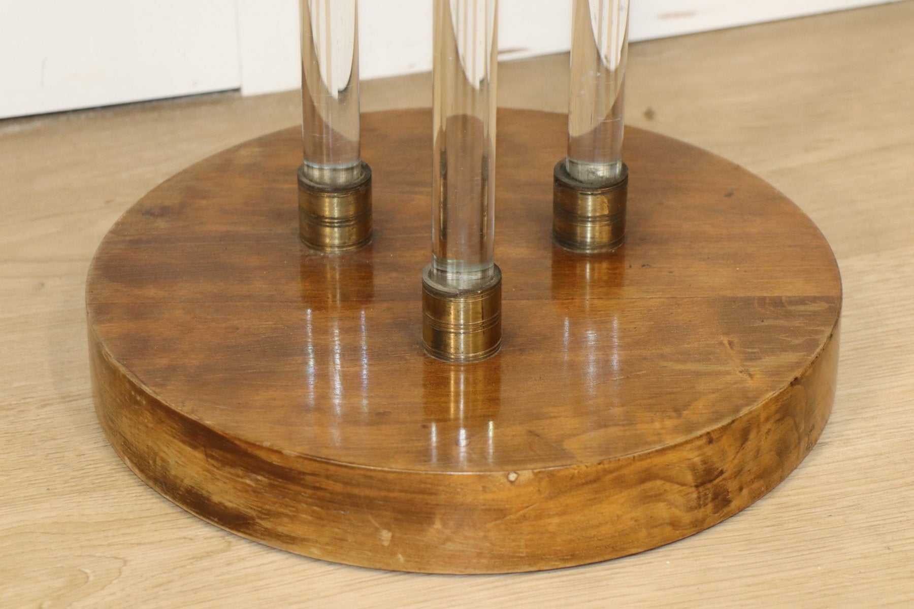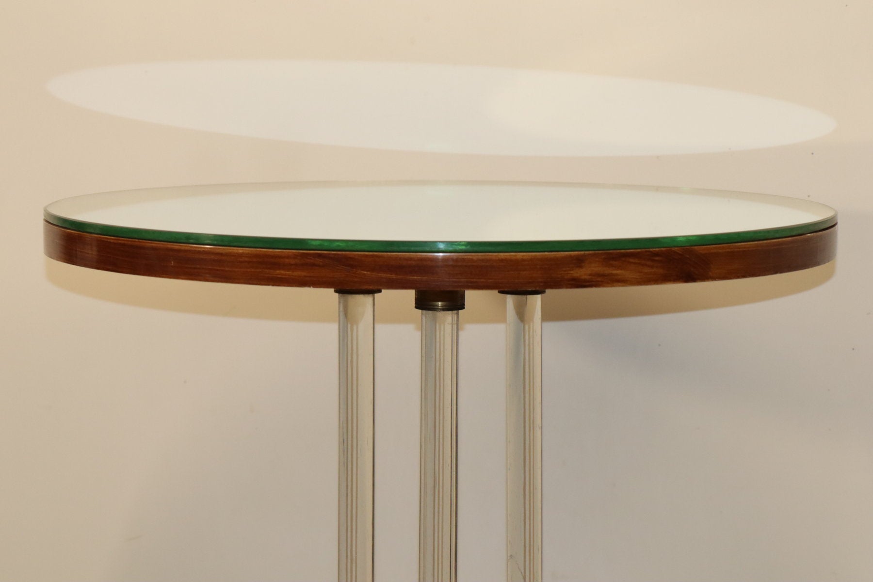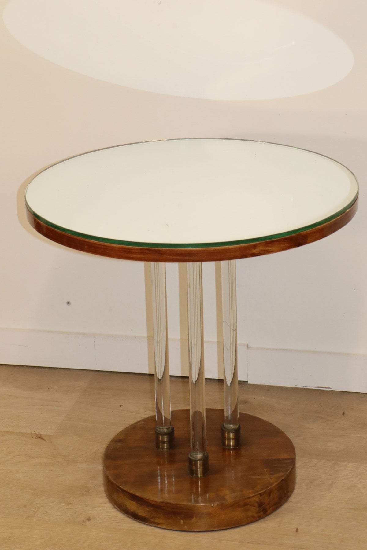 Son plateau circulaire en verre effet miroir, repose sur une base ronde en bois soutenue par trois colonnes en verre verre transparent à embouts en laiton doré sur une base en noyer.