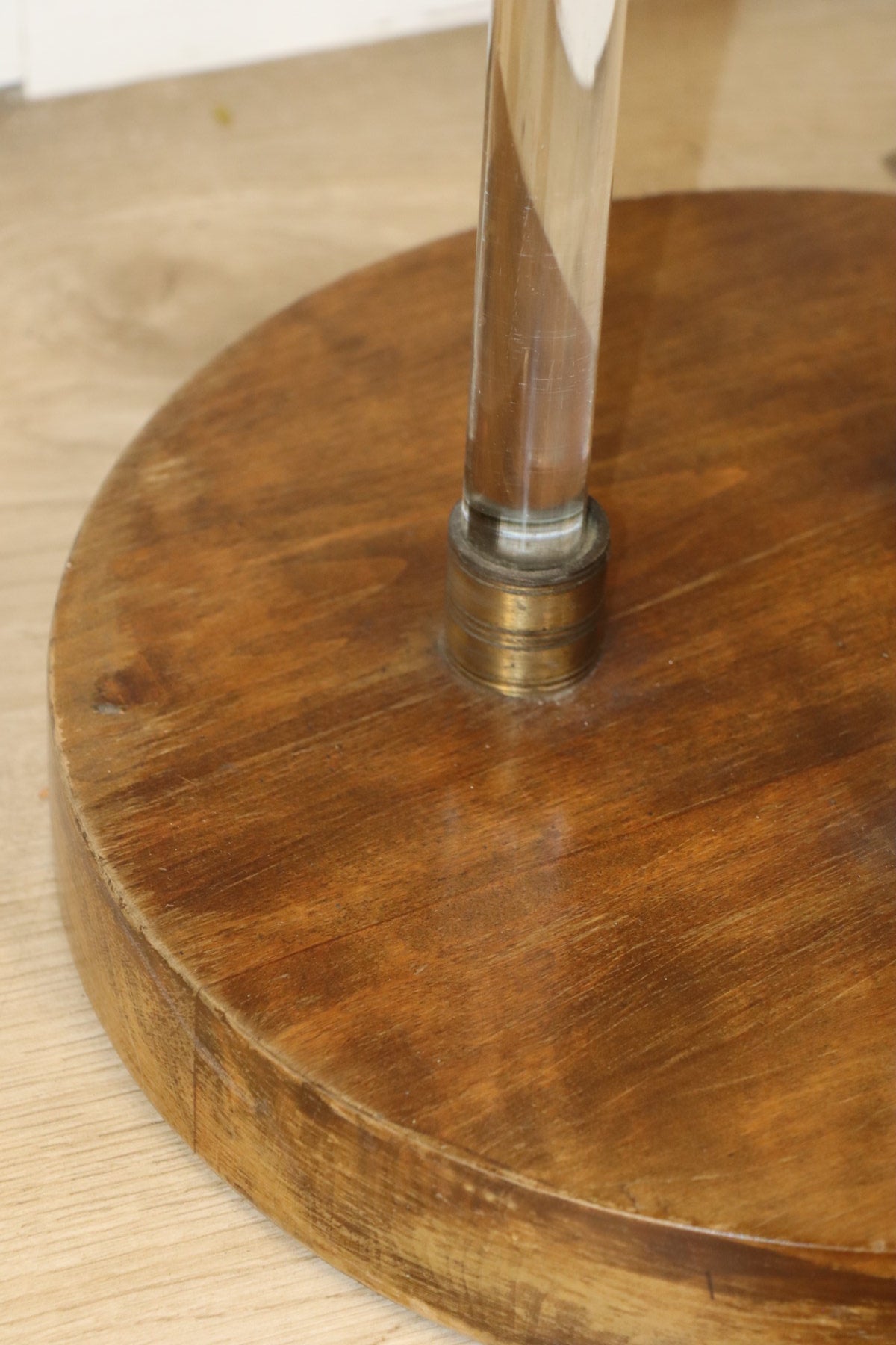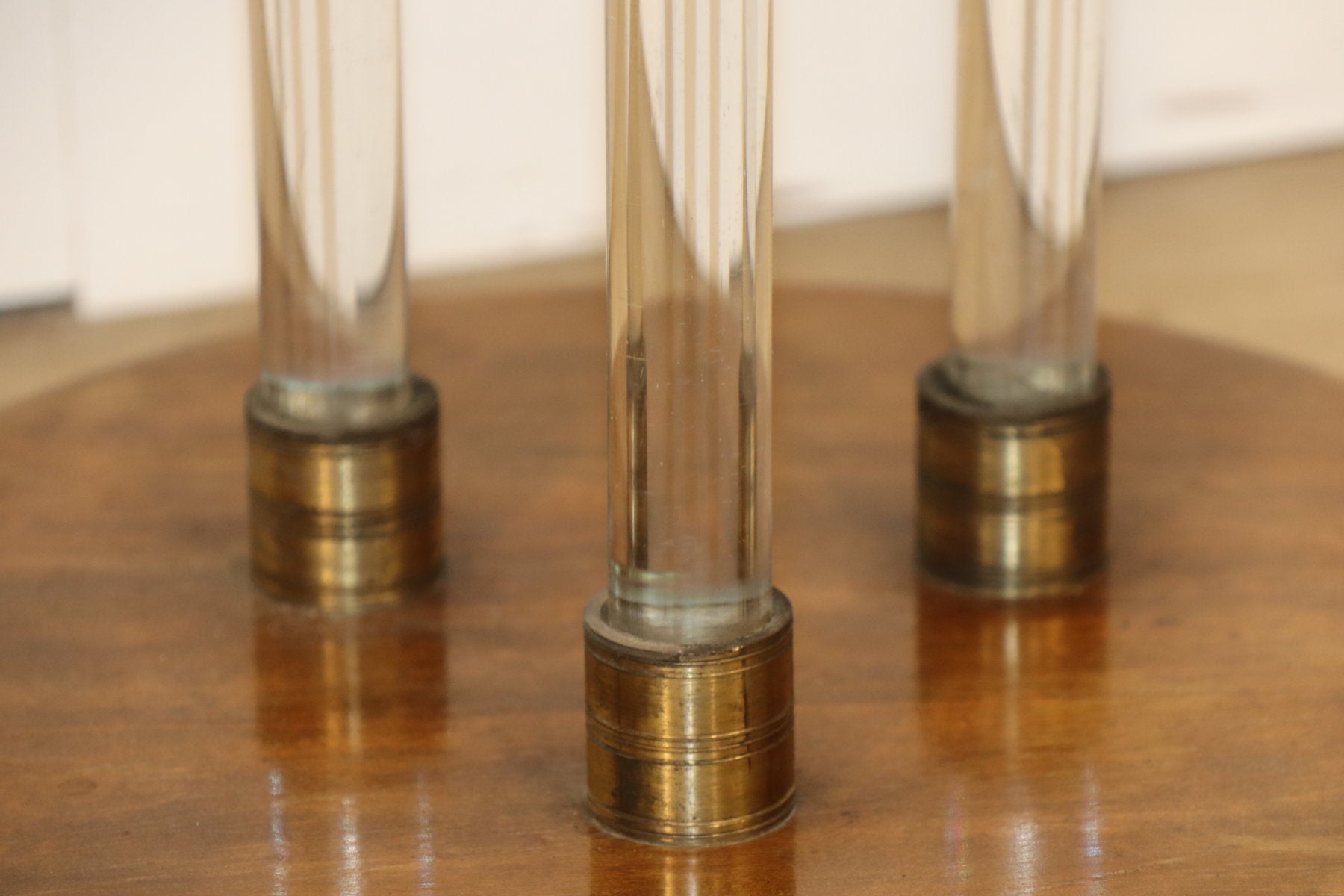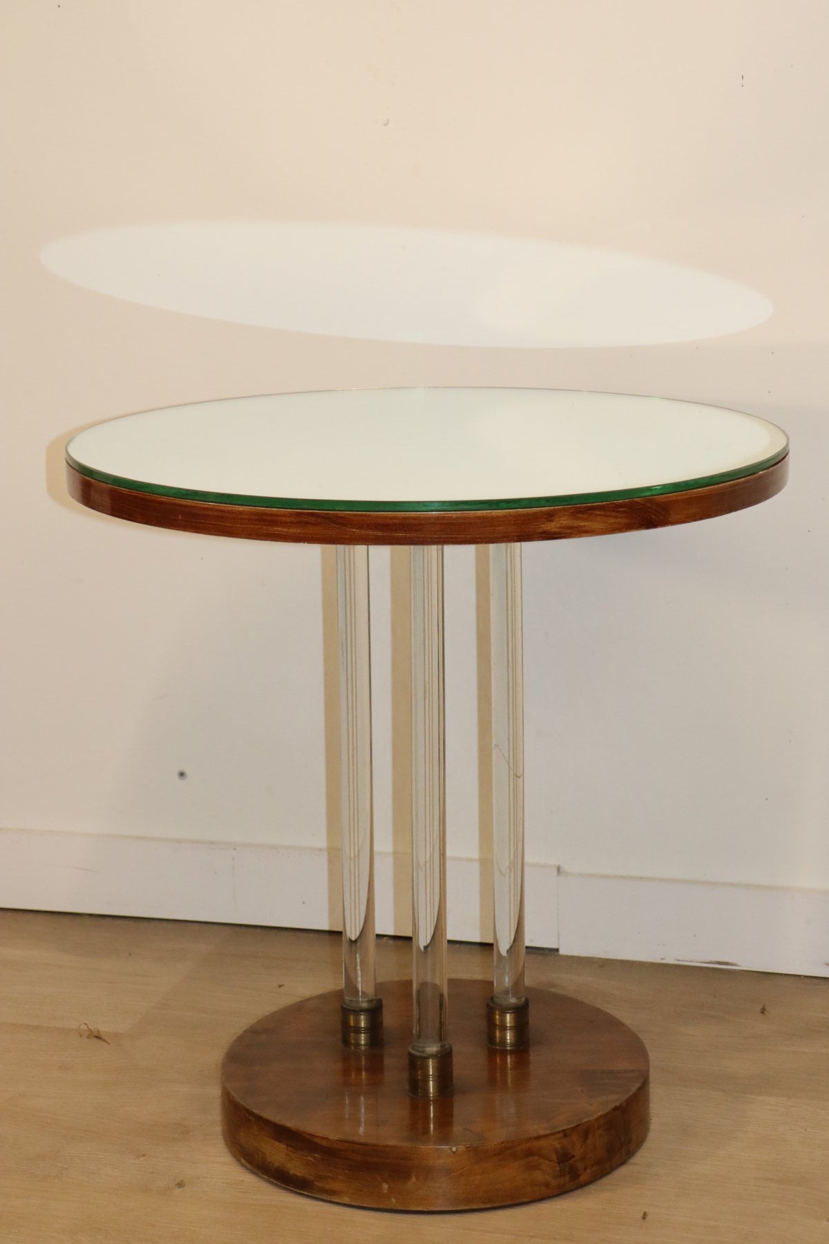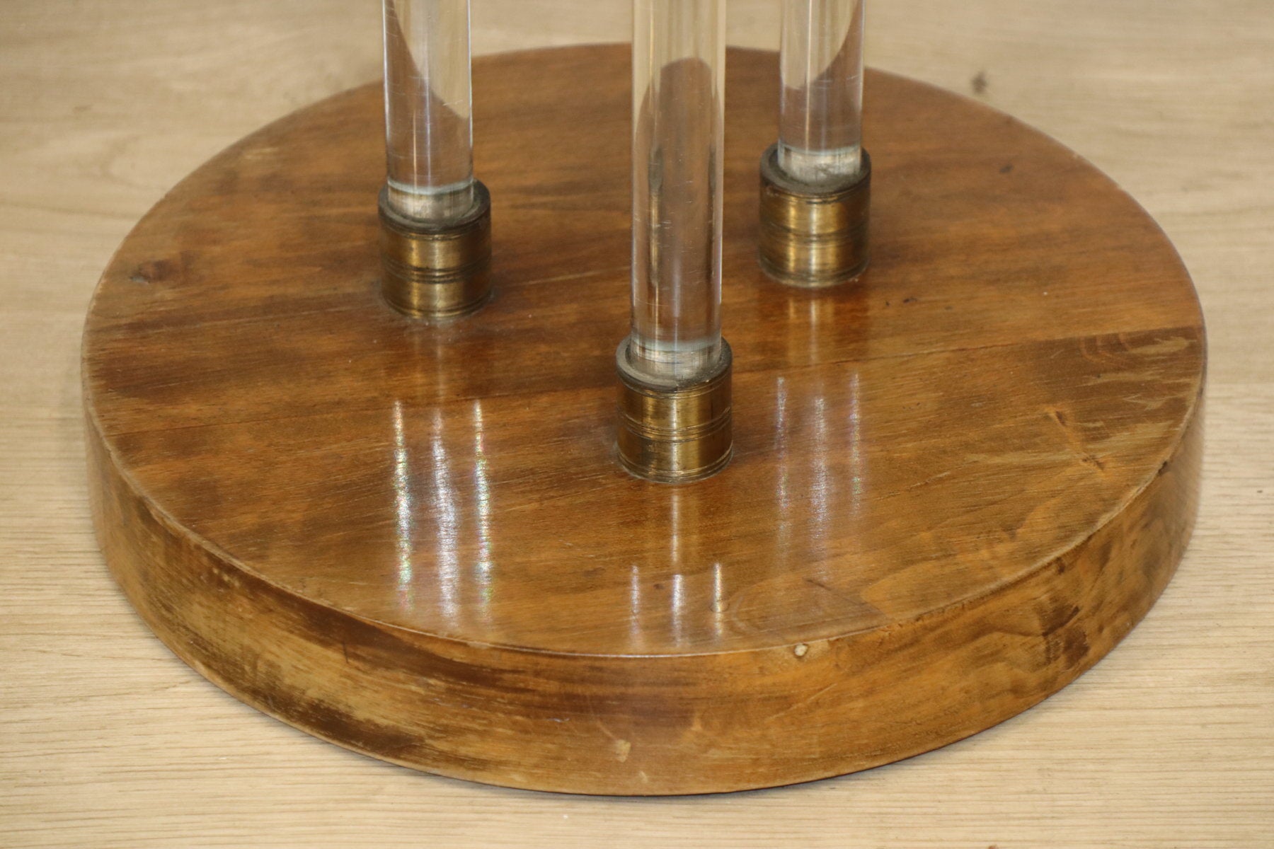 Son plateau circulaire en verre effet miroir, repose sur une base ronde en bois soutenue par trois colonnes en verre verre transparent à embouts en laiton doré sur une base en noyer.