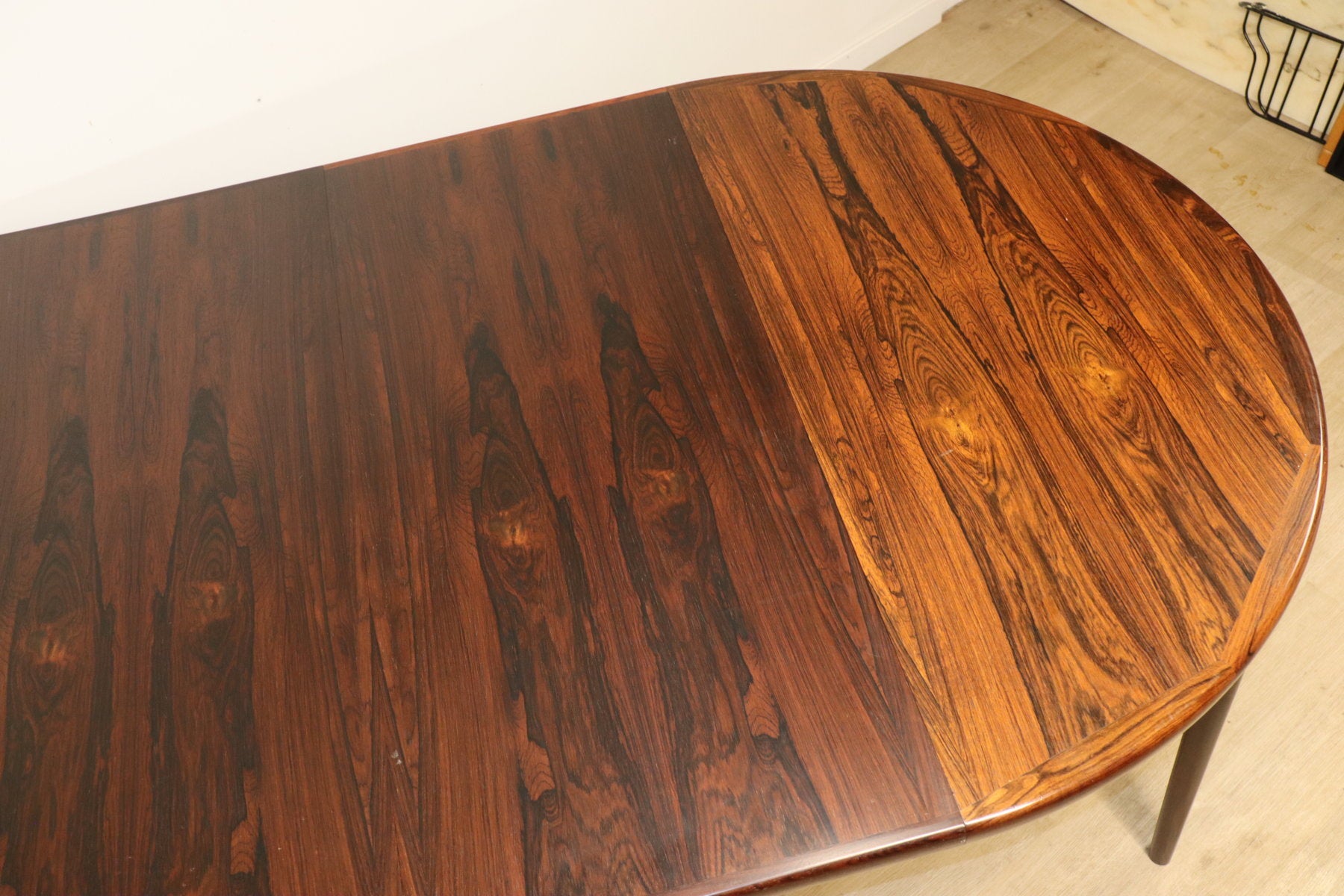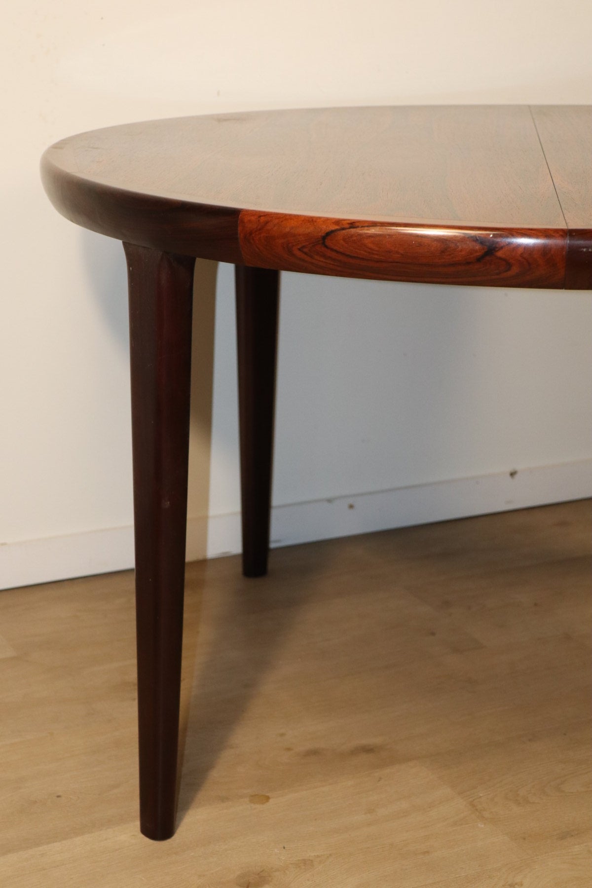 Élégante table de repas scandinave en palissandre éditée par V.V. Møbler. Son plateau aux lignes douces met en valeur un superbe veinage du bois, chaleureux et profond.